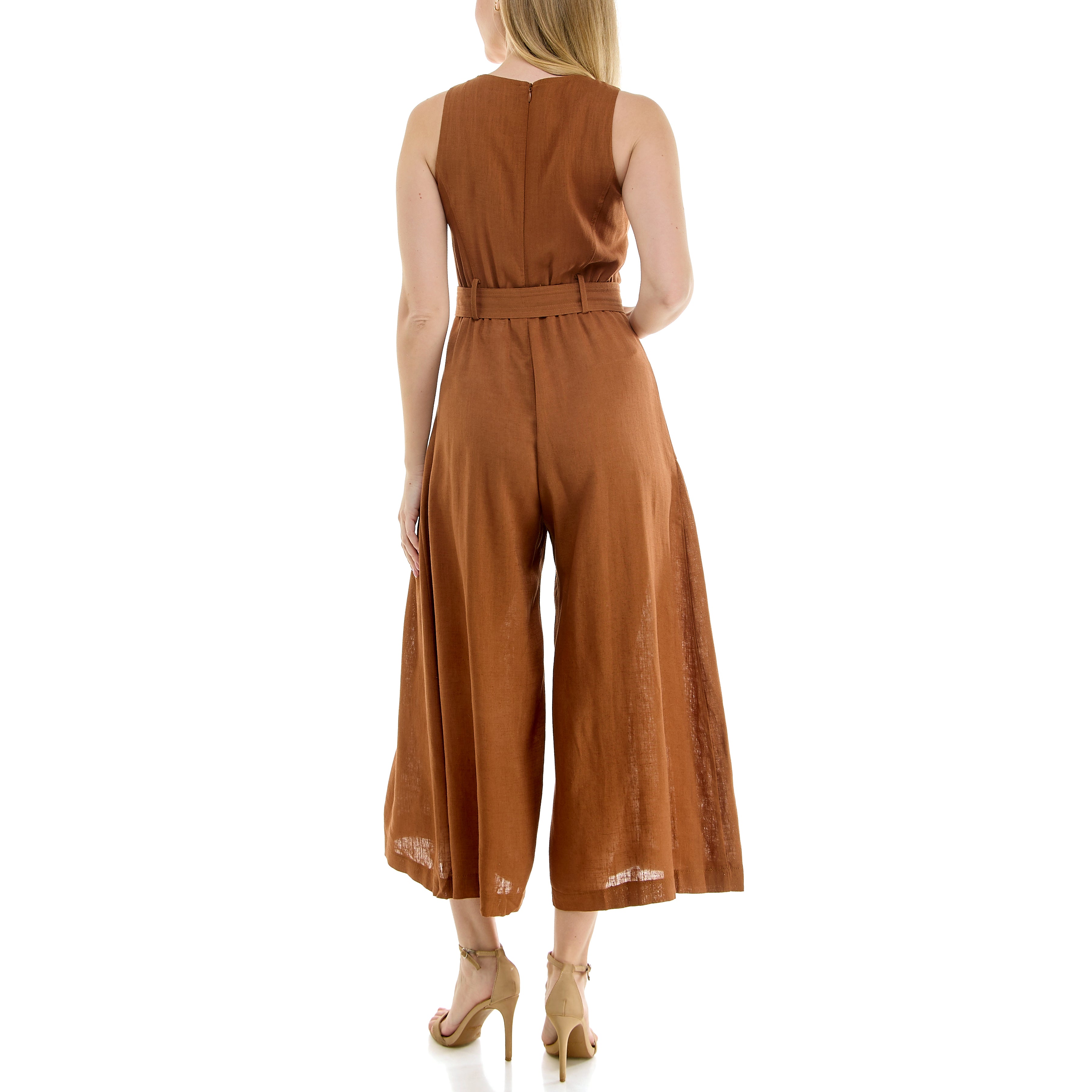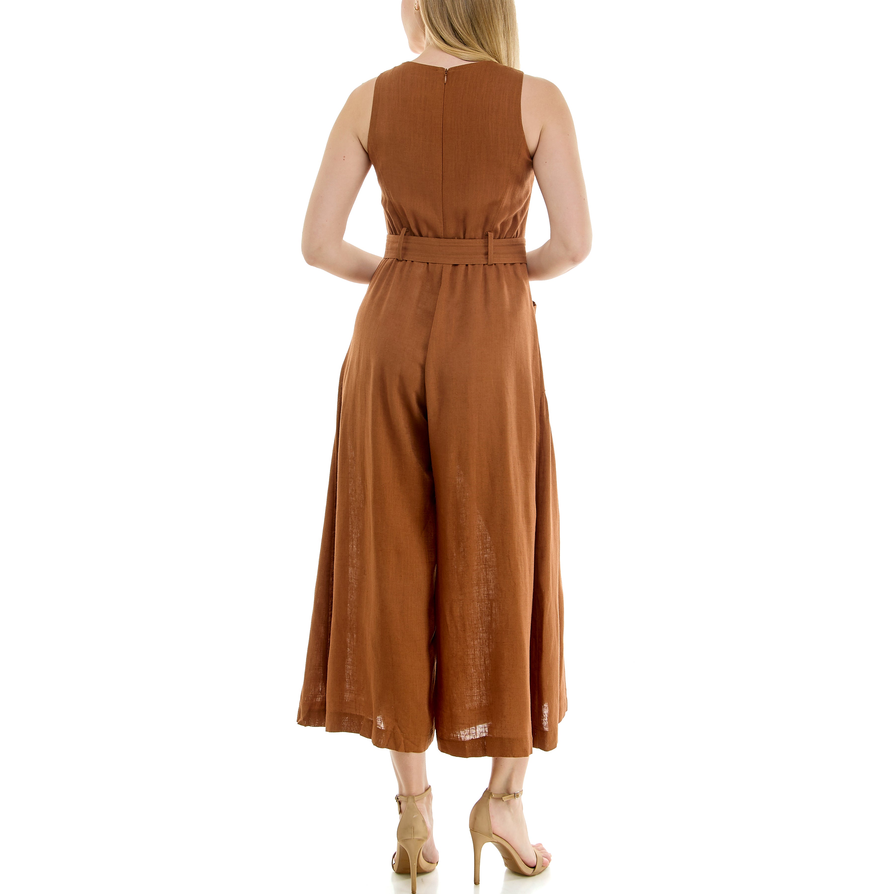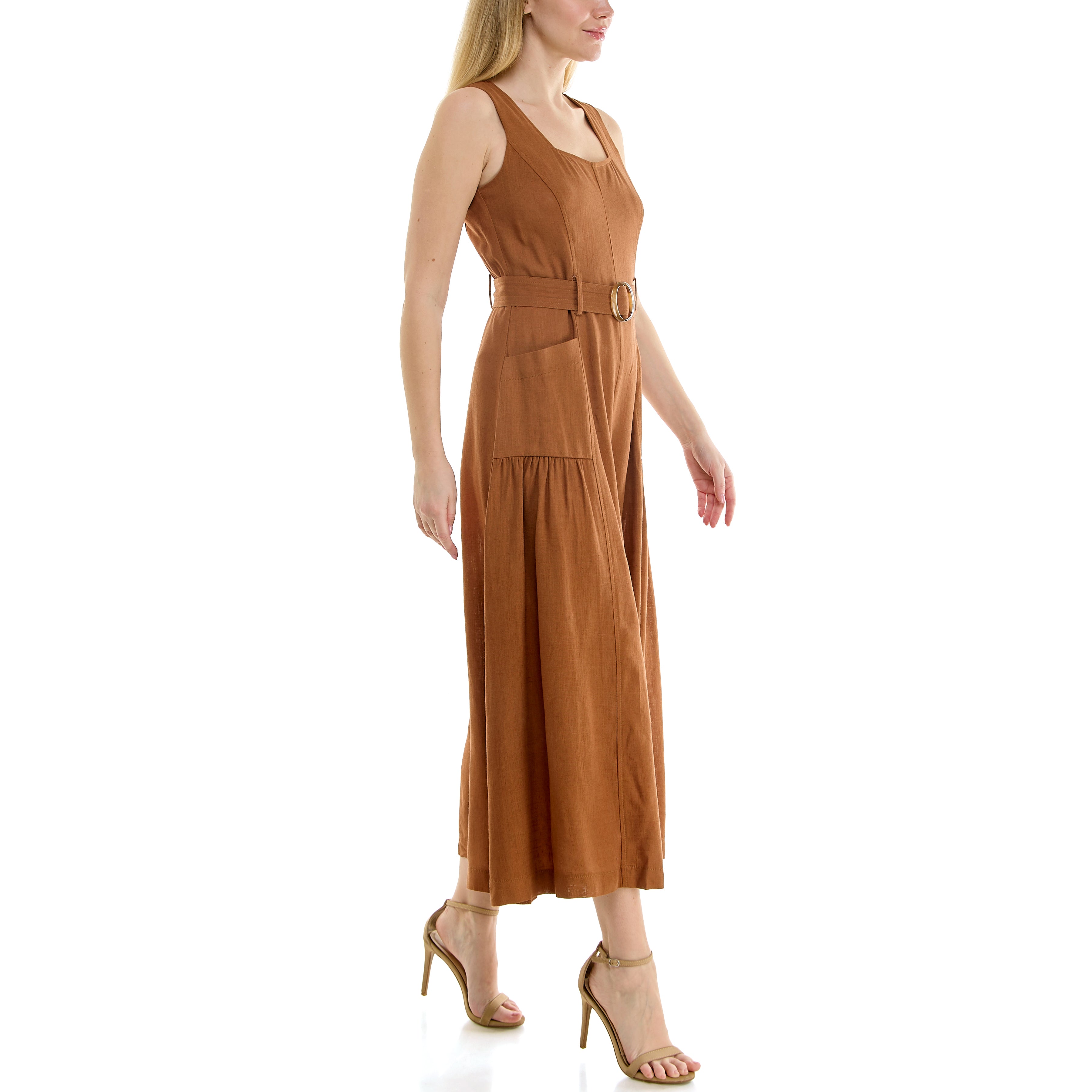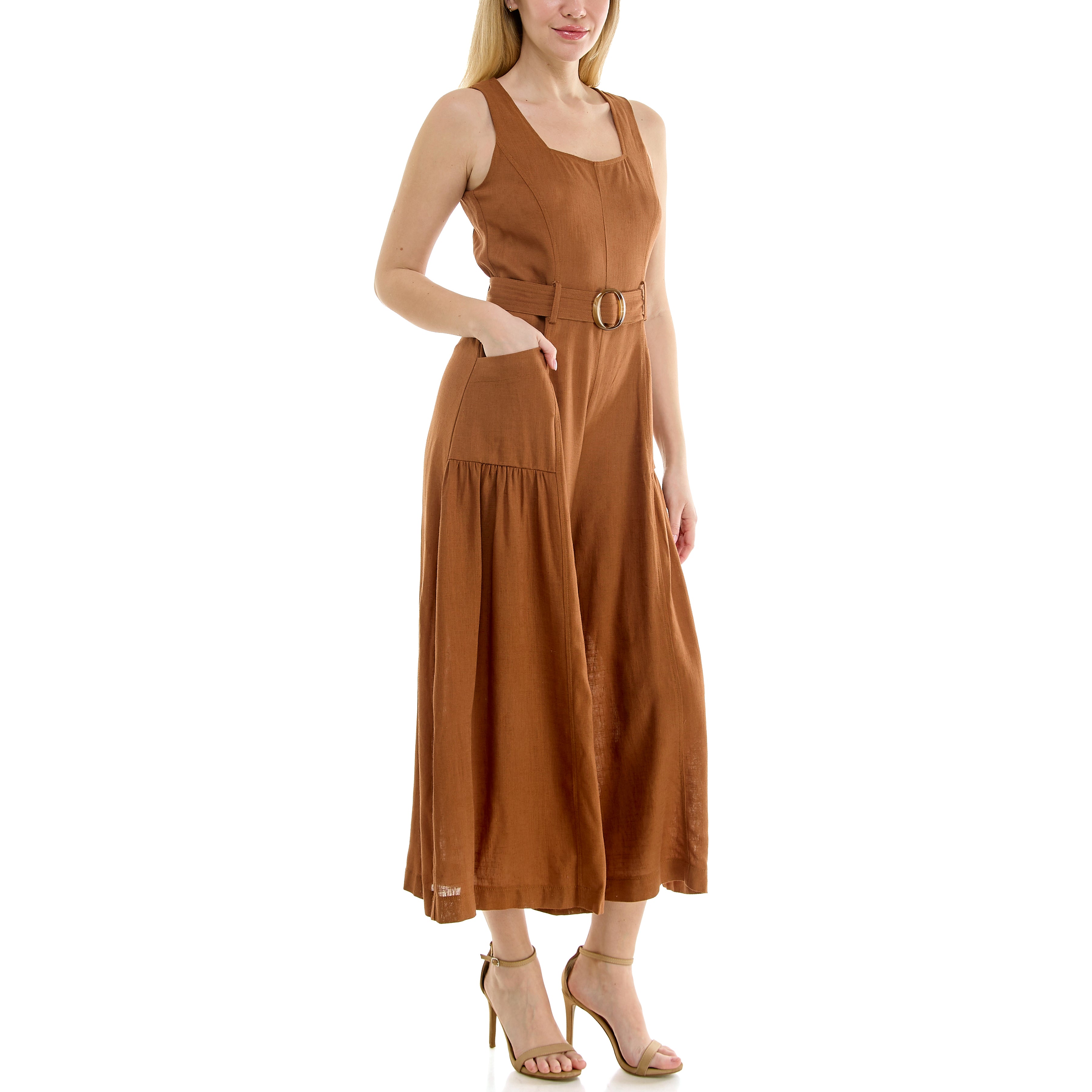 MAISON TARA SLEEVELESS SQUARE NECK BELTED LINEN JUMPSUIT WITH POCKETS