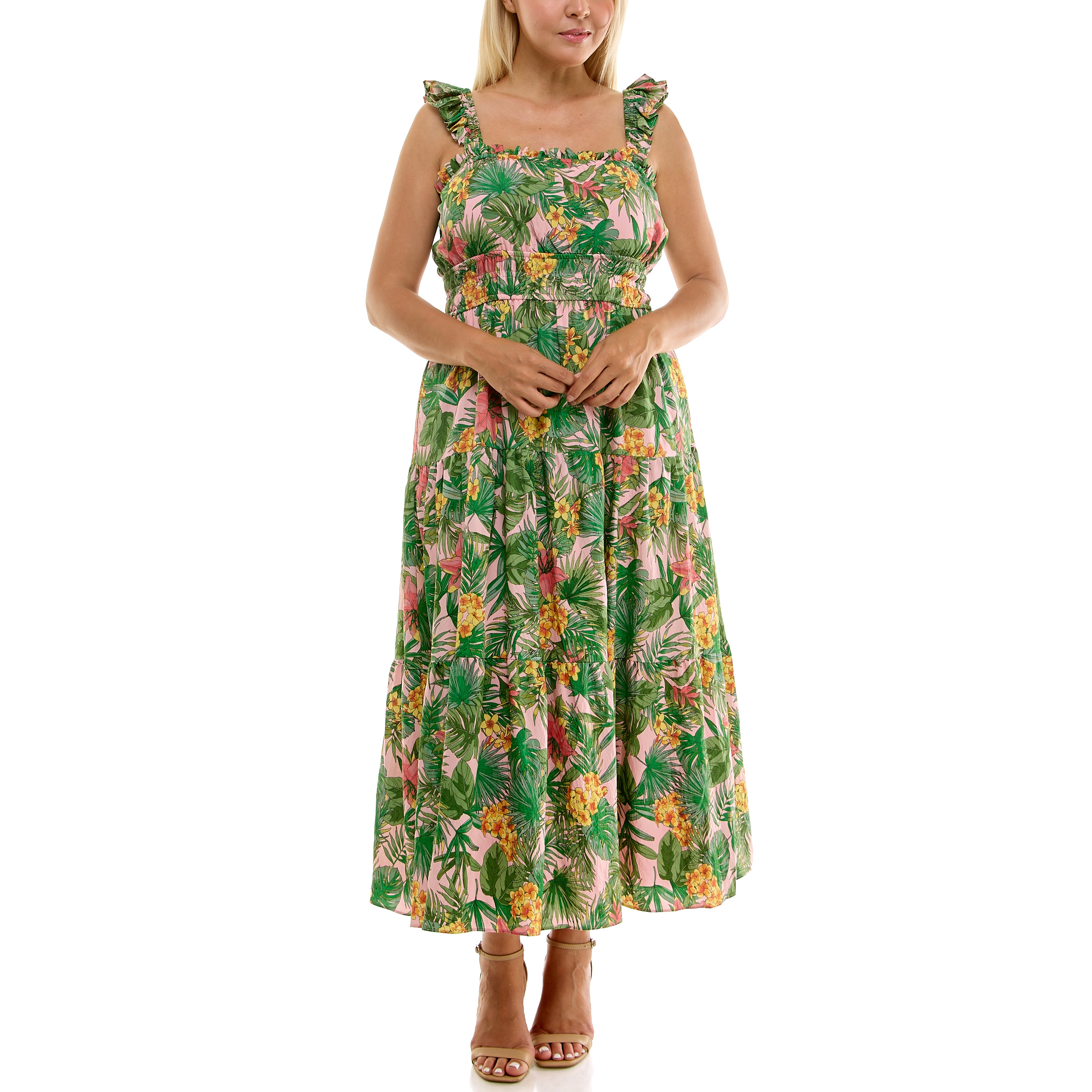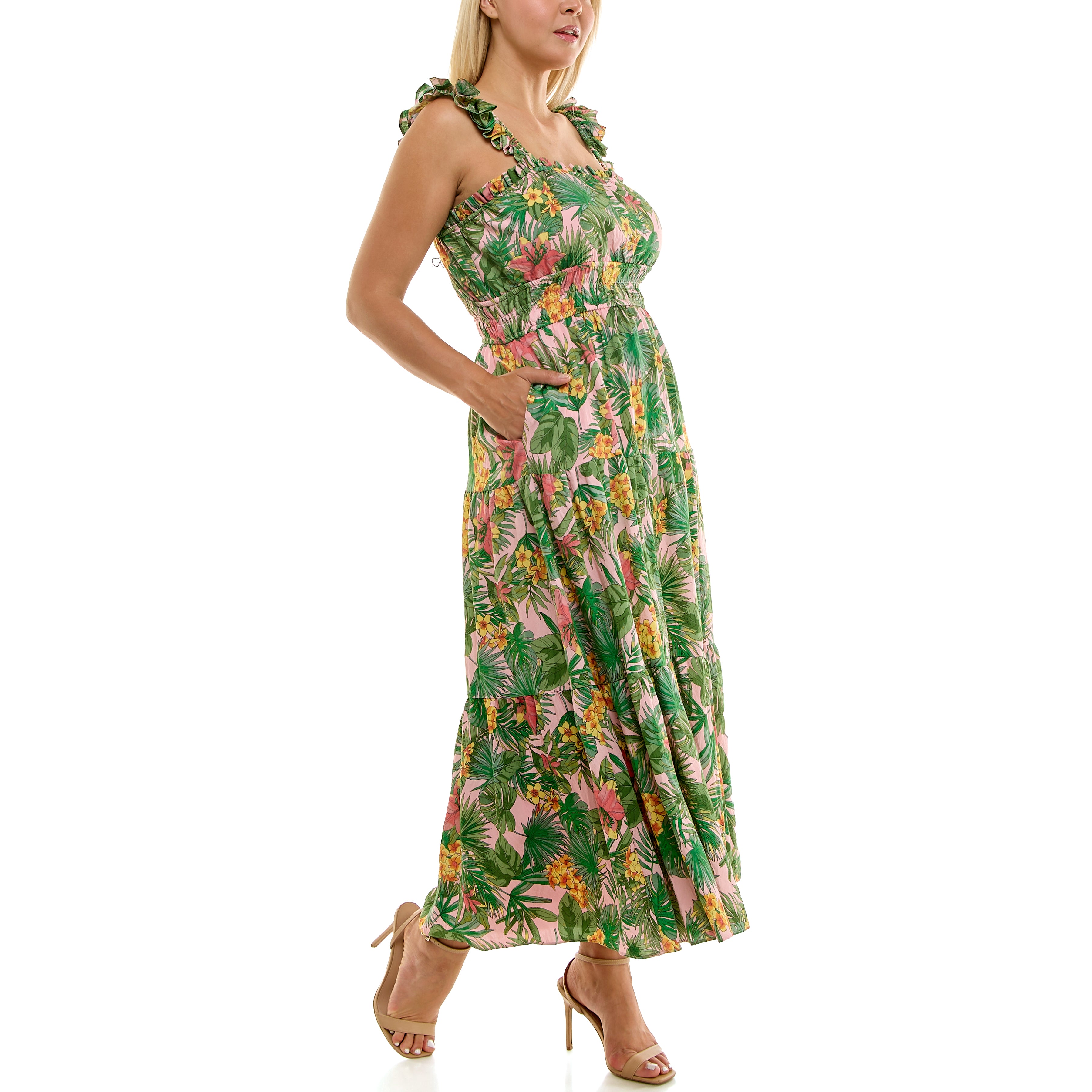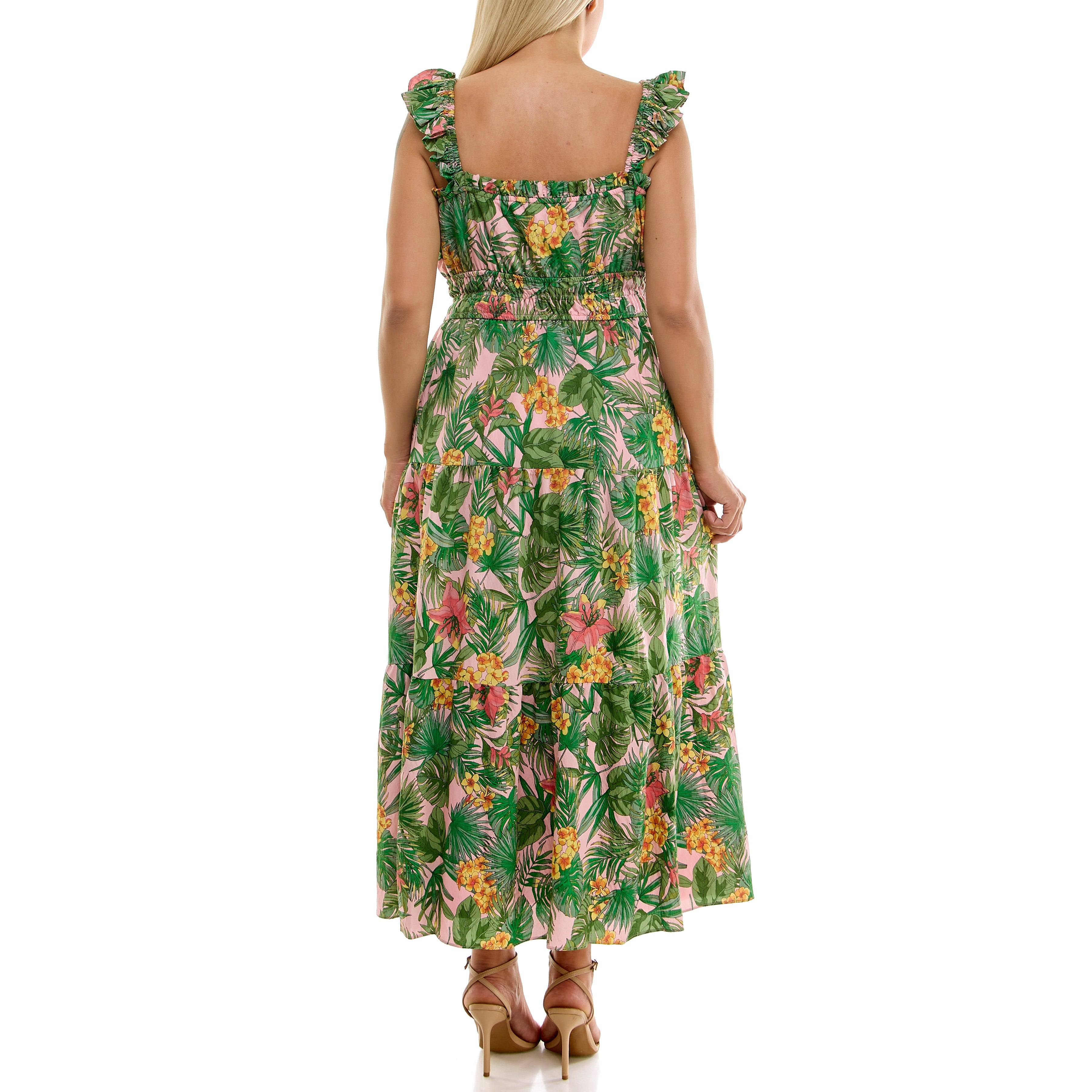MAISON TARA SLEEVELESS SMOCKED WAIST TROPICAL FLORAL PRINT CURVE MAXI DRESS