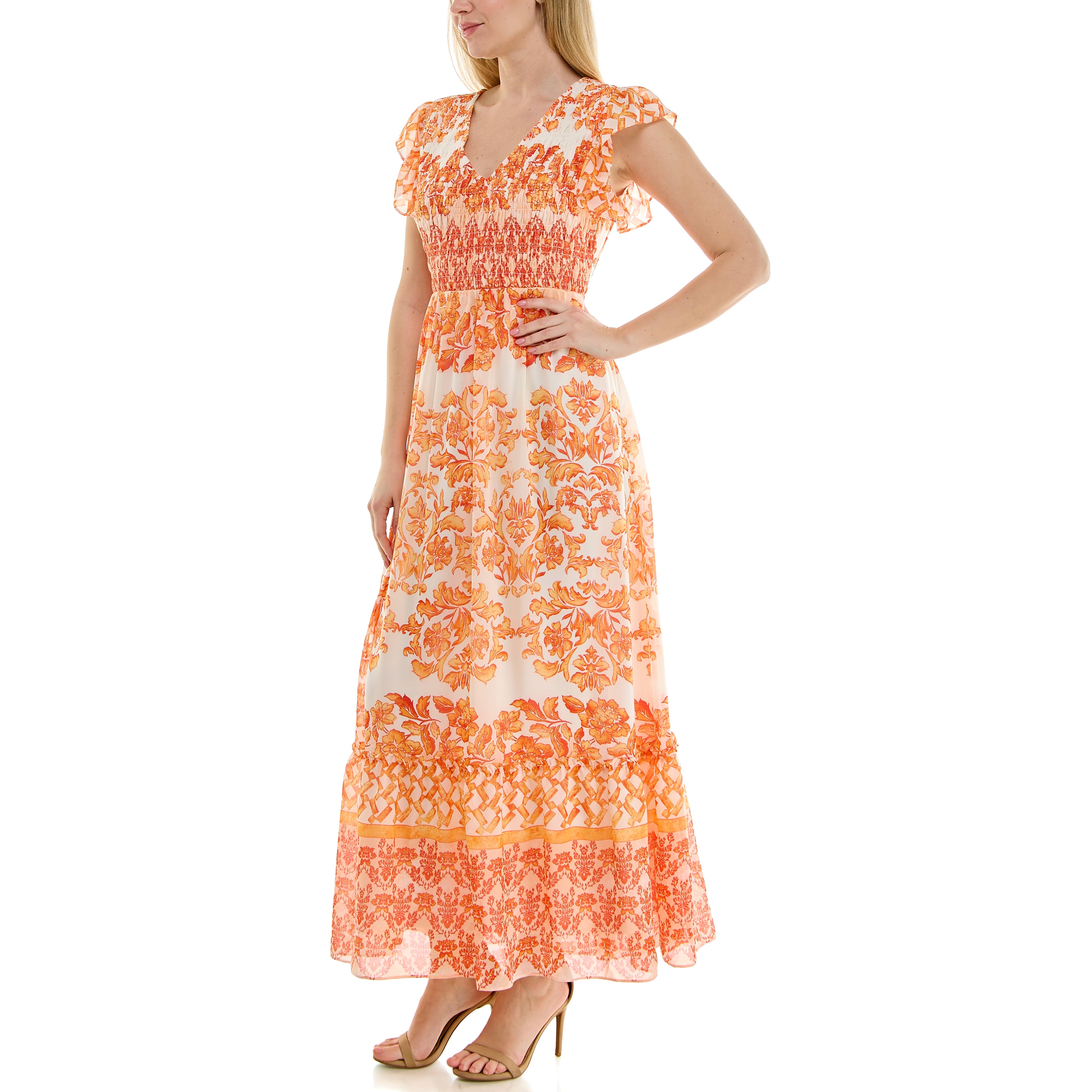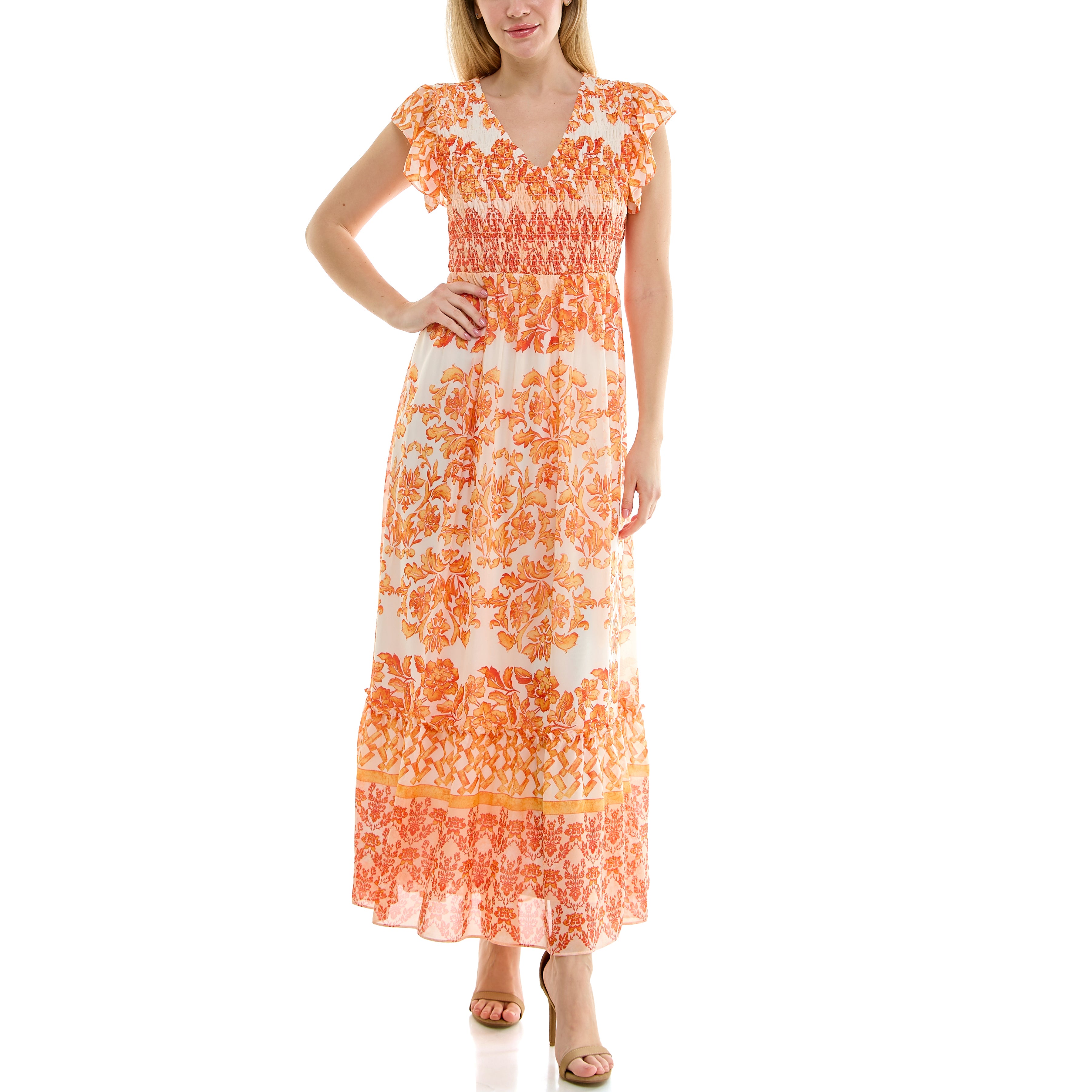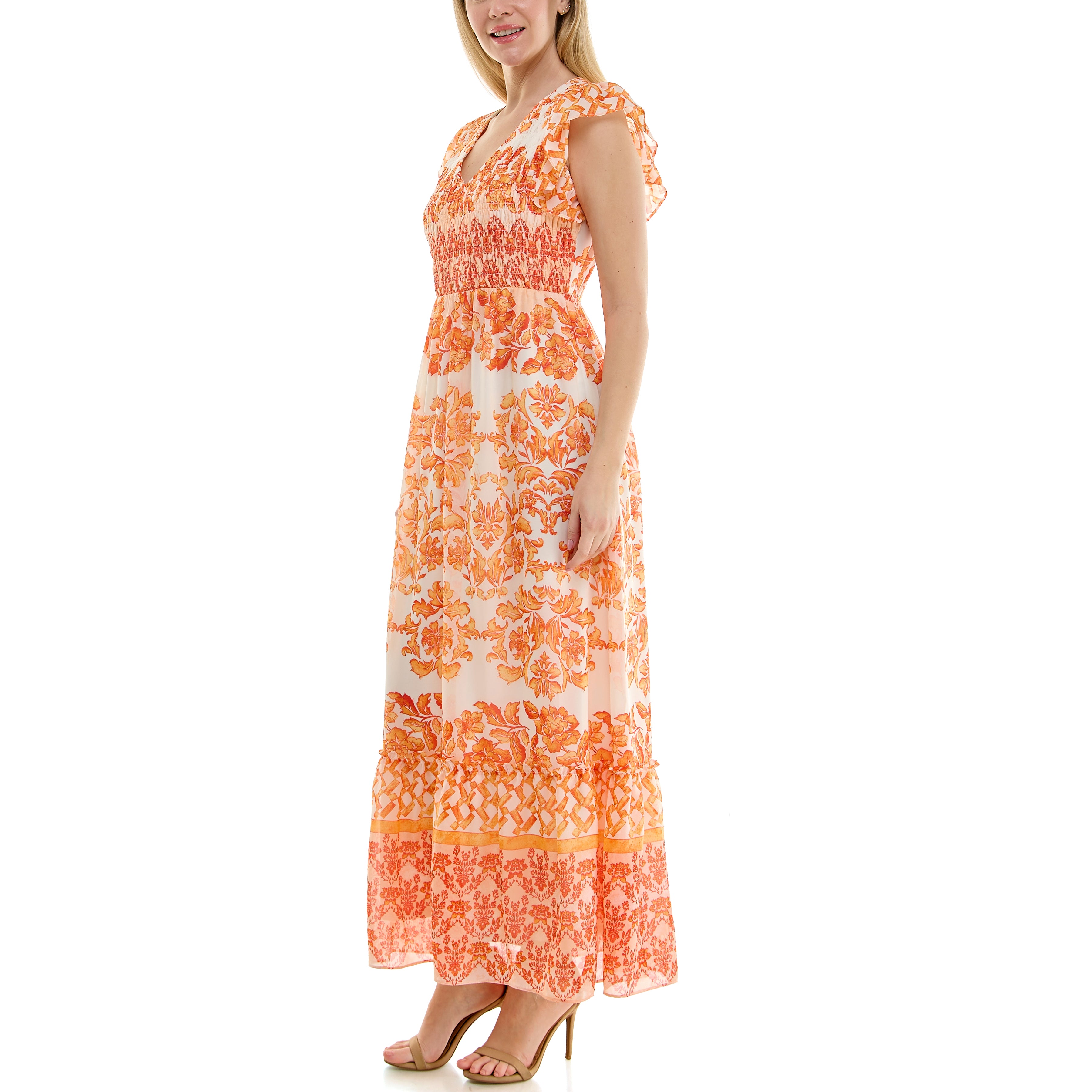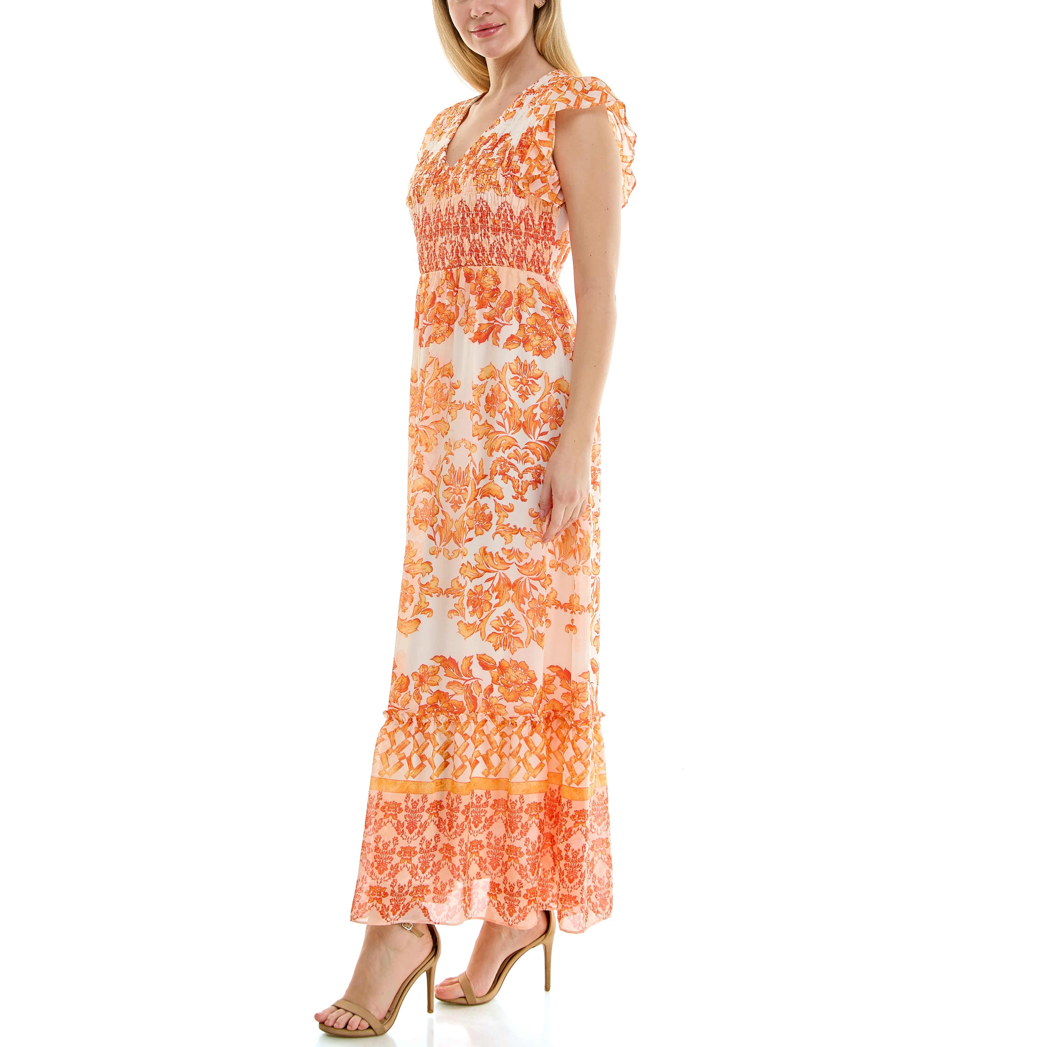MAISON TARA SLEEVELESS SMOCKED WAIST TROPICAL FLORAL PRINT CURVE MAXI DRESS