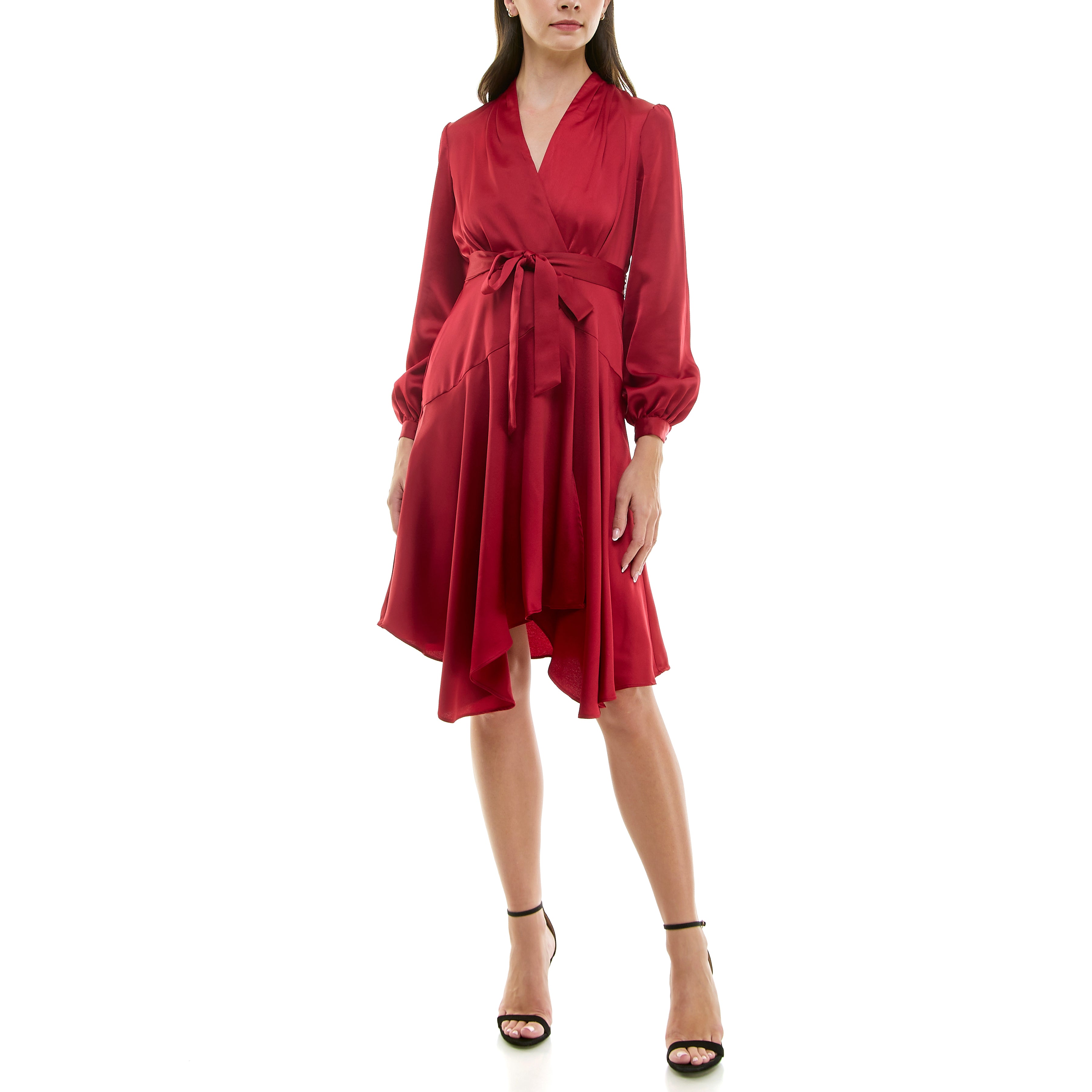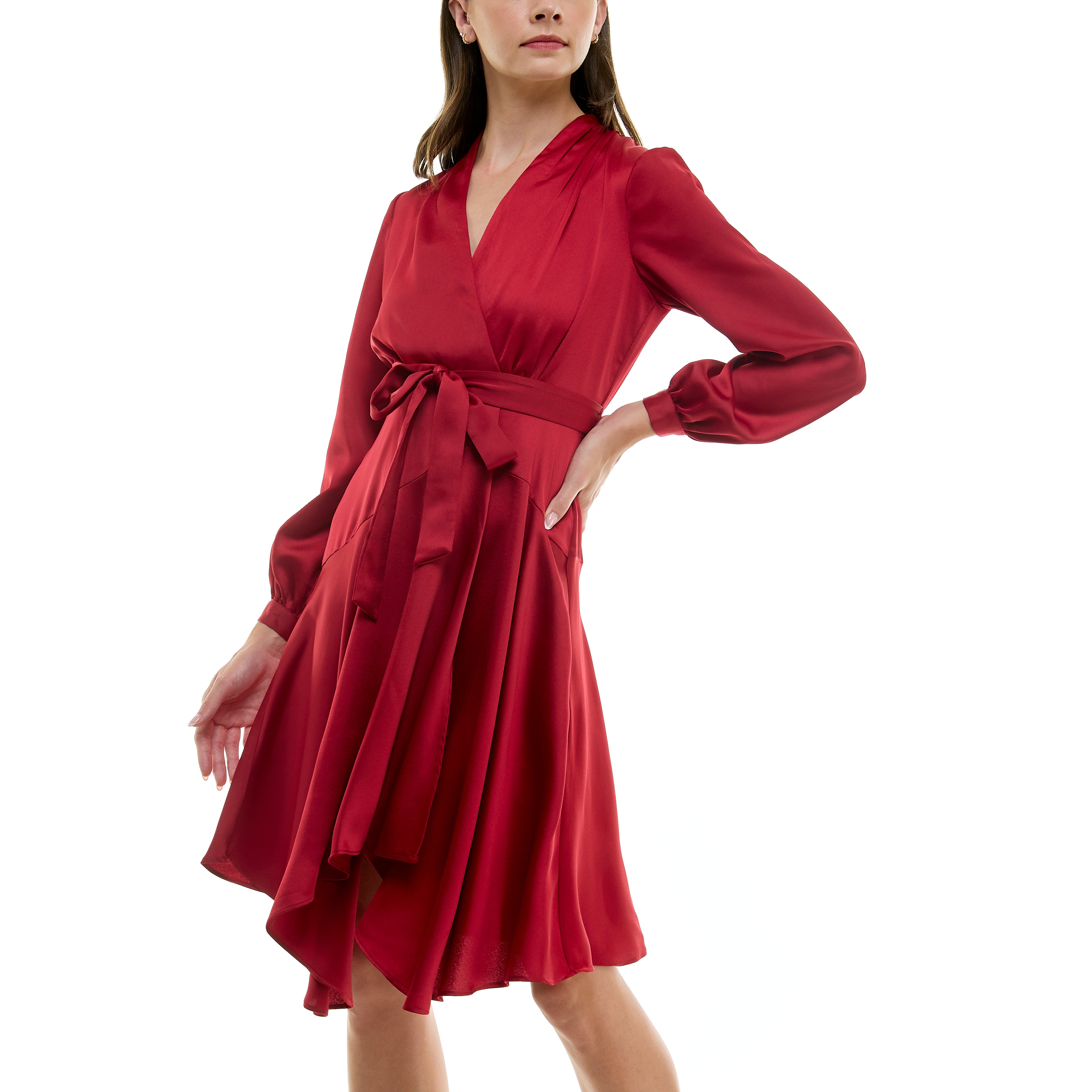 MAISON TARA PUFF SLEEVE CINCTURED WRAP MINI DRESS