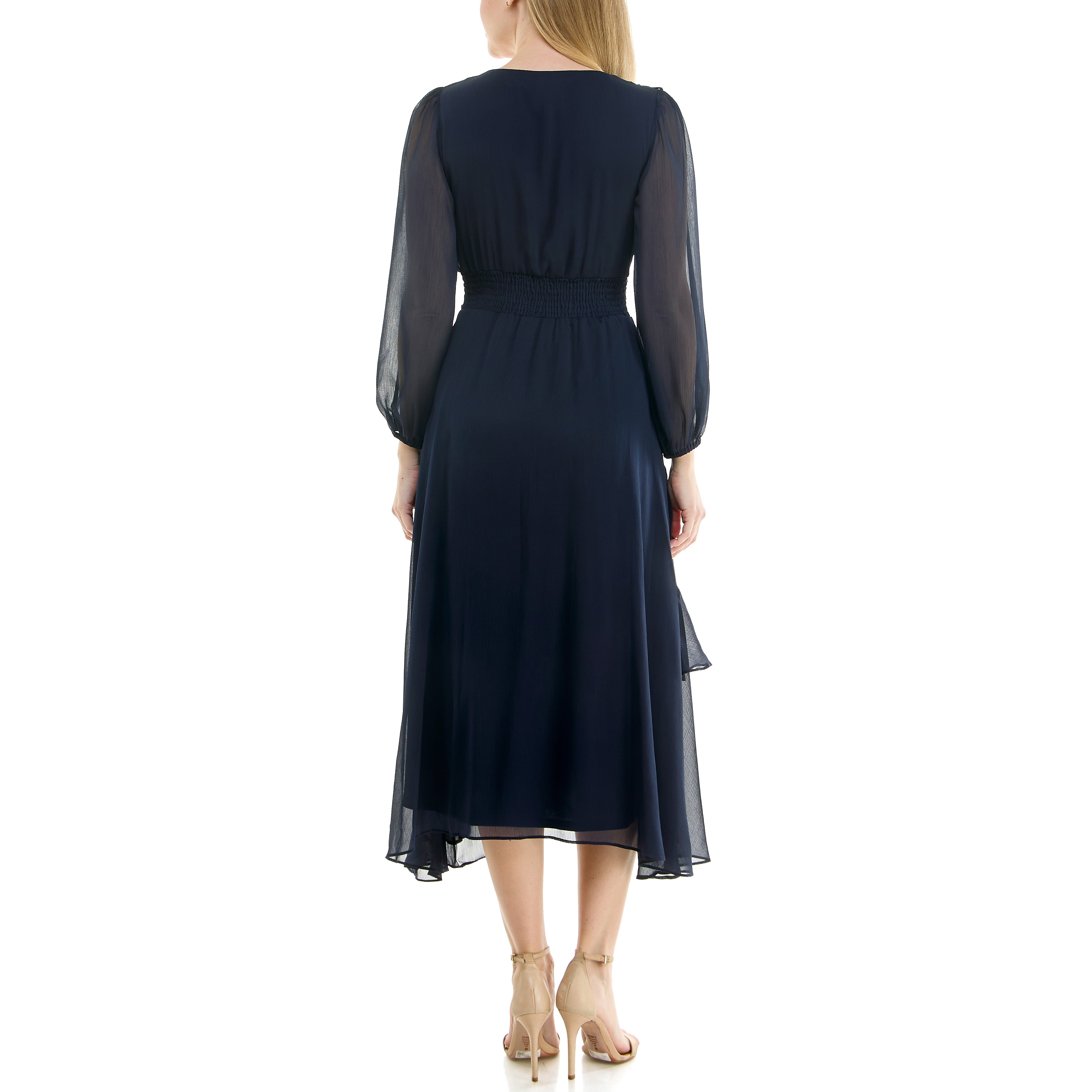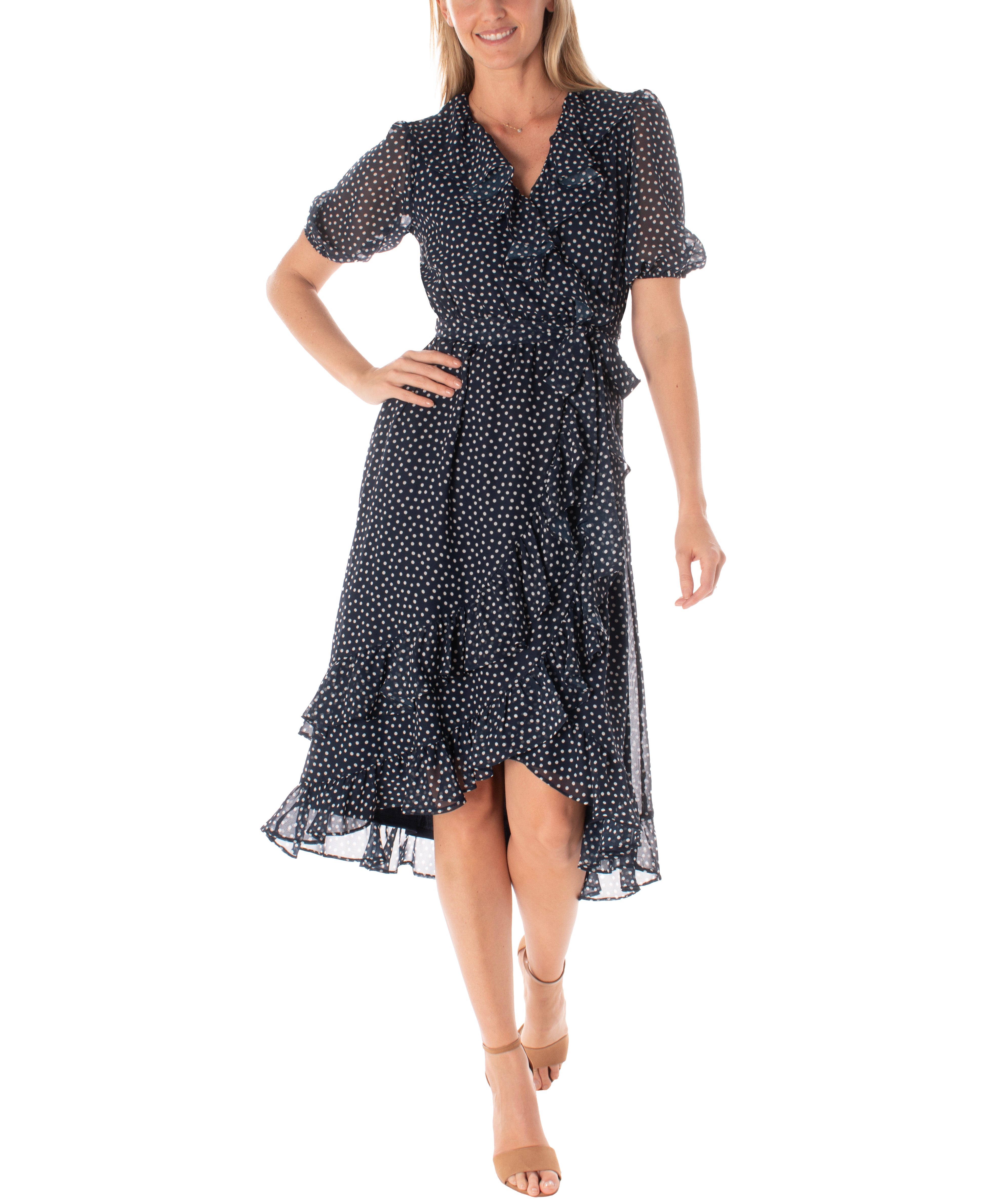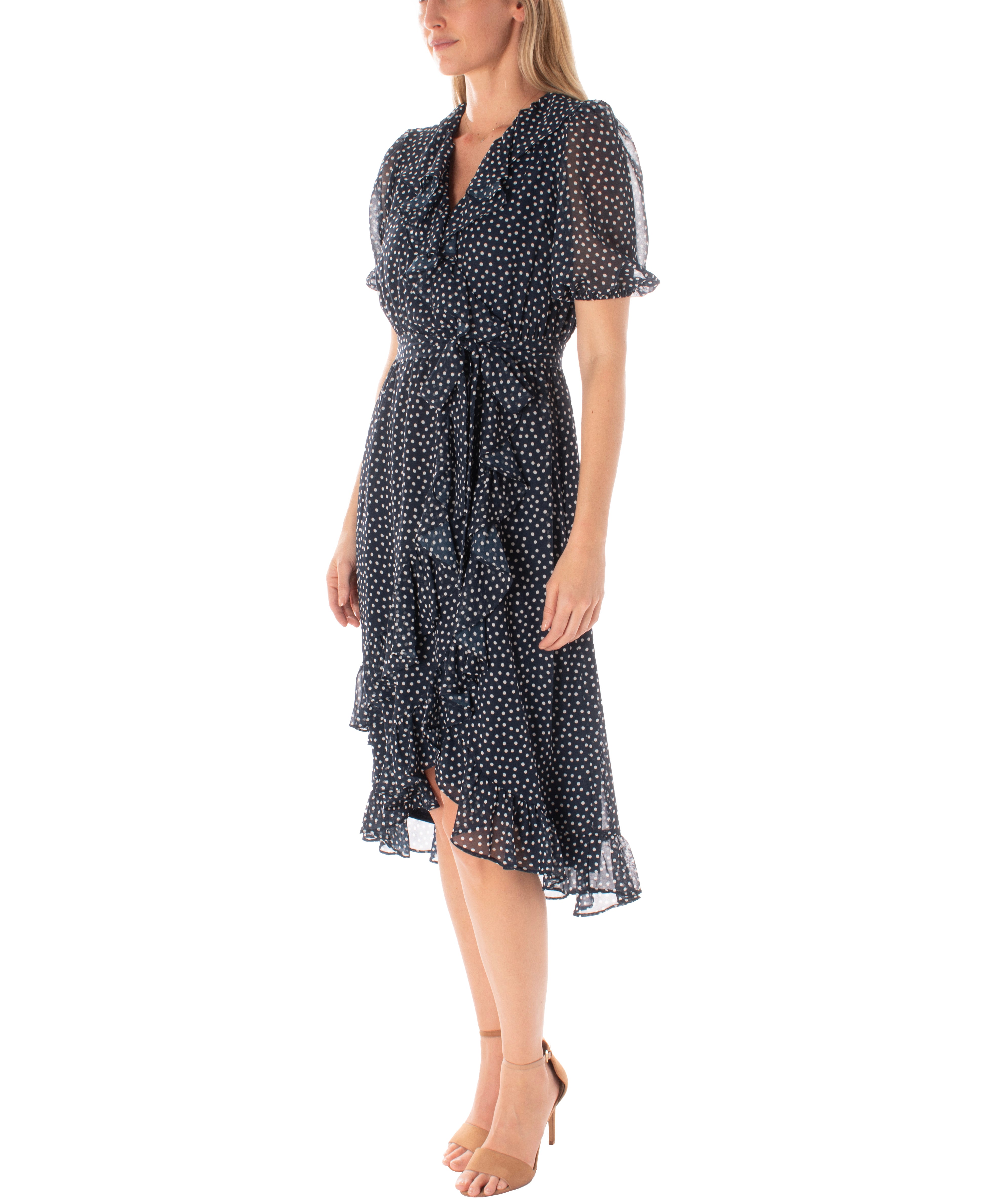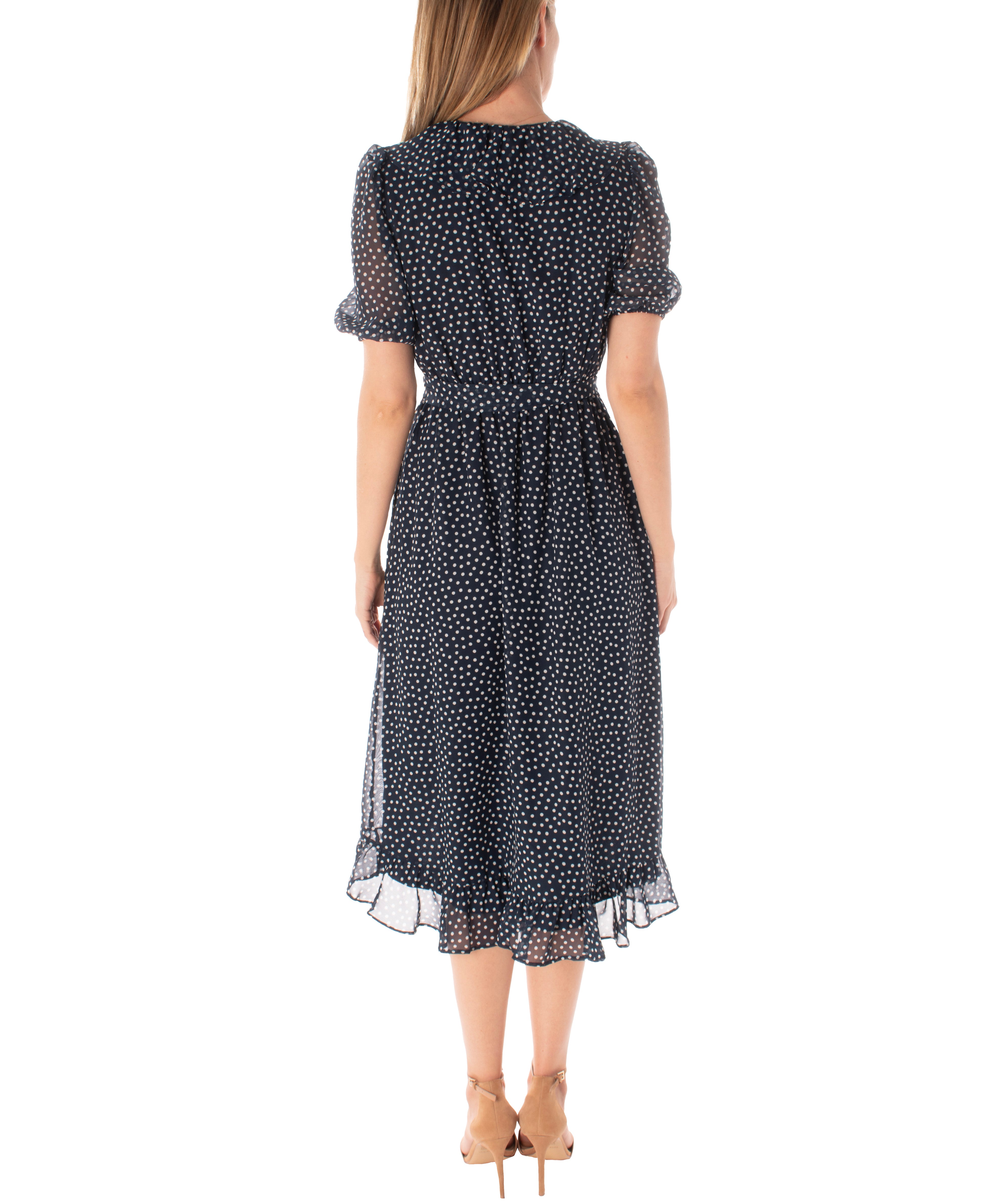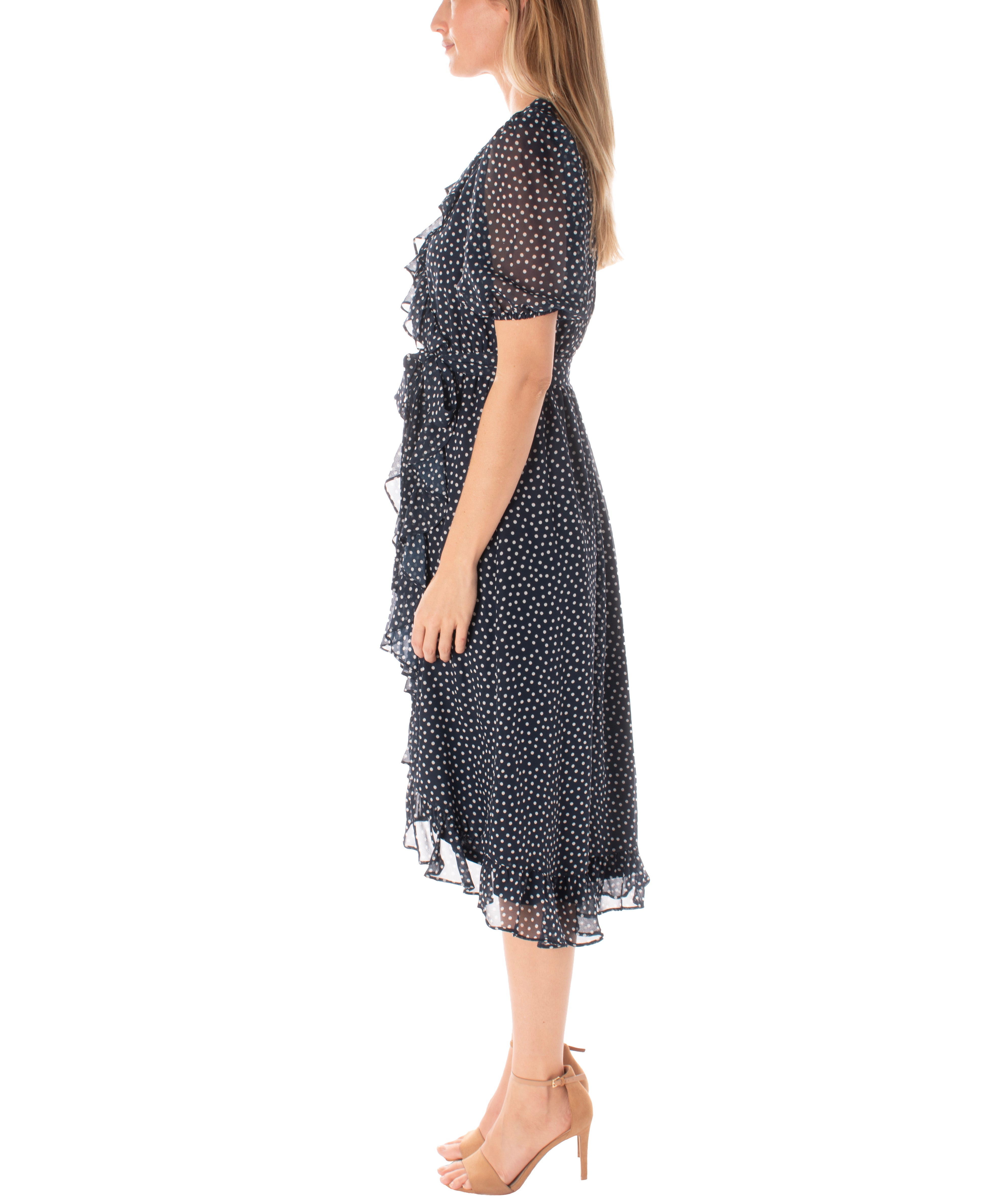 MAISON TARA SWISS DOT PRINT FAUX WRAP CHIFFON RUFFLED MIDI DRESS