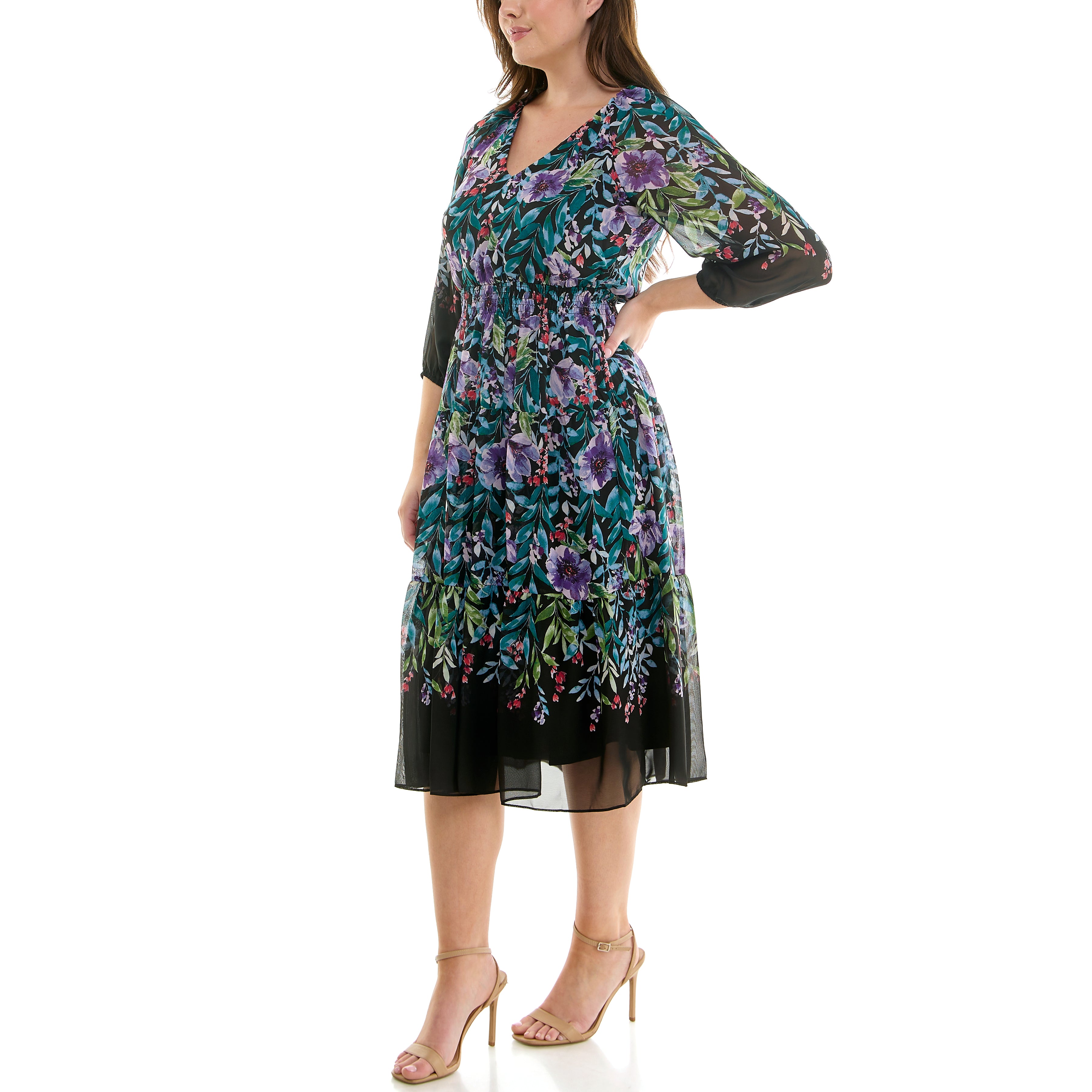 MAISON TARA MULTICOLORED FLORAL PRINTED CHIFFON CURVE MIDI DRESS
