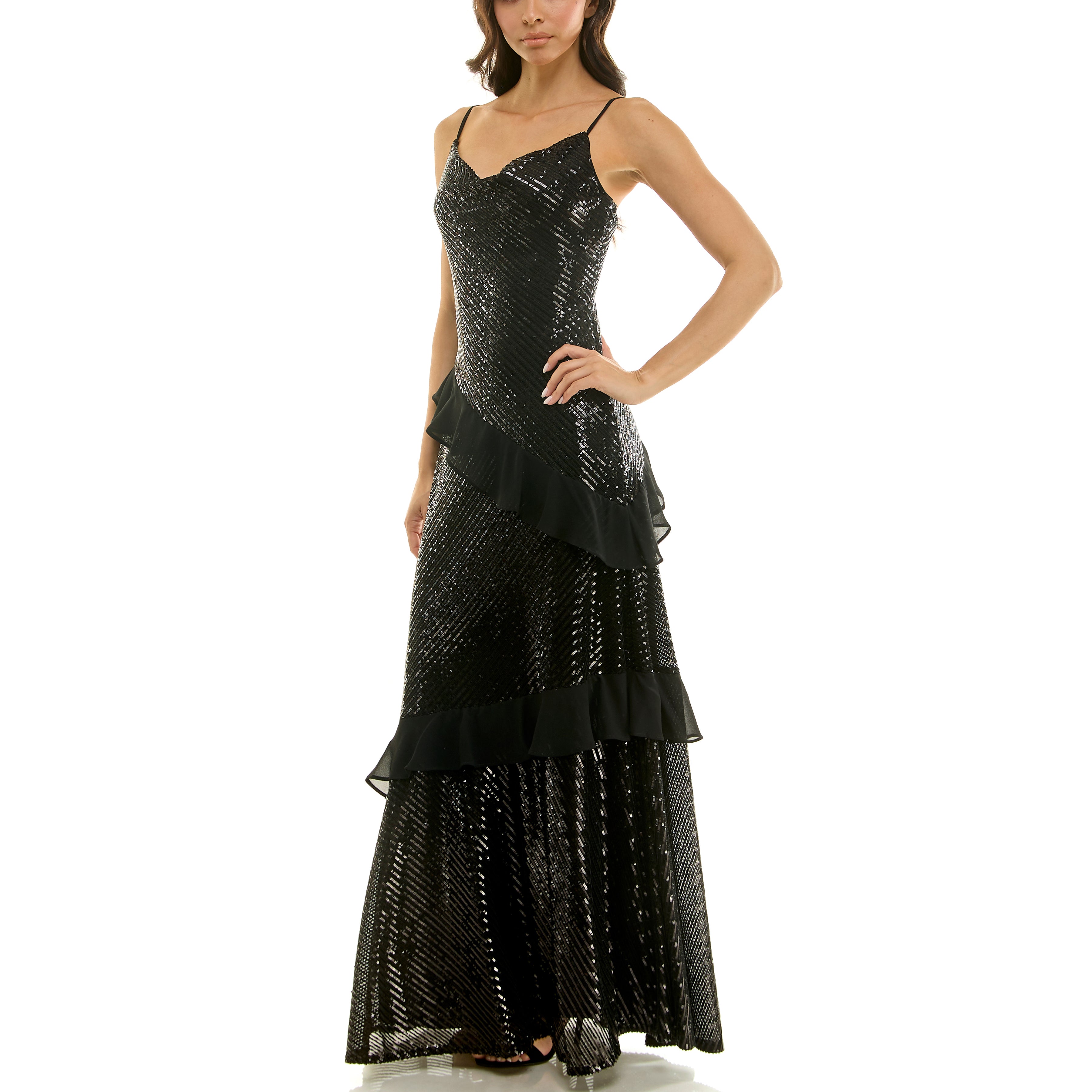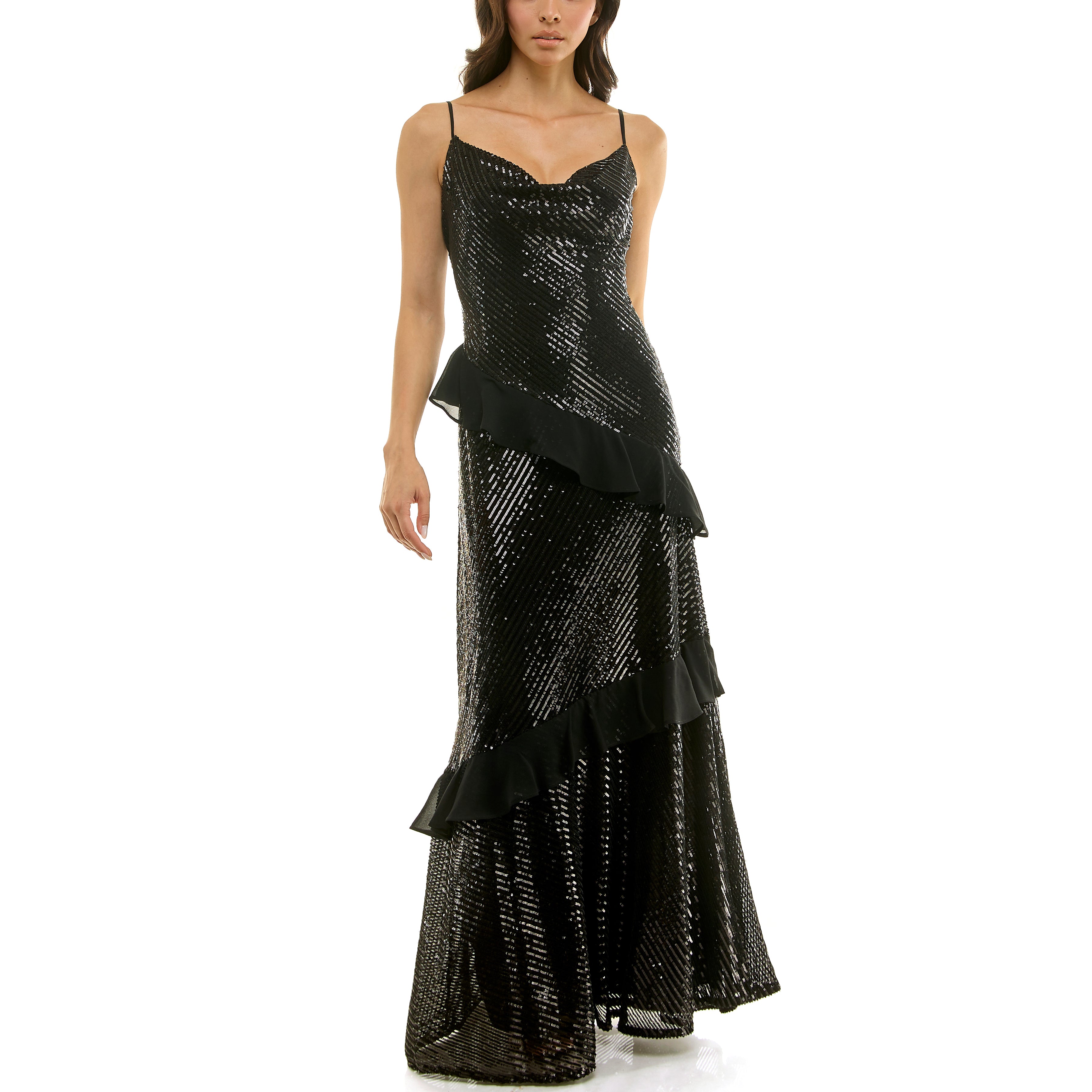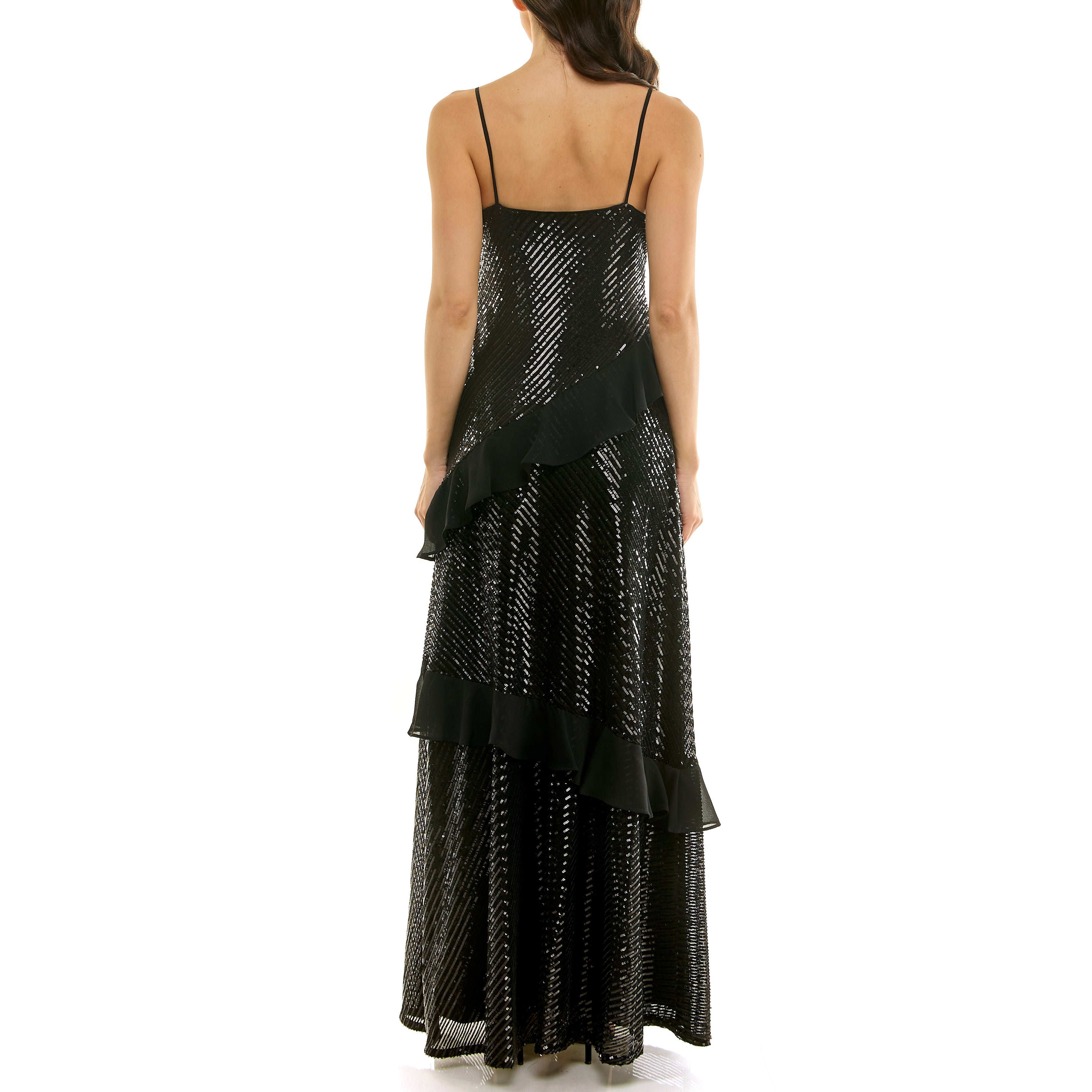 MAISON TARA SLEEVELESS SEQUINED SPIRAL RUFFLE TIERED GOWN