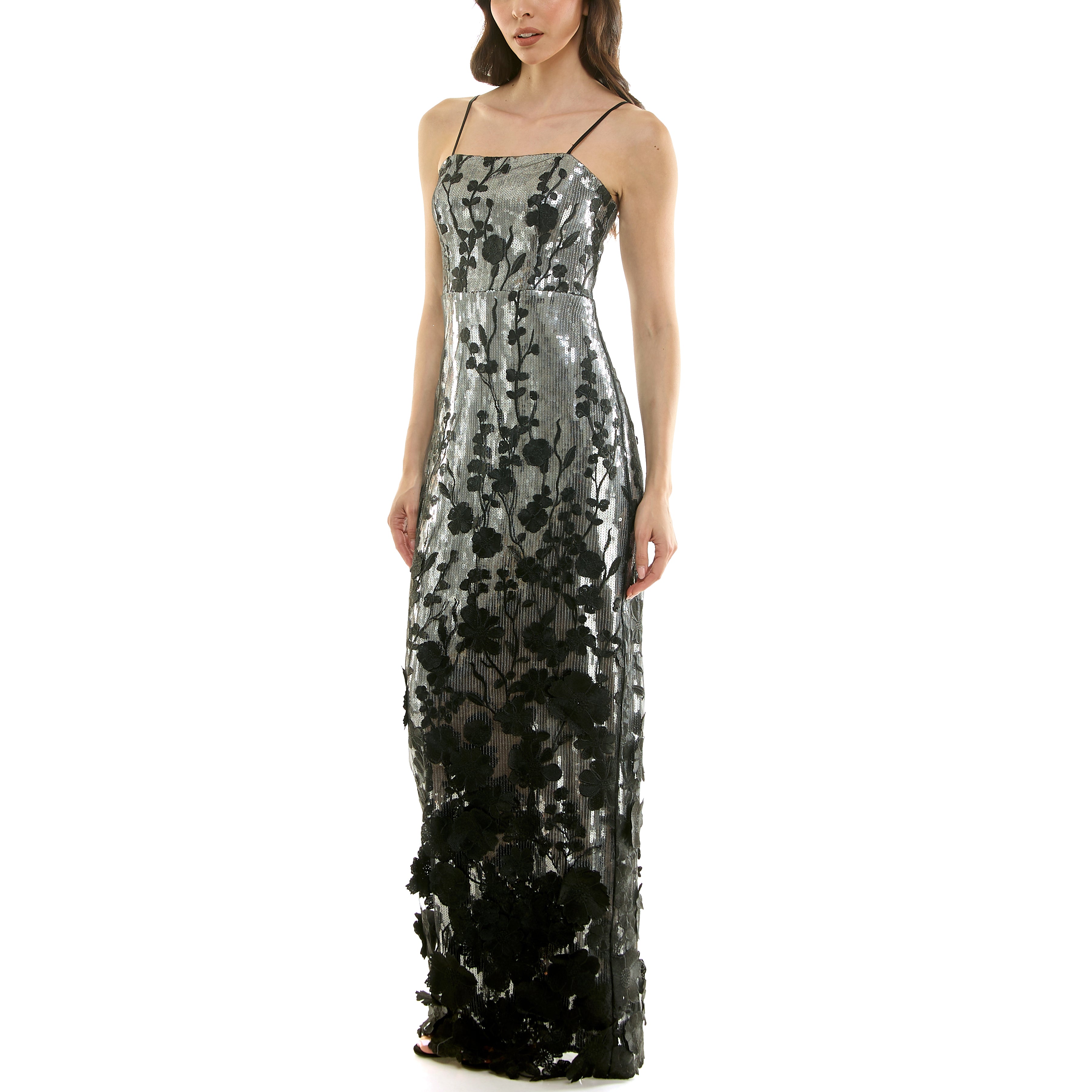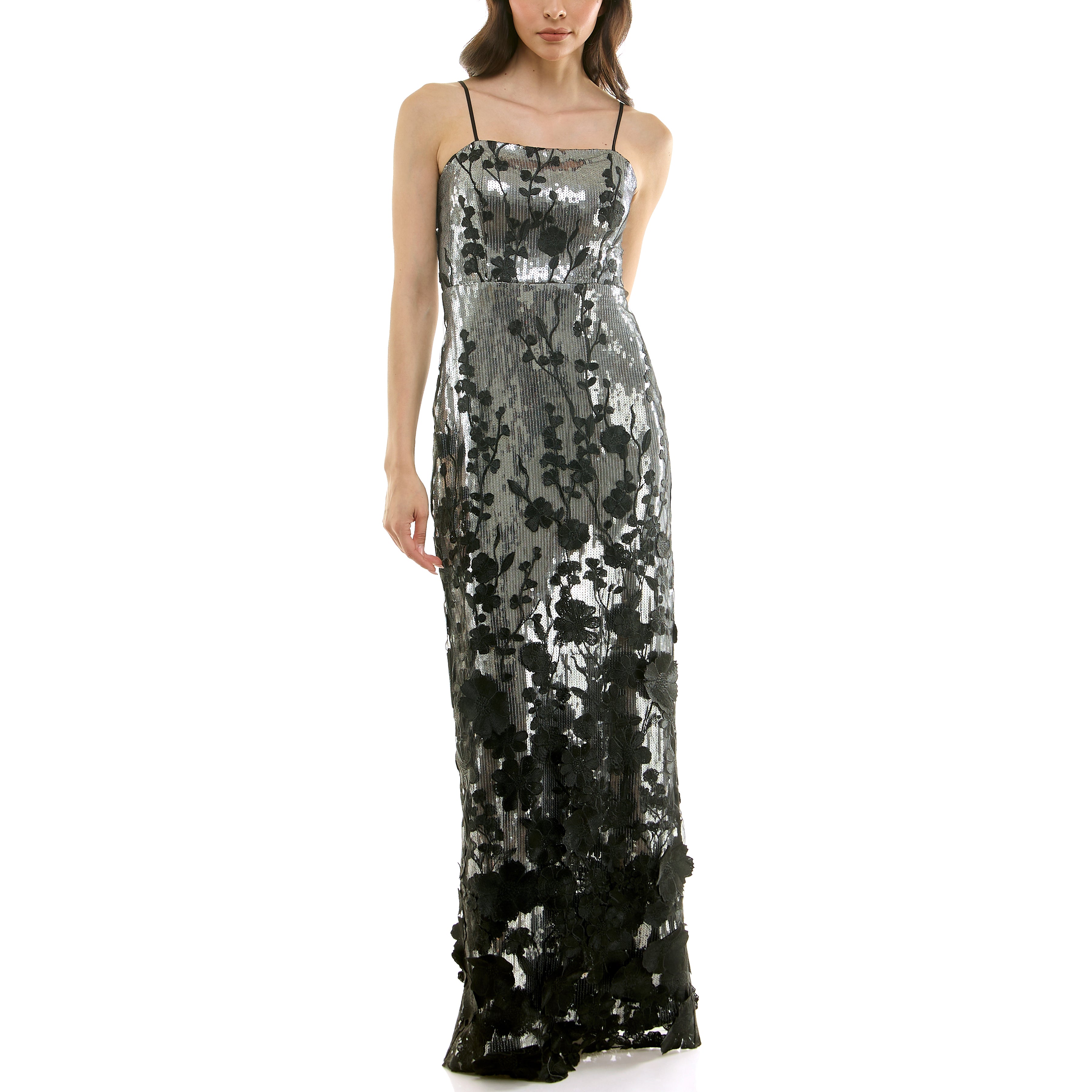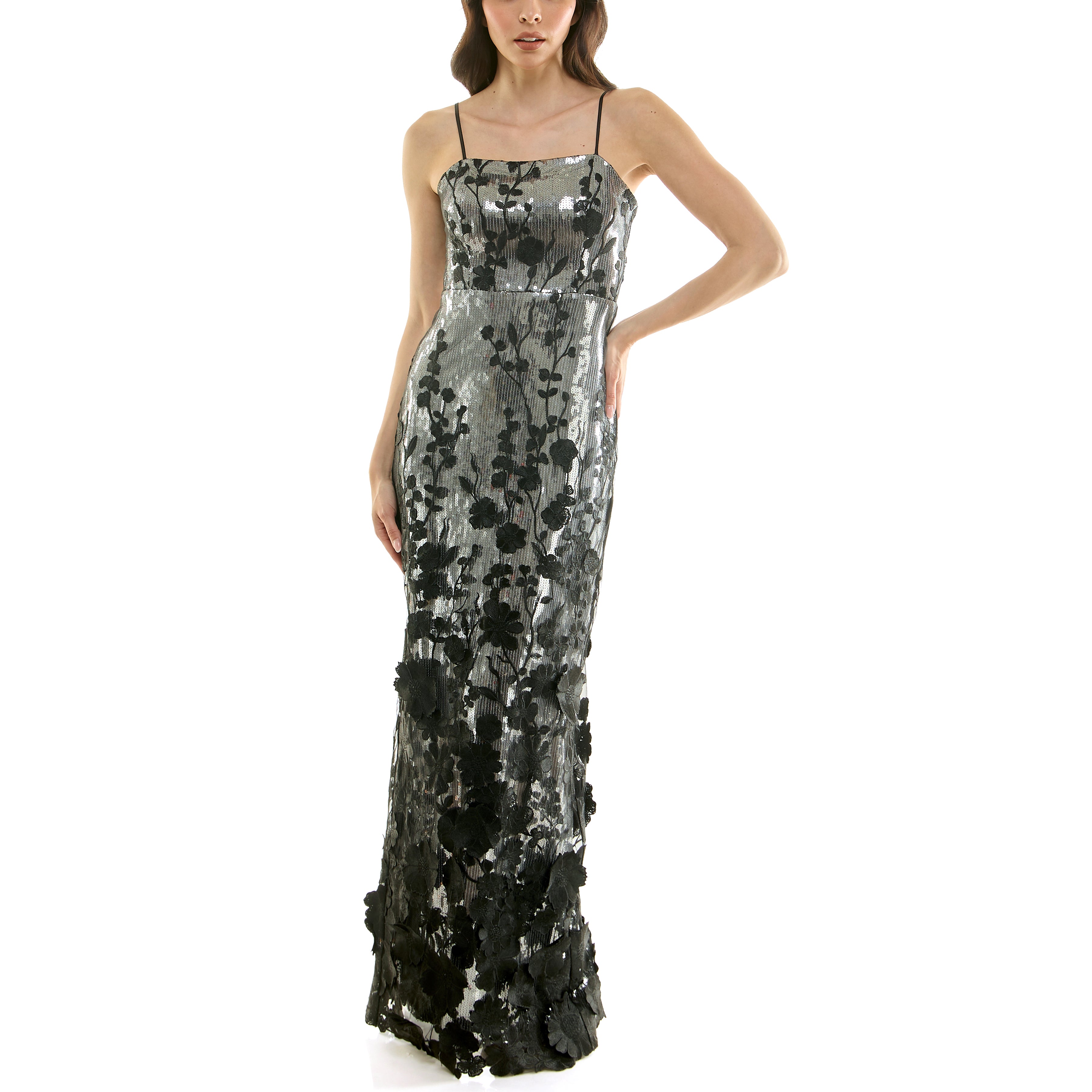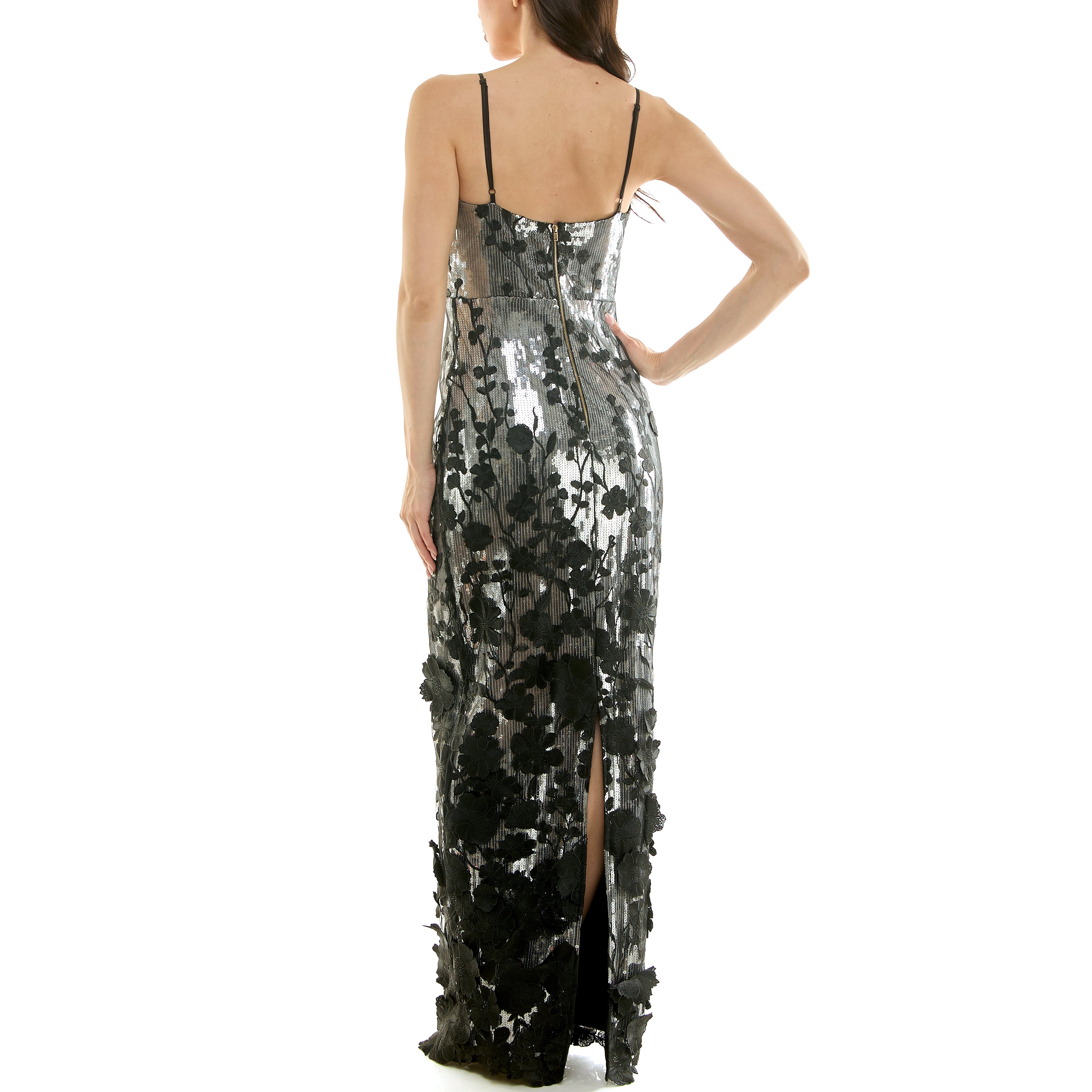 MAISON TARA SLEEVELESS 3-D FLORAL EMBROIDERED MESH SEQUIN GOWN