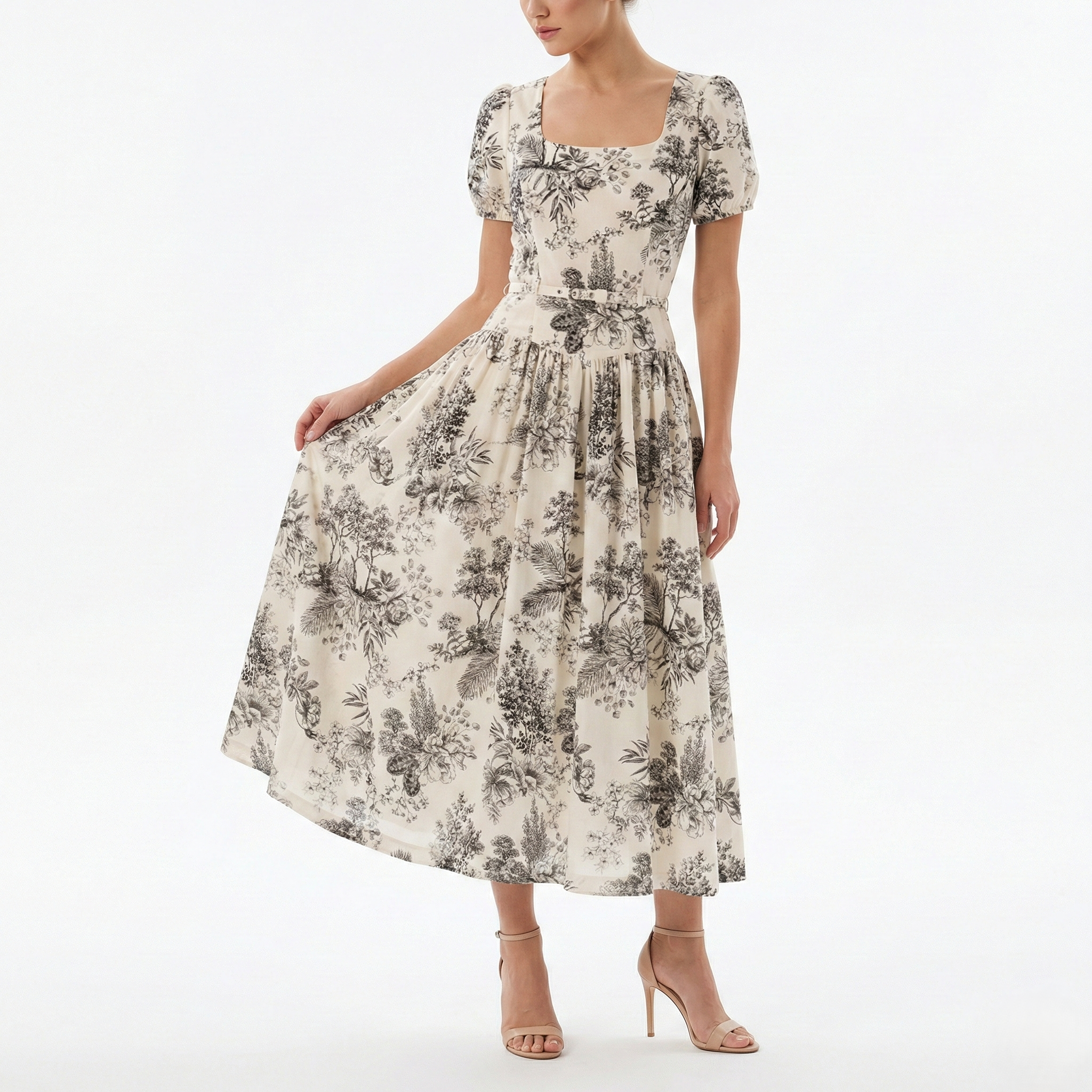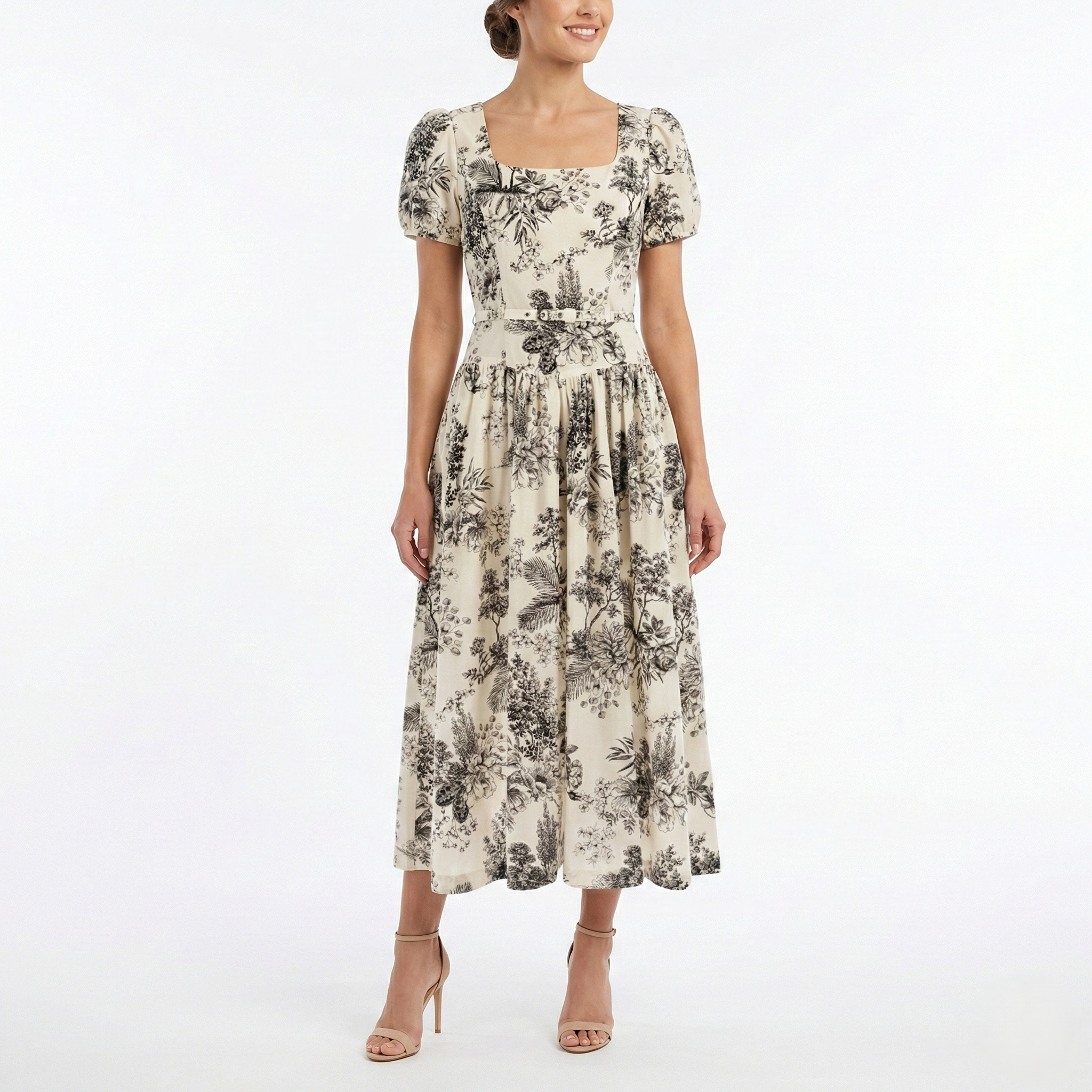 Ivory Floral Puff Sleeve Midi Dress – Square Neck Fit & Flare