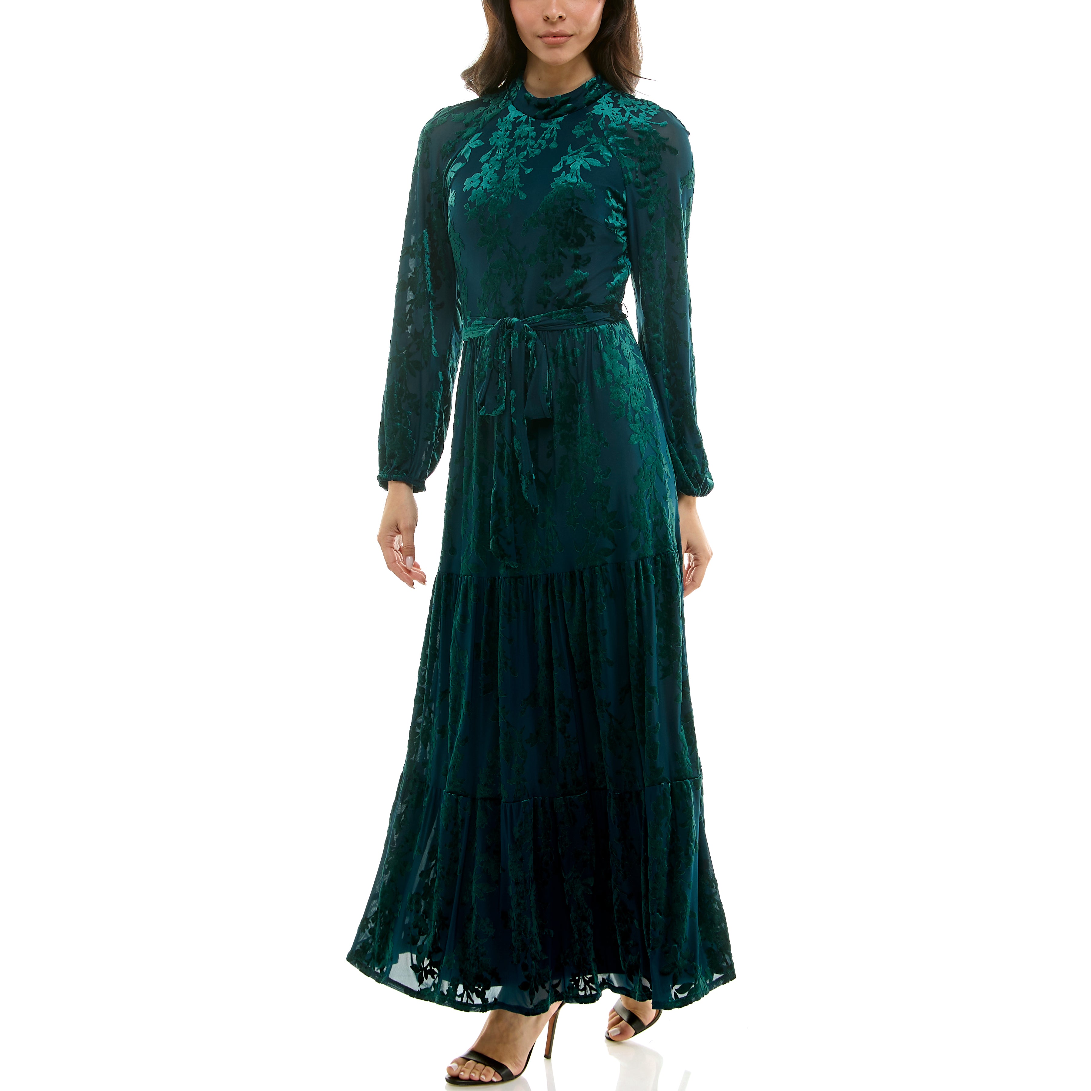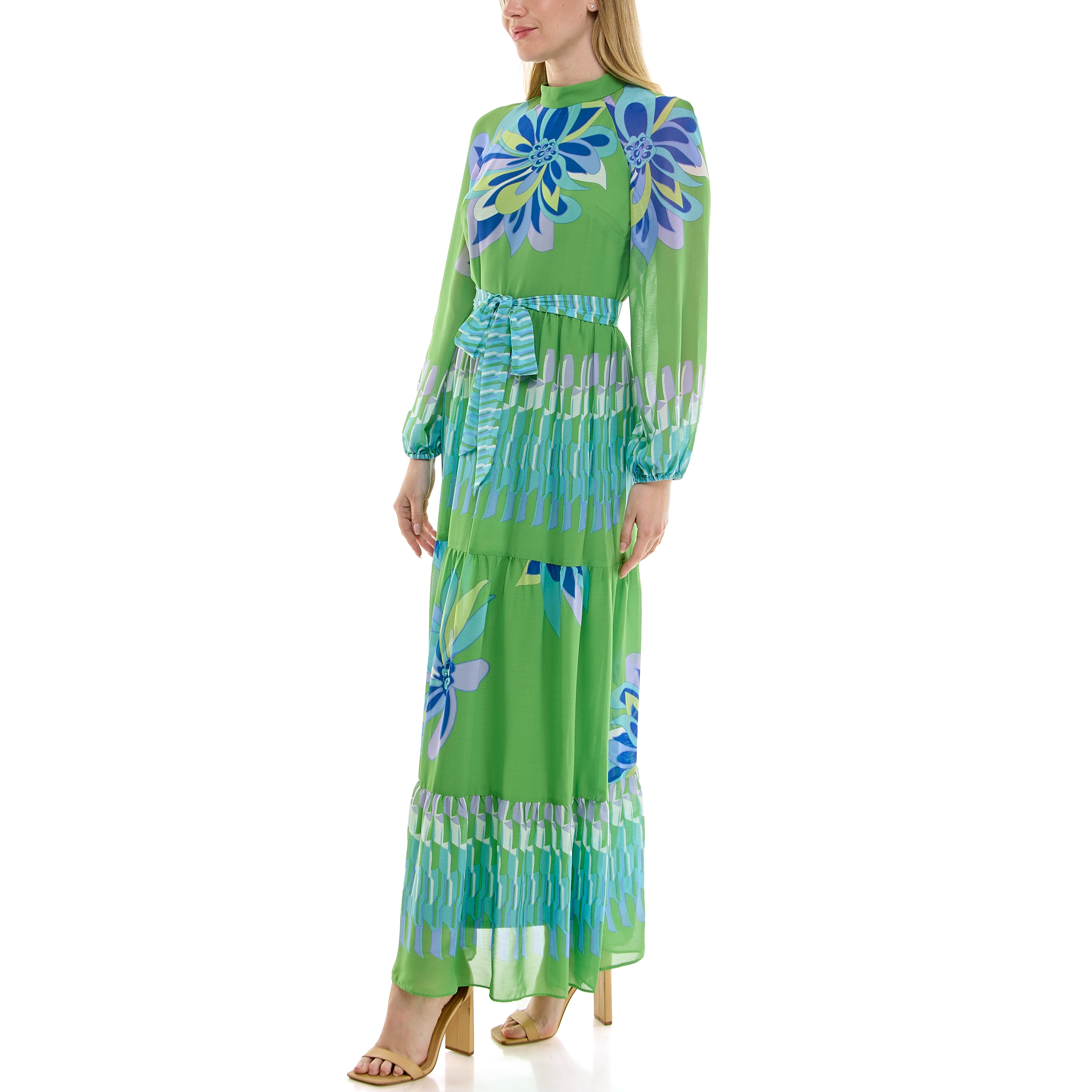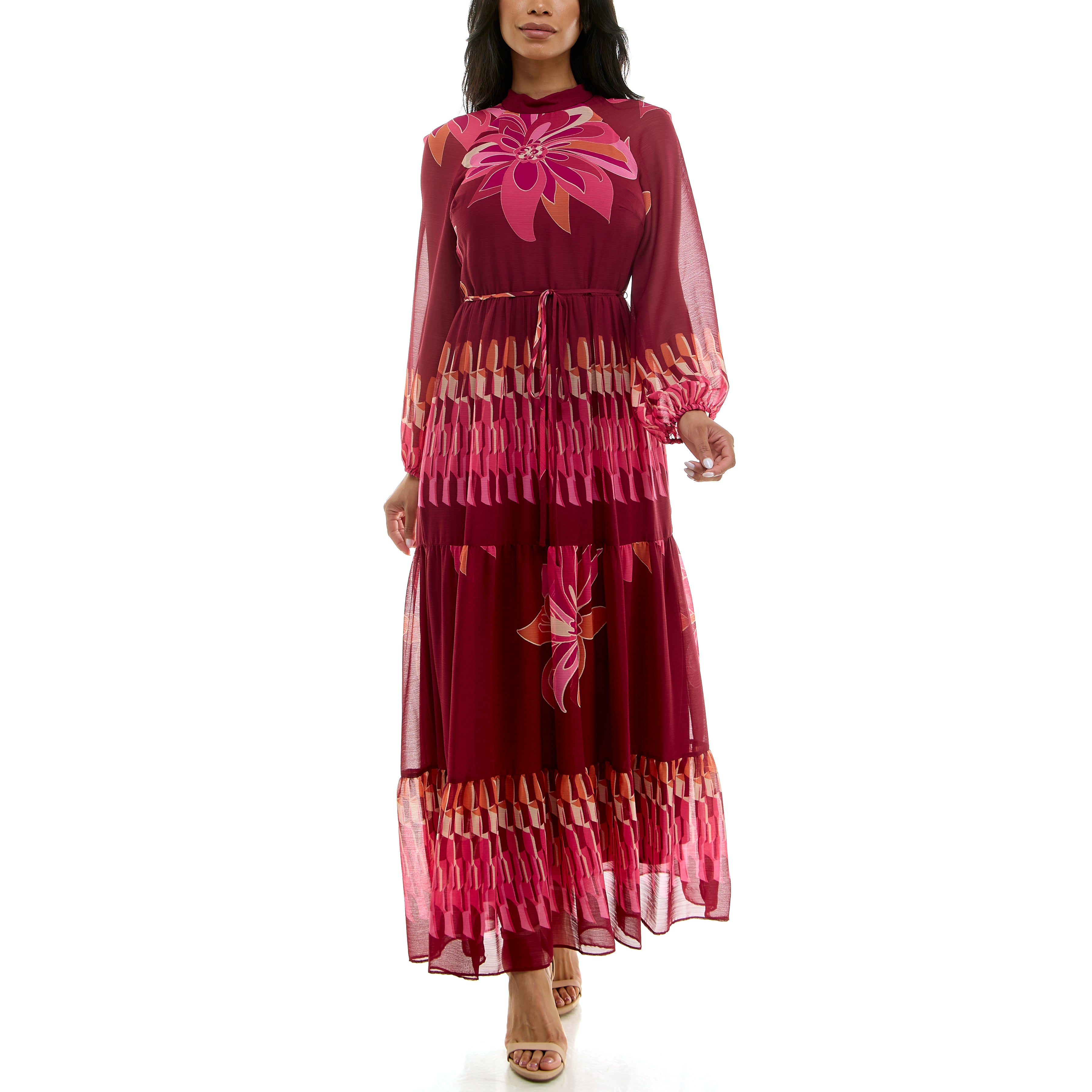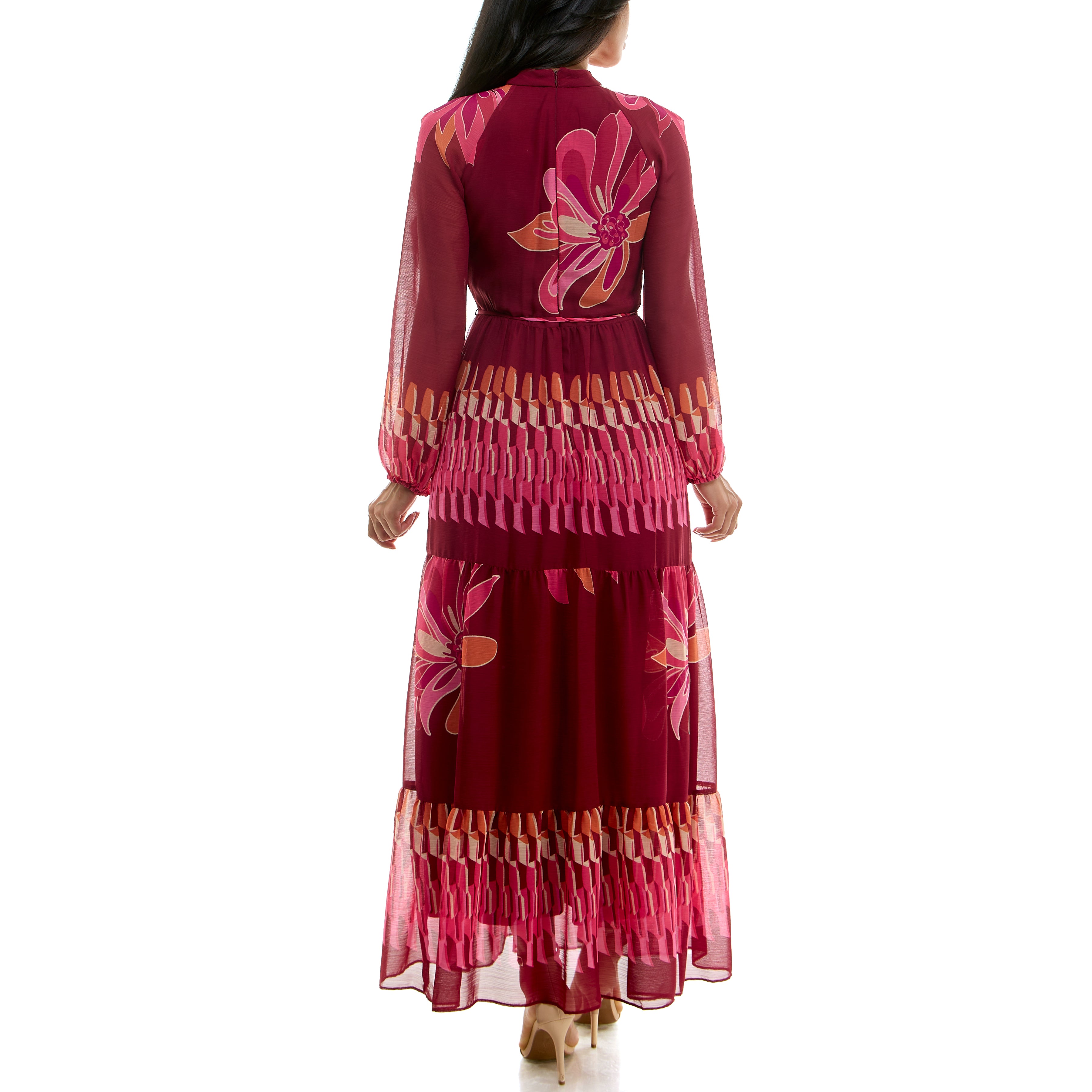 MAISON TARA RETRO FLORAL PRINT LONG SLEEVE MOCK NECK TIERED MAXI DRESS - EXCHANGES ONLY