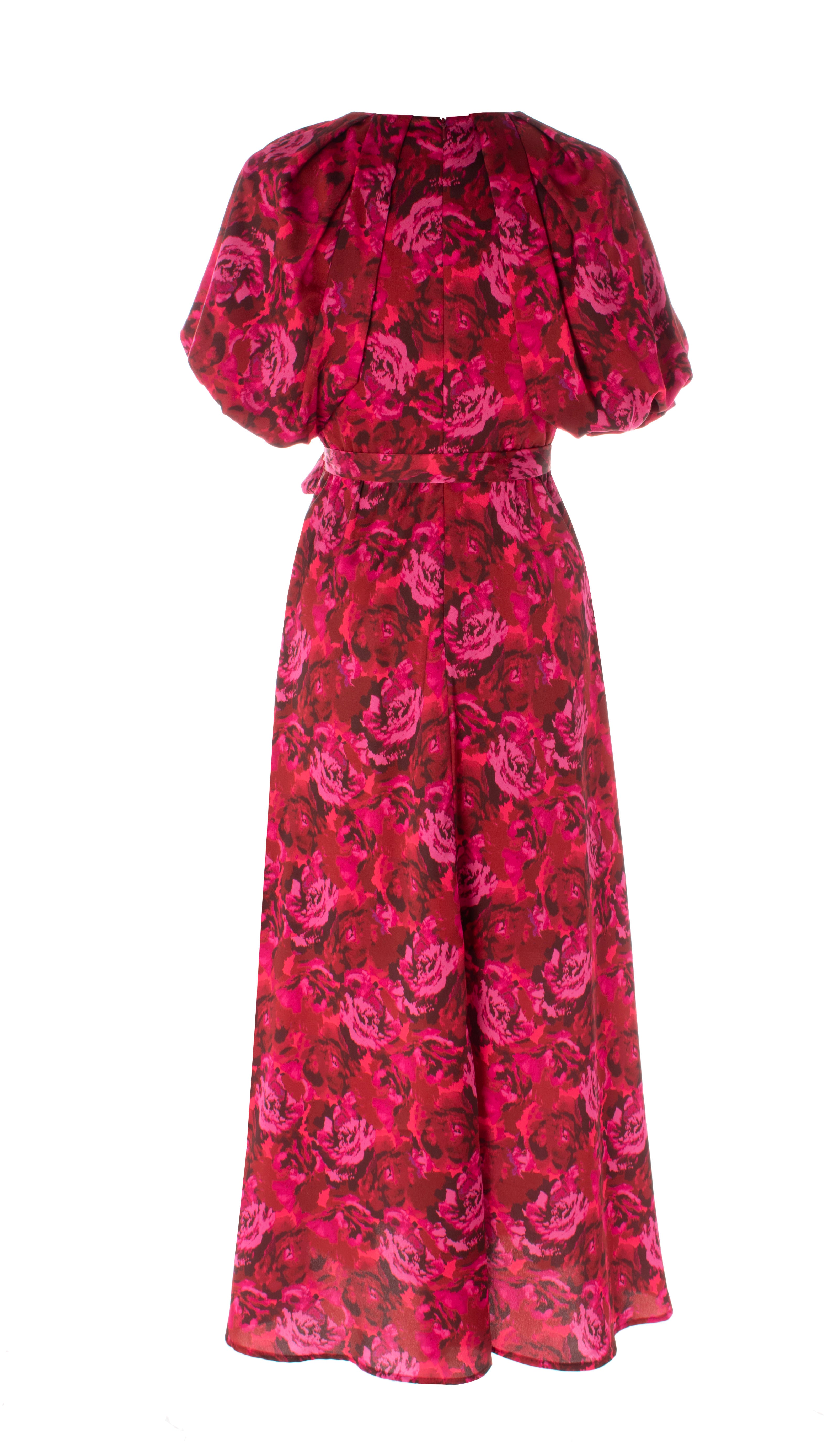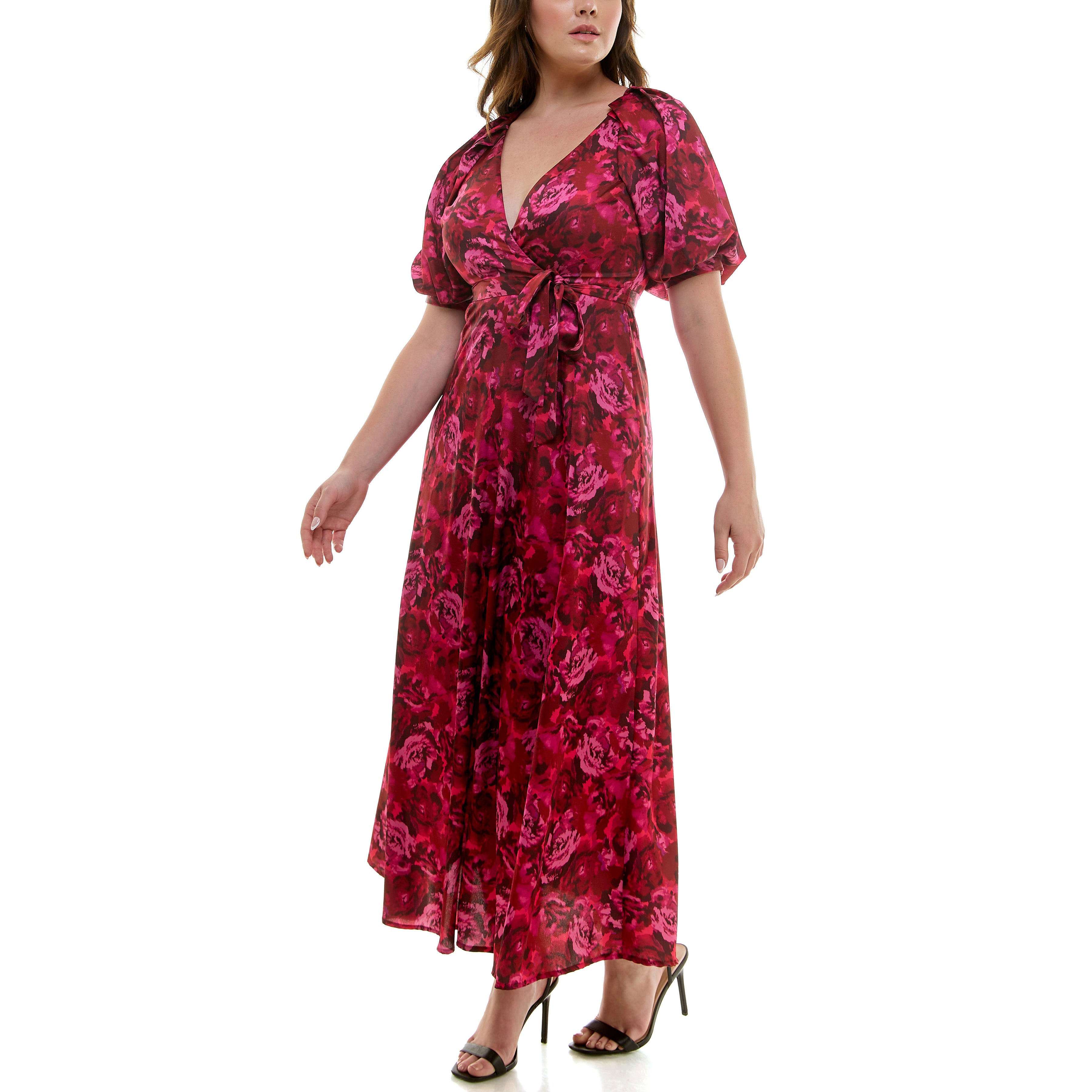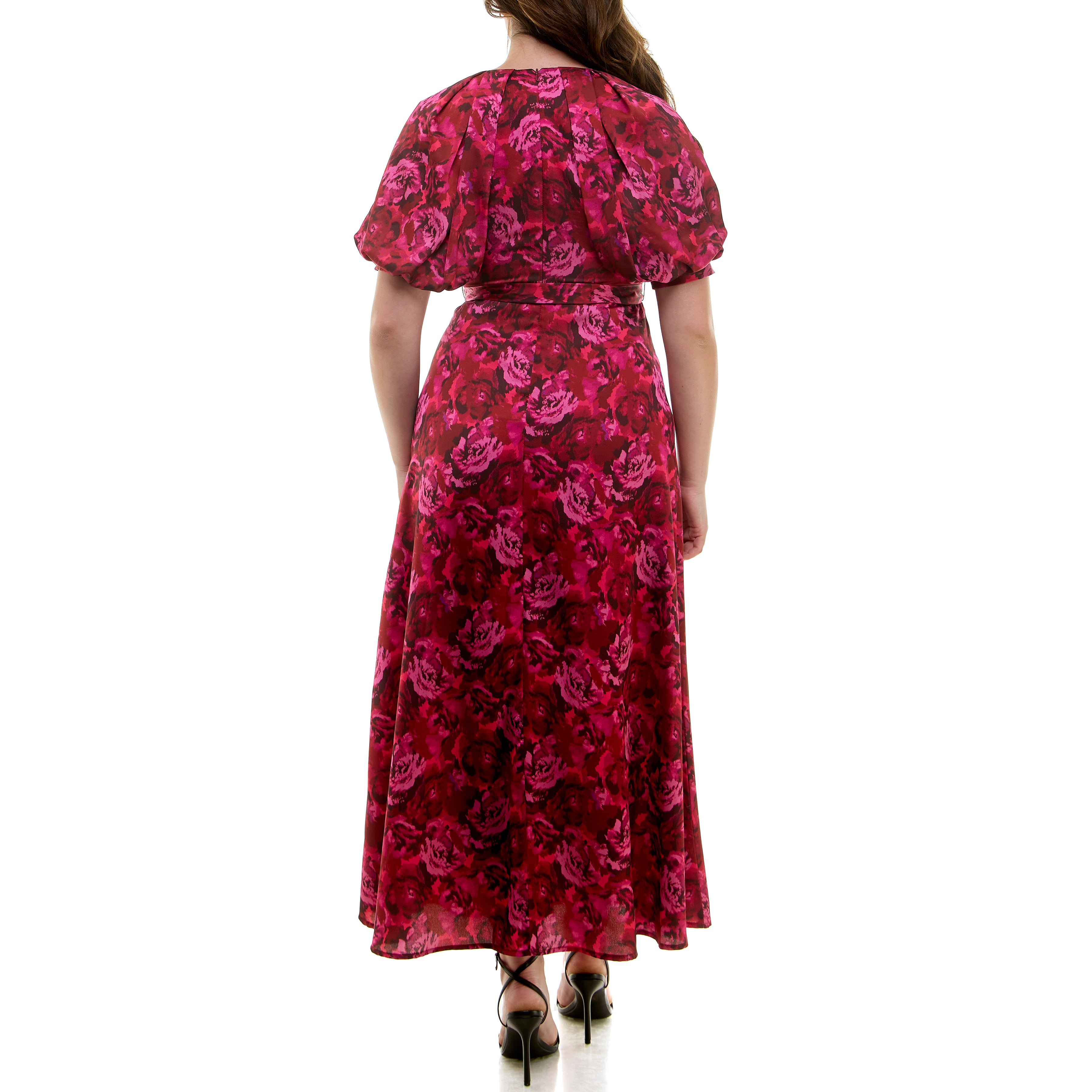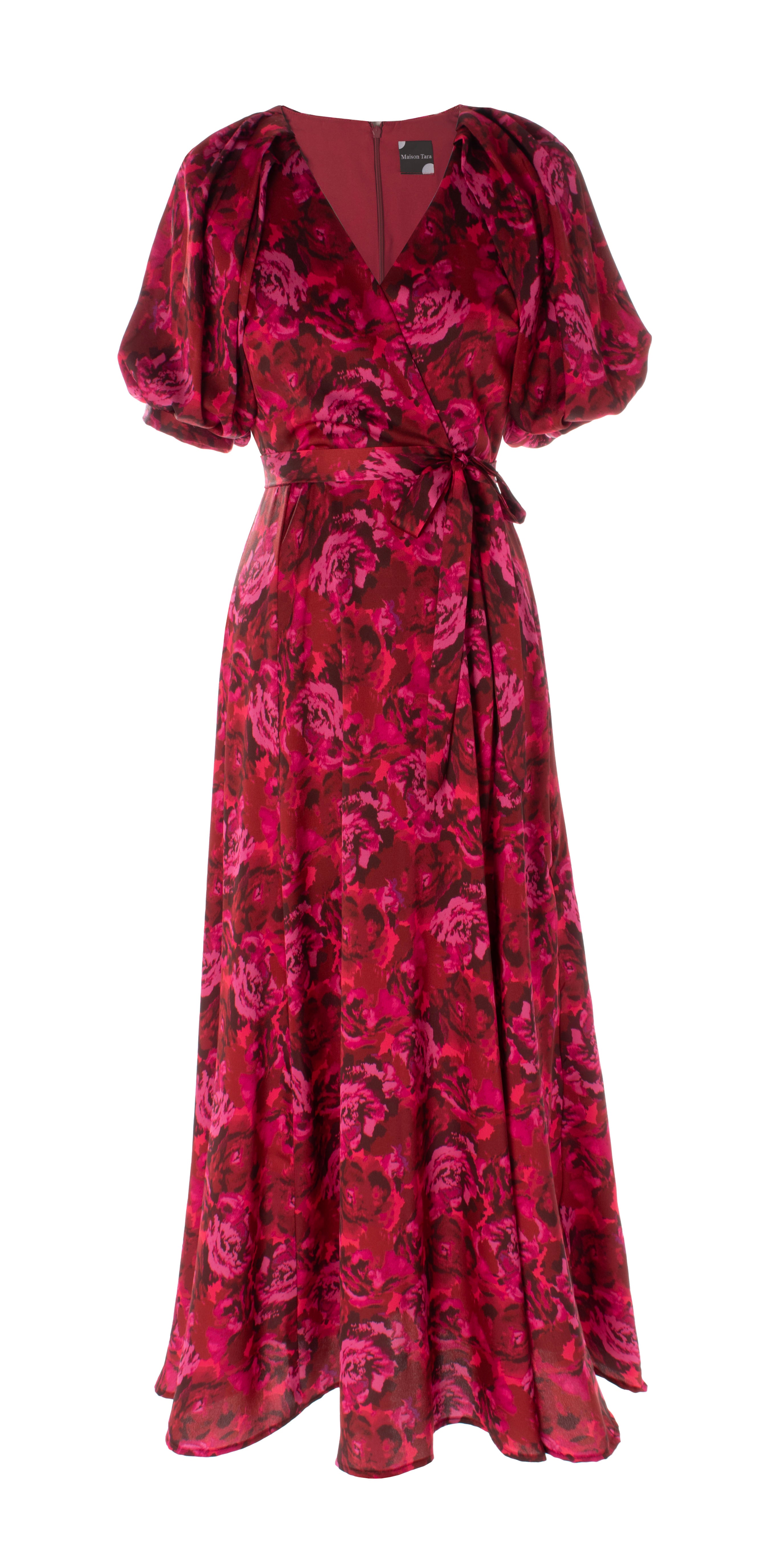 MAISON TARA ROSE BOUQUET PRINT PUFF SLEEVE PEBBLE SATIN WRAP MAXI DRESS