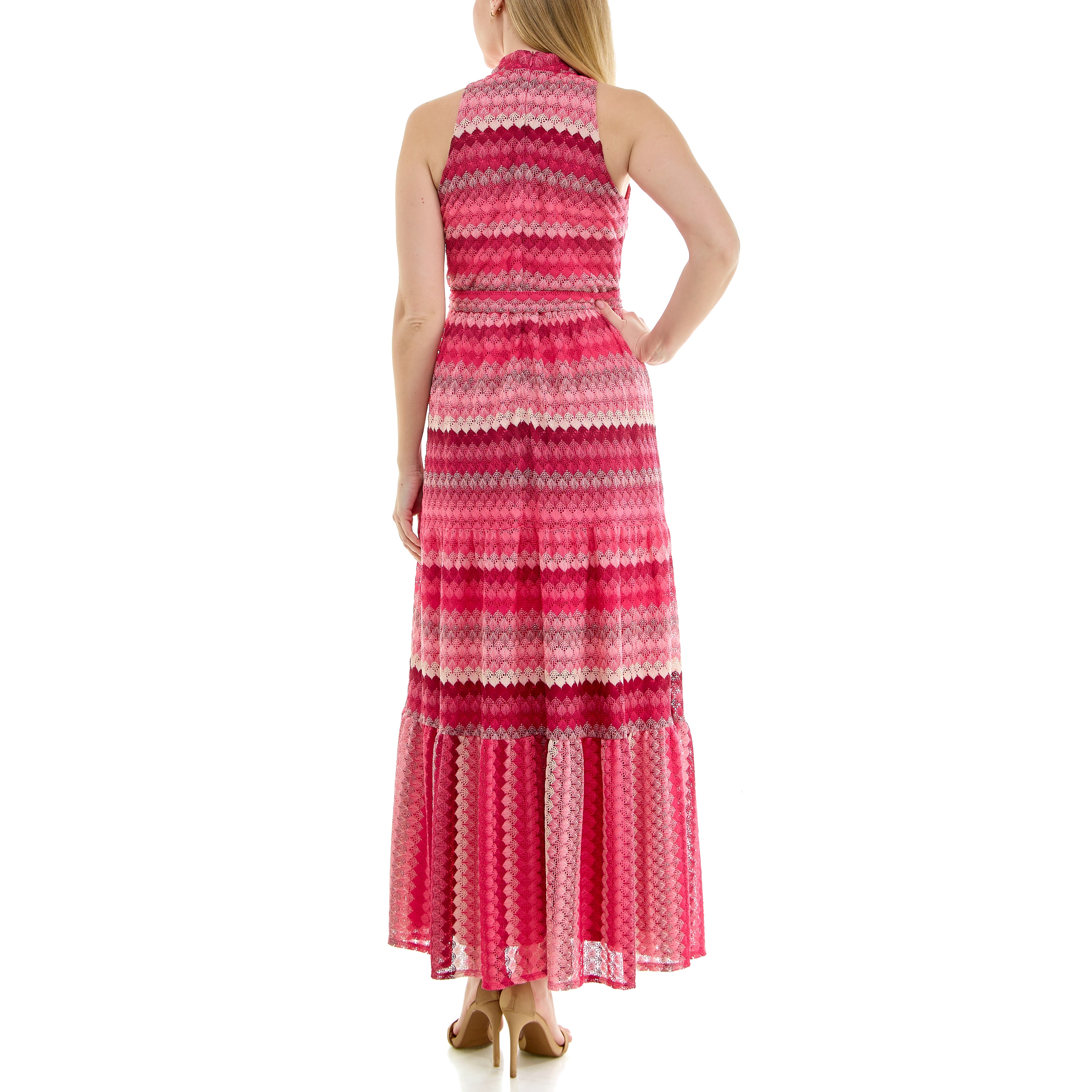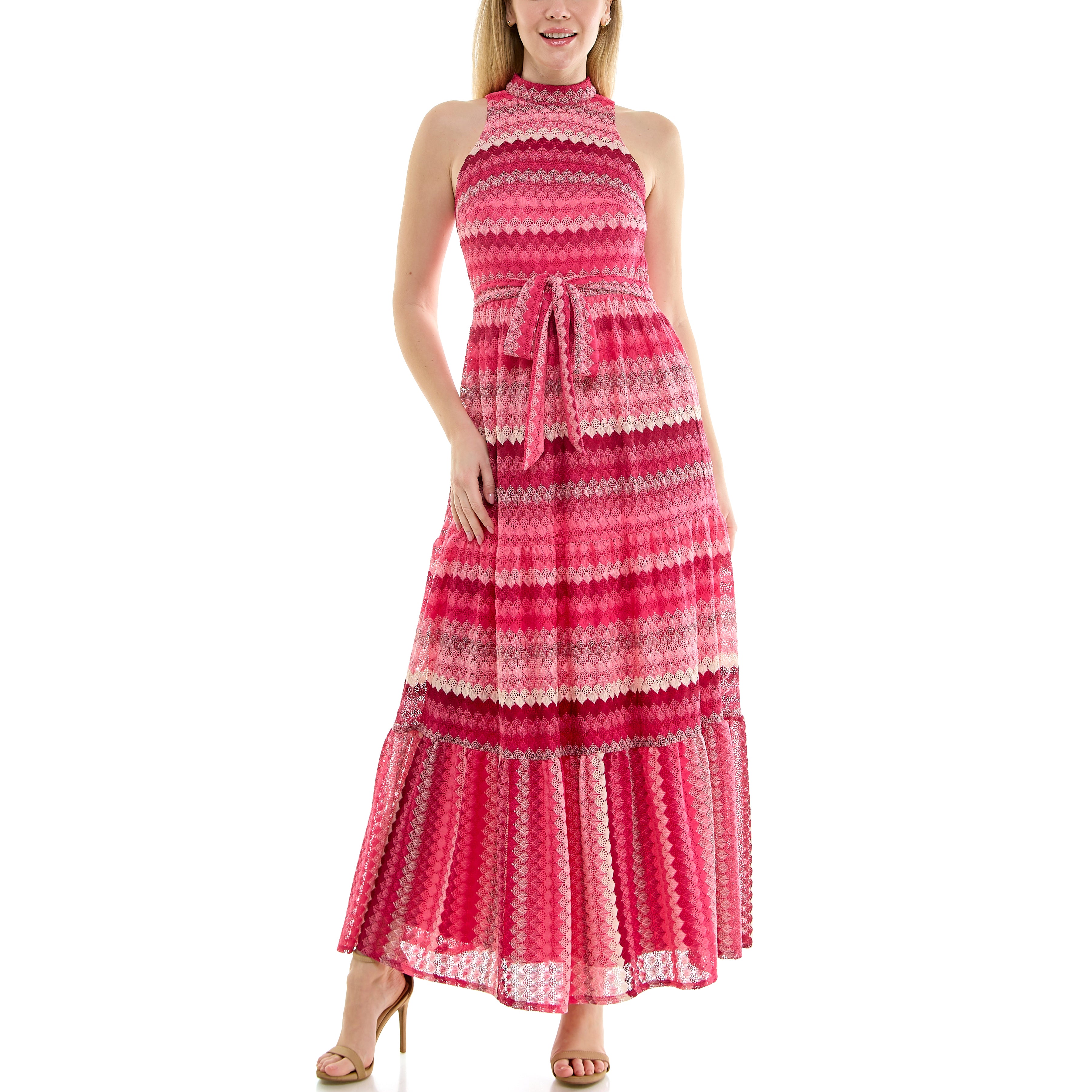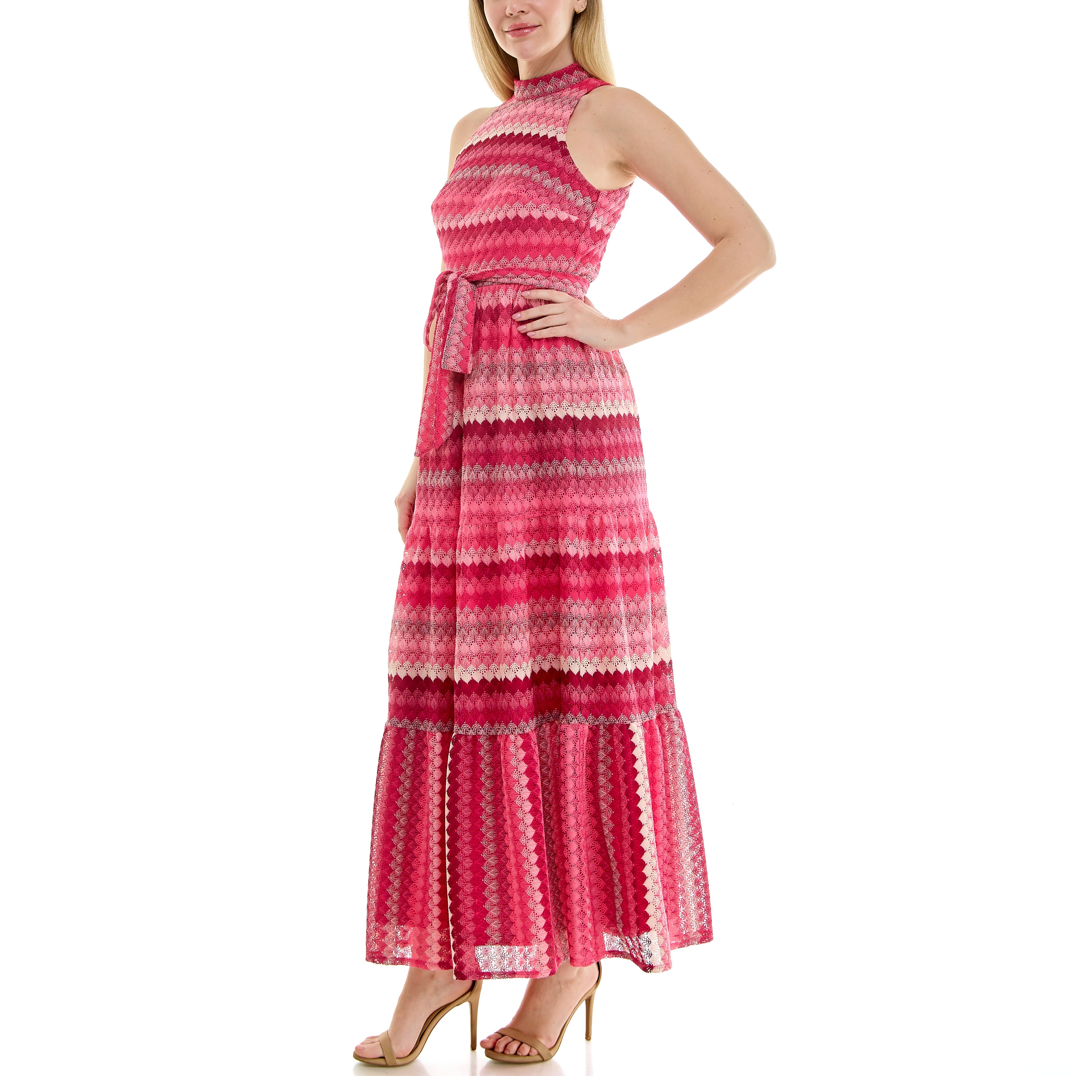 MAISON TARA SLEEVELESS MIXED PRINT BELTED HALTER MAXI DRESS - EXCHANGES ONLY