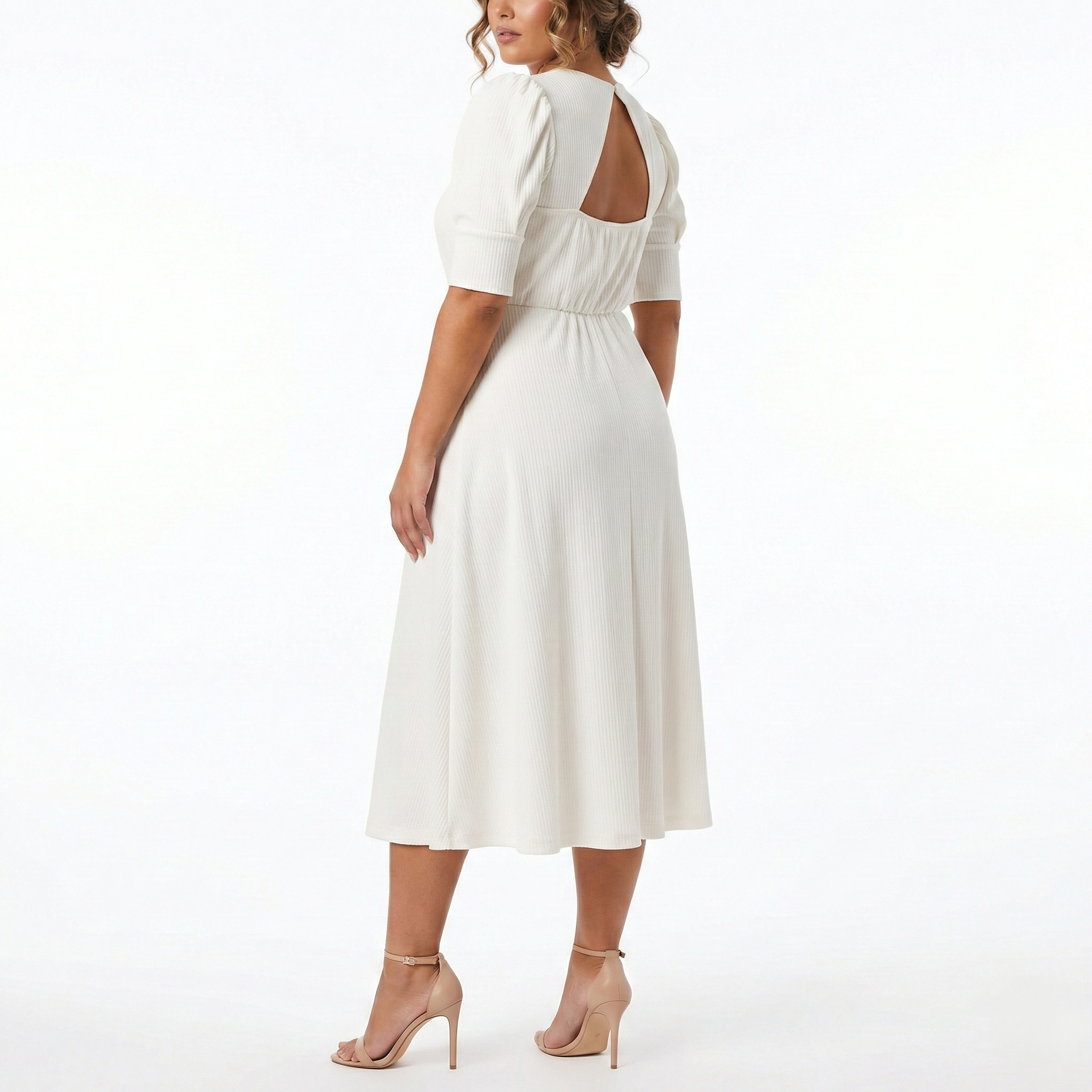 Ivory Ribbed Midi Dress with Puff Sleeves & Open Back – Elegant A-Line Waist-Fitted Occasion Dress