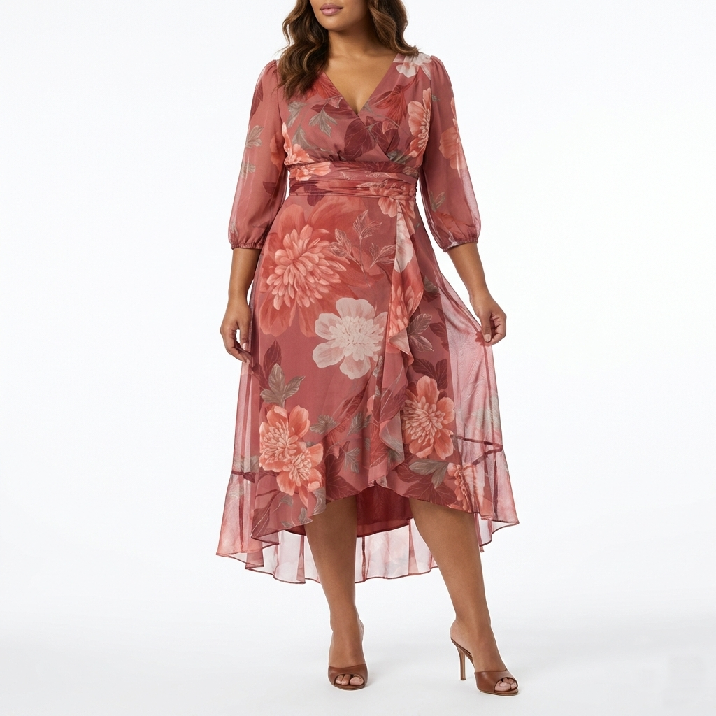 MAISON TARA MULTICOLOR FLORAL FAUX WRAP CHIFFON CURVE MAXI DRESS