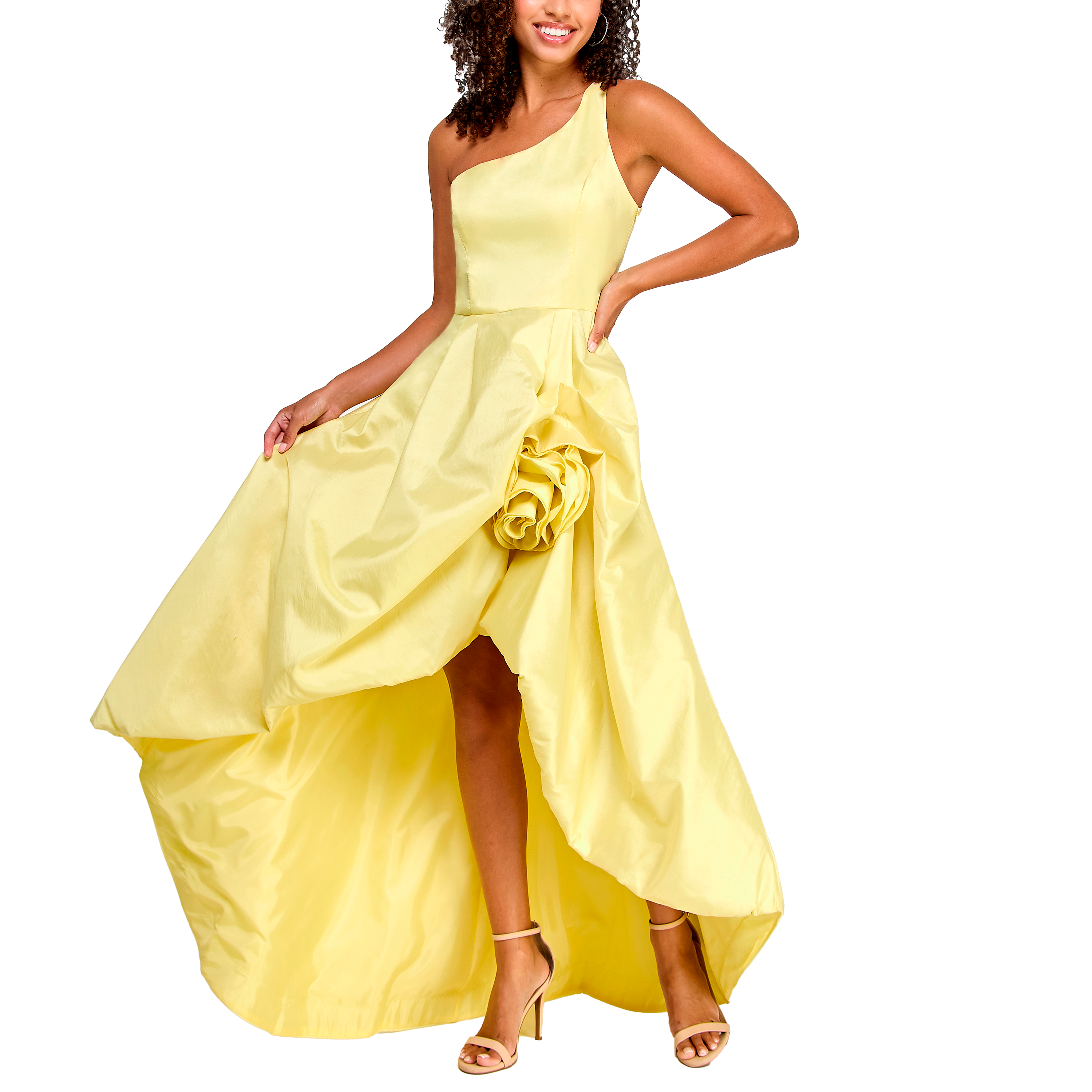 VIOLET WEEKEND JUNIORS' ONE SHOULDER TAFFETA HIGH LOW ROSETTE GOWN