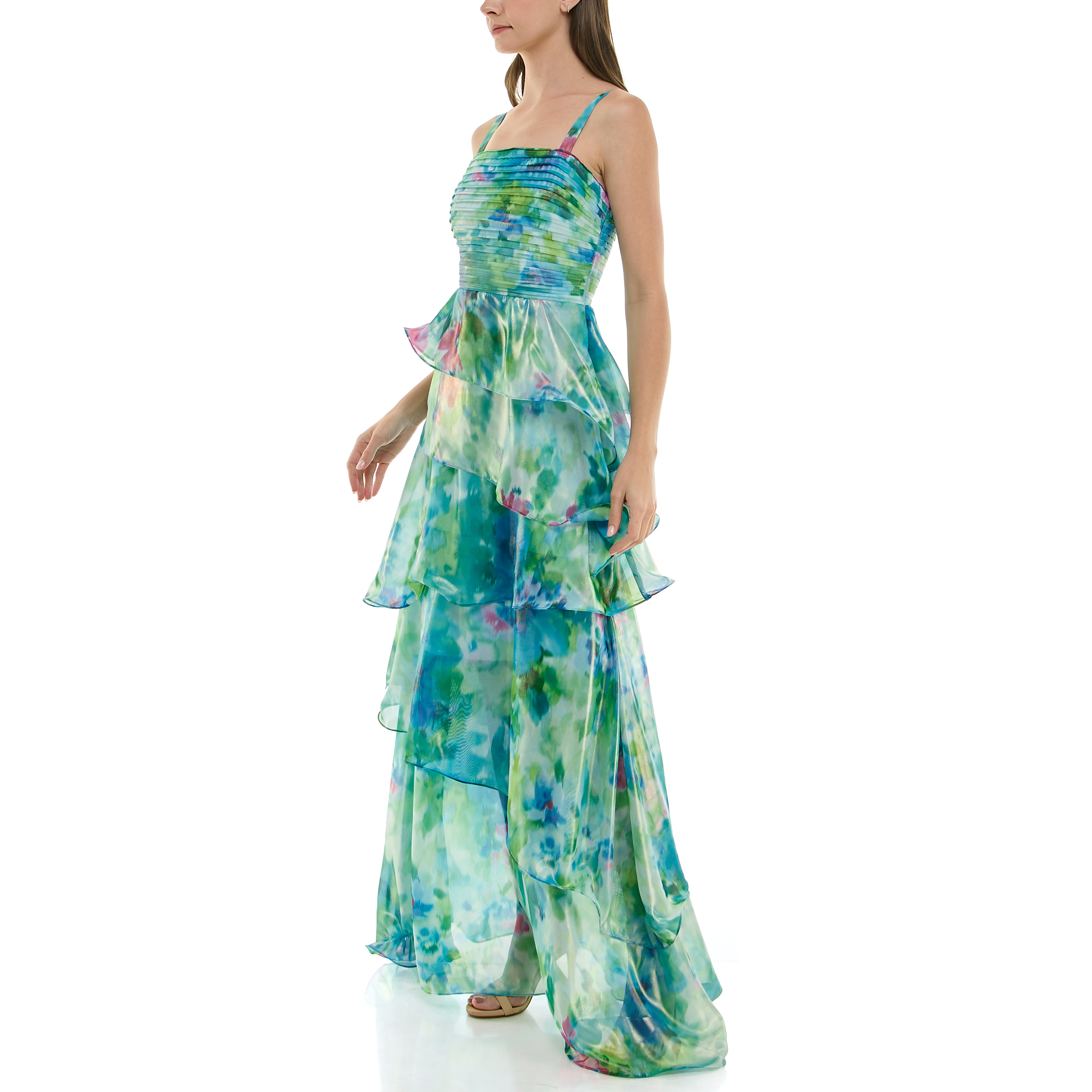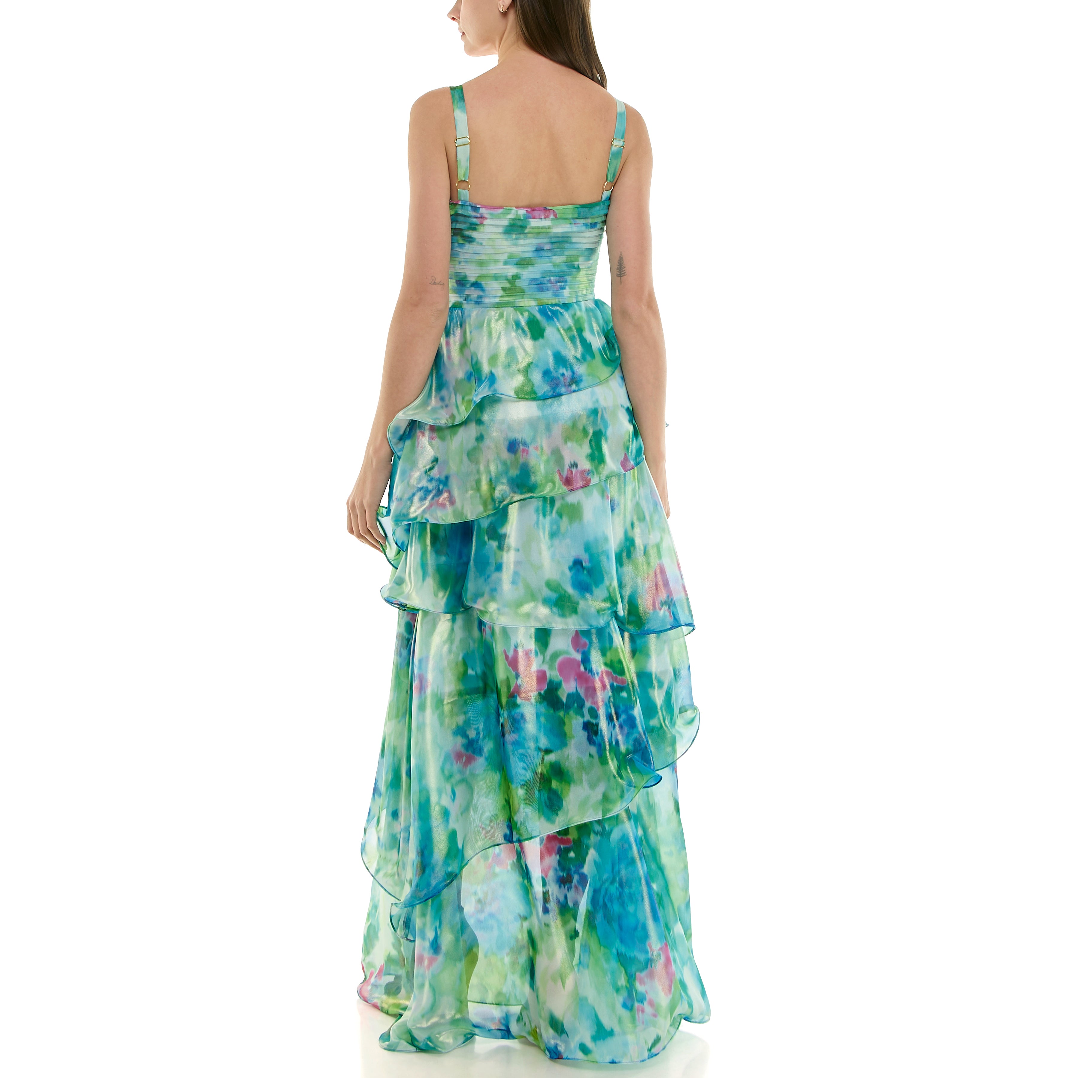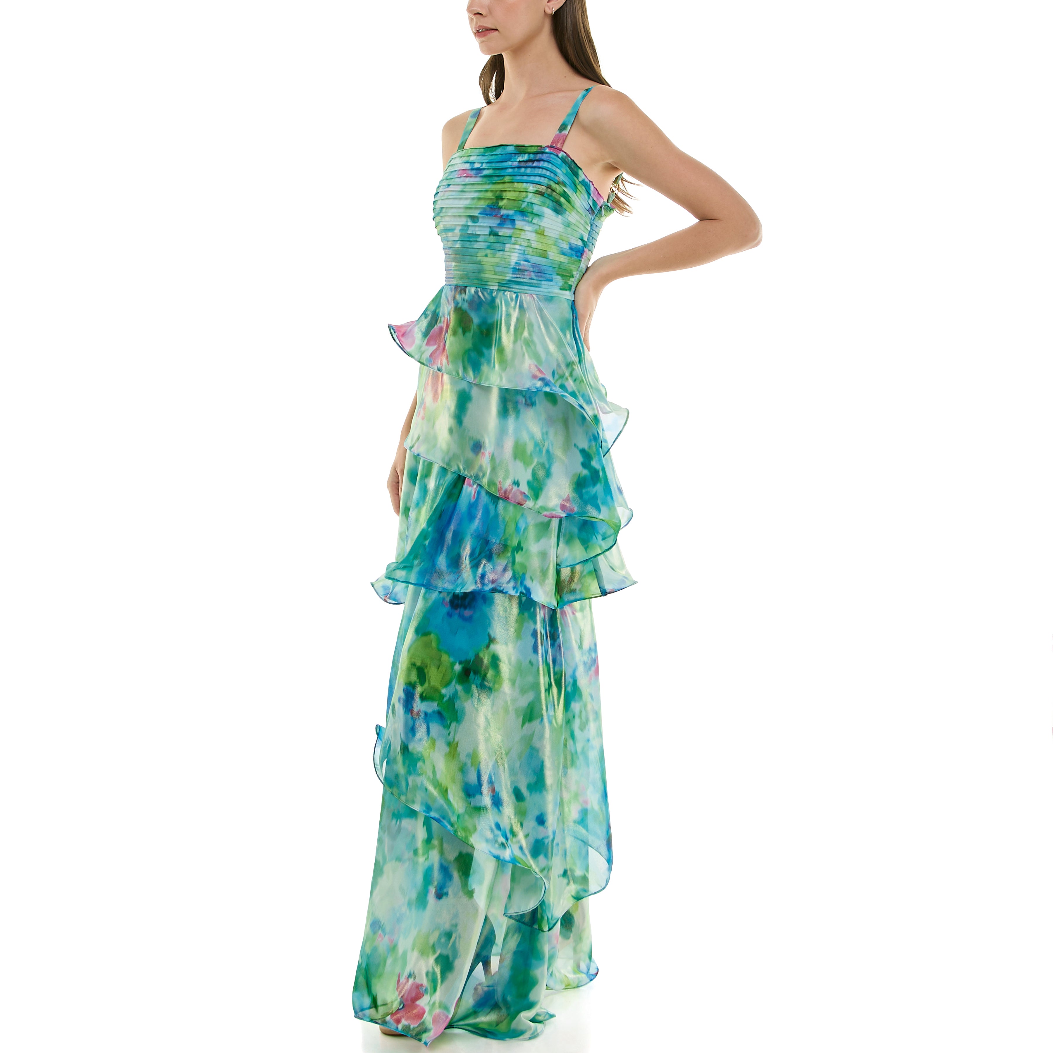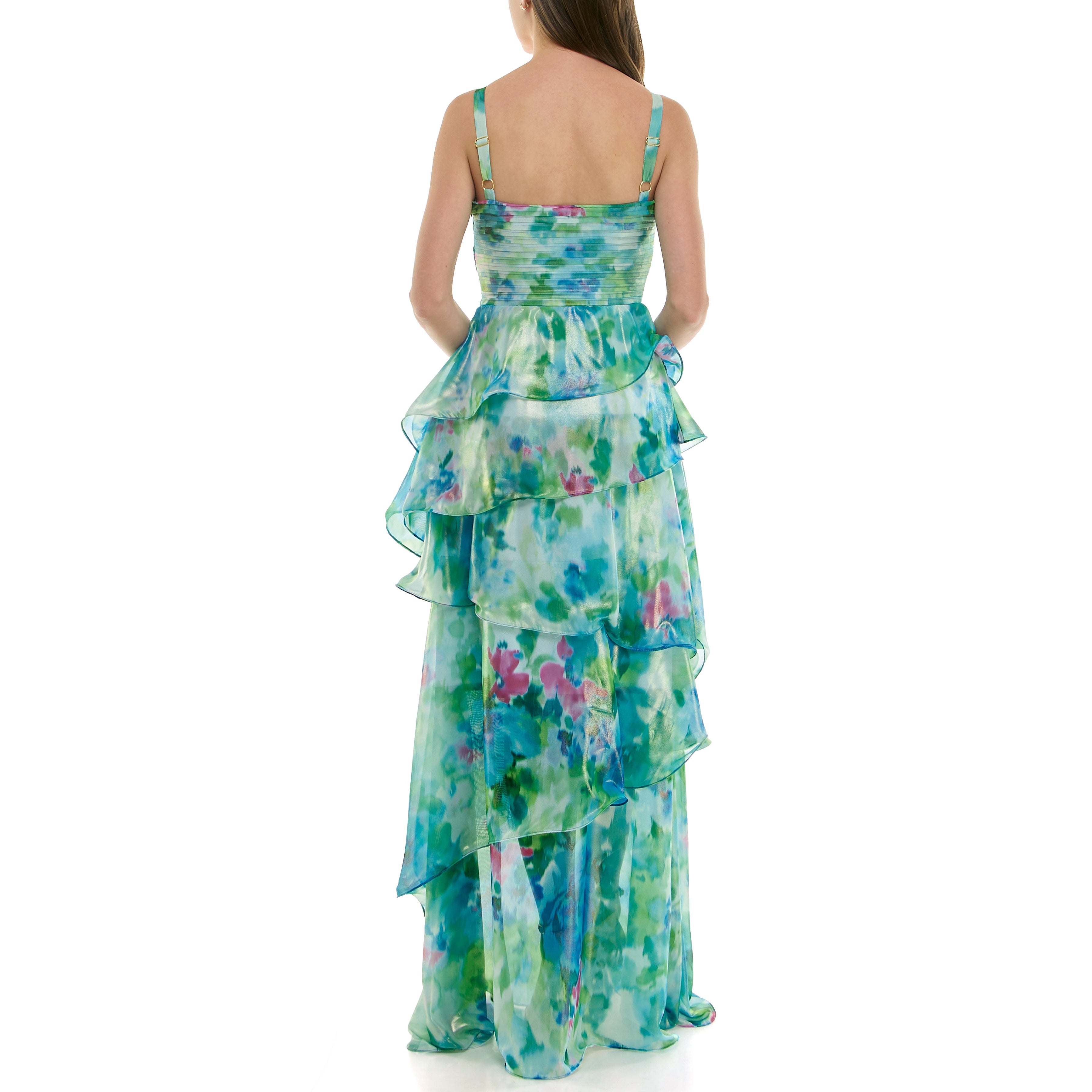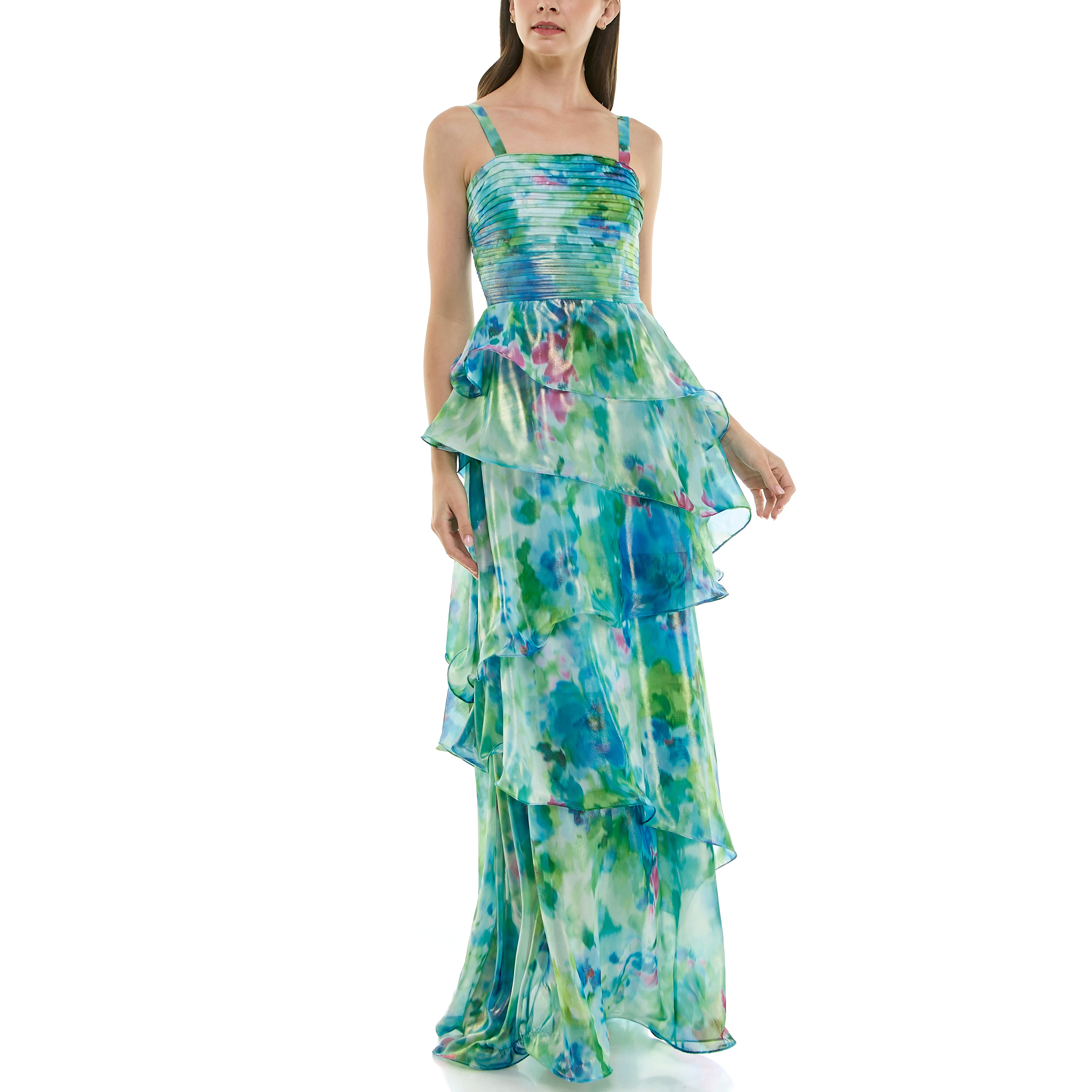 TAYLOR WATERCOLOR FLORAL PRINT PLEATED BODICE TIERED RUFFLED CHIFFON GOWN
