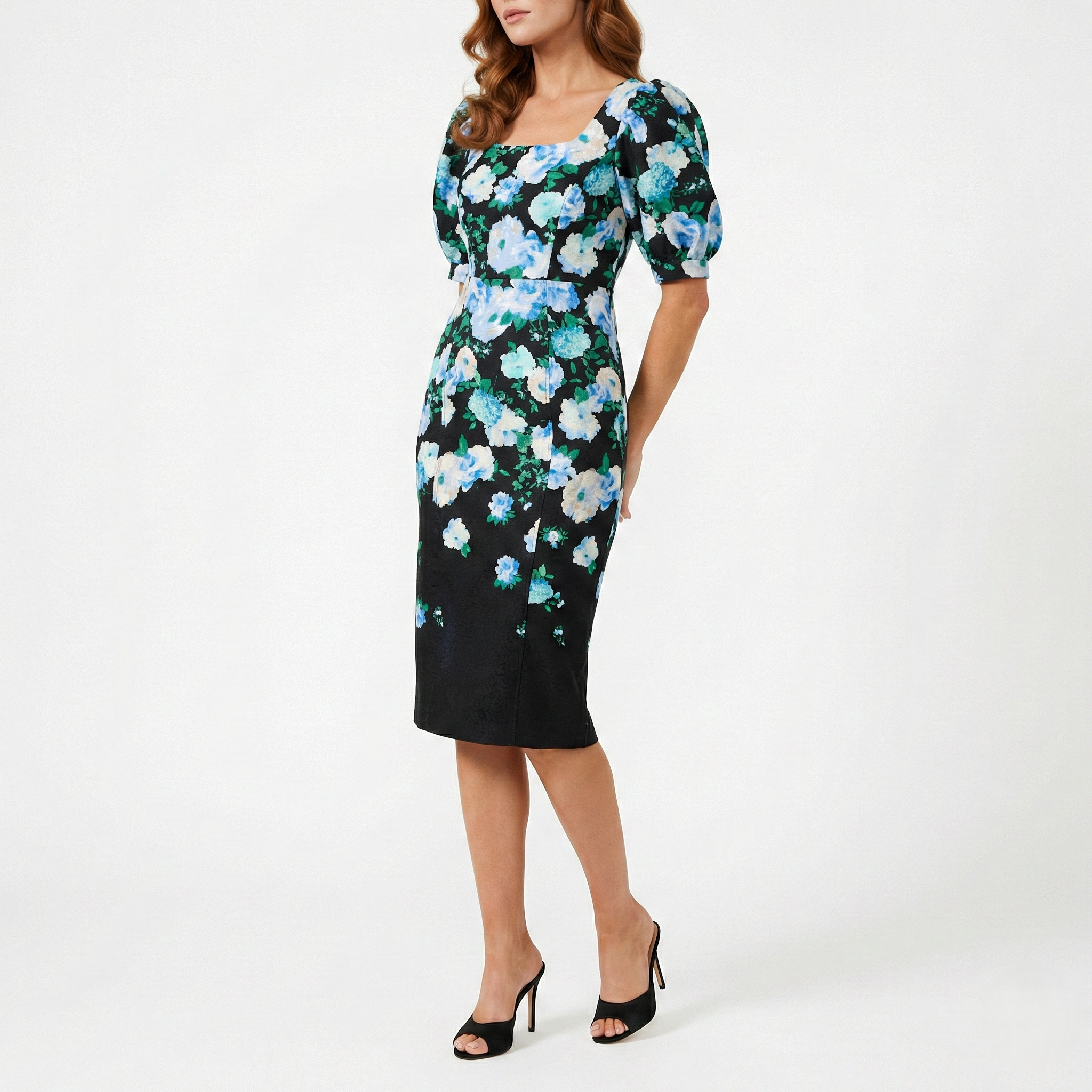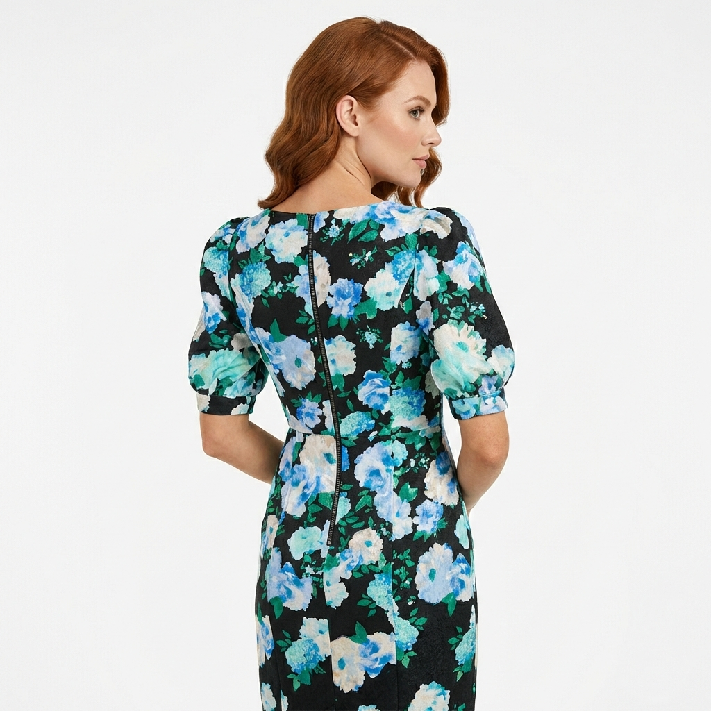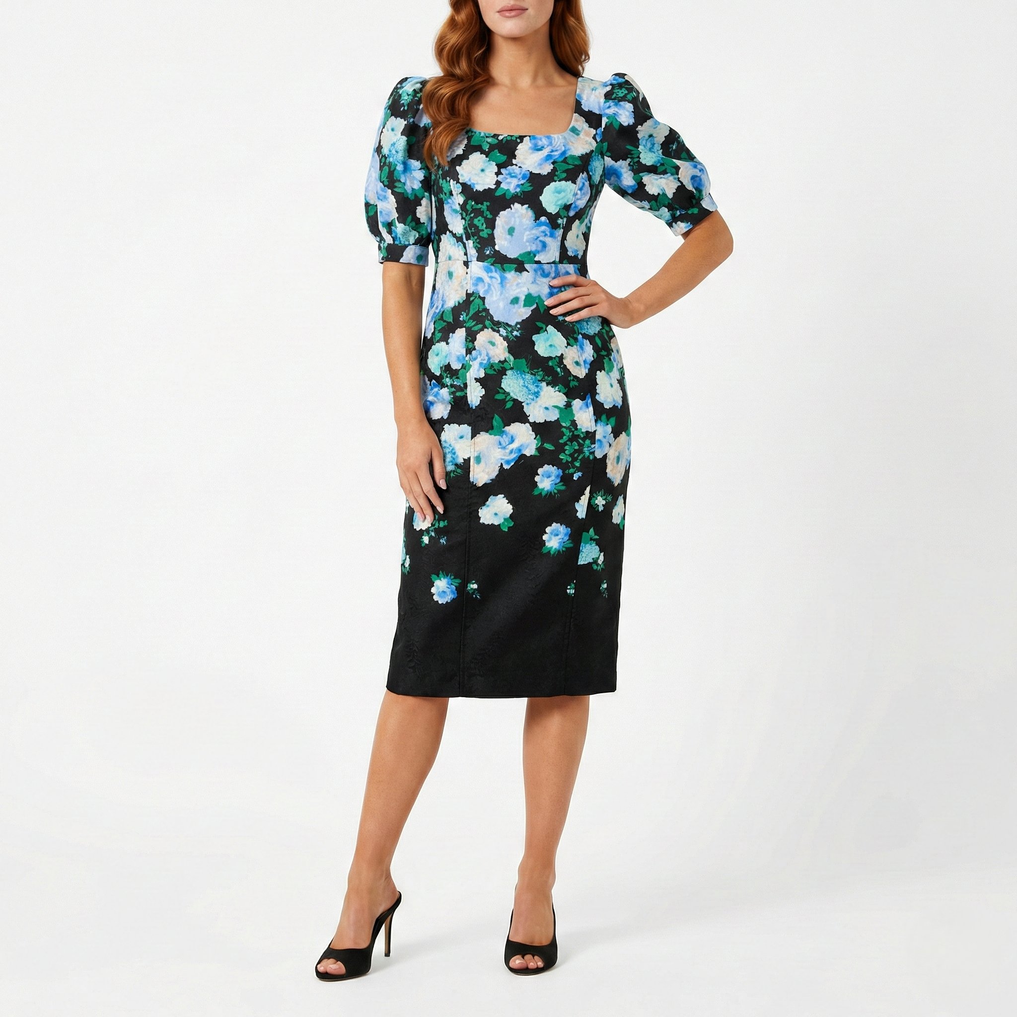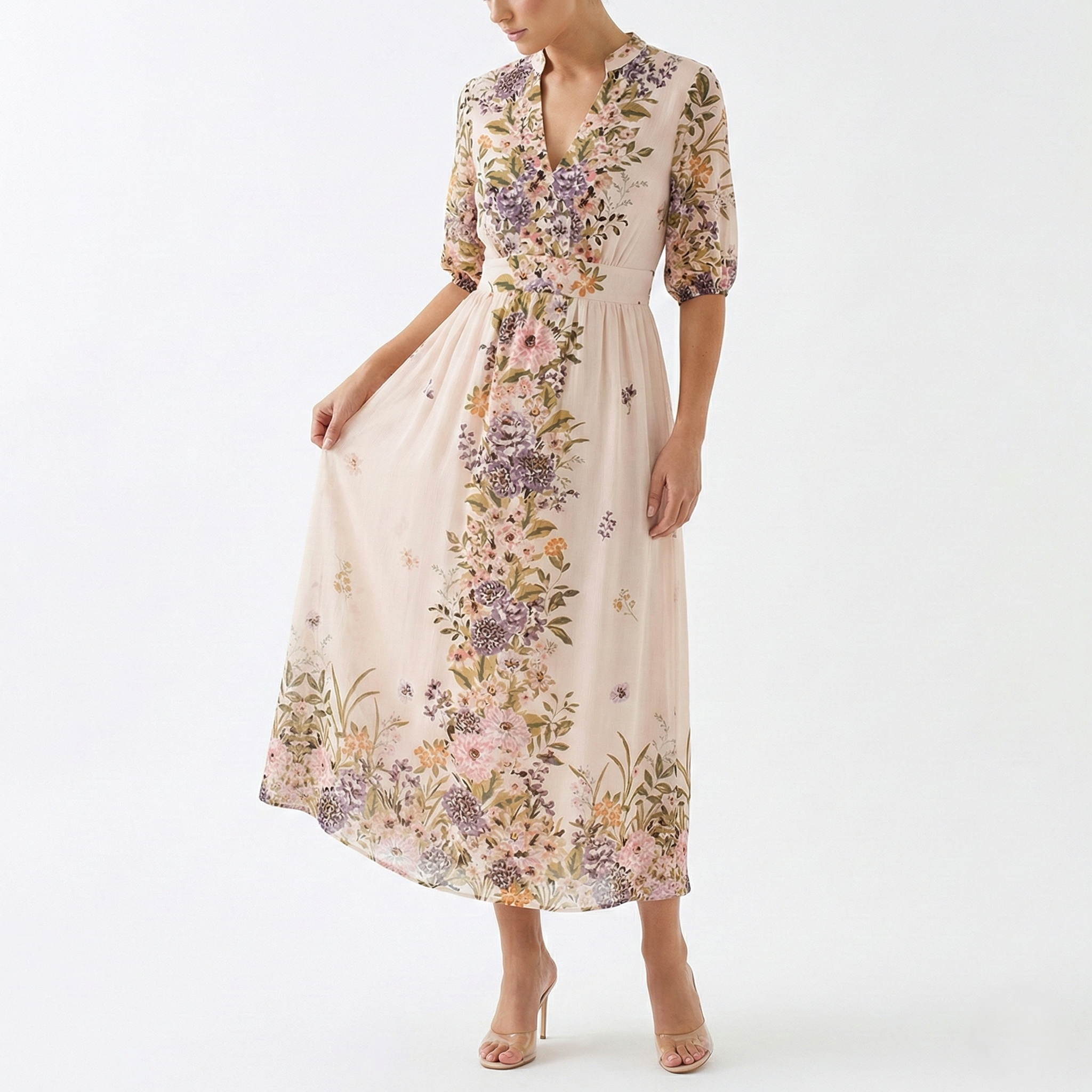 Romantic Floral Midi Dress for Women | Cream Botanical Print V-Neck Puff Sleeve A-Line Dress