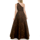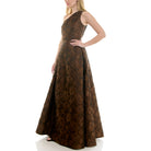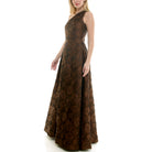 Lined sleeveless floor length evening gown with asymmetrical neckline, brocade flower print, gemstone embellishment on right hip, hidden side pockets, and back zip closure.