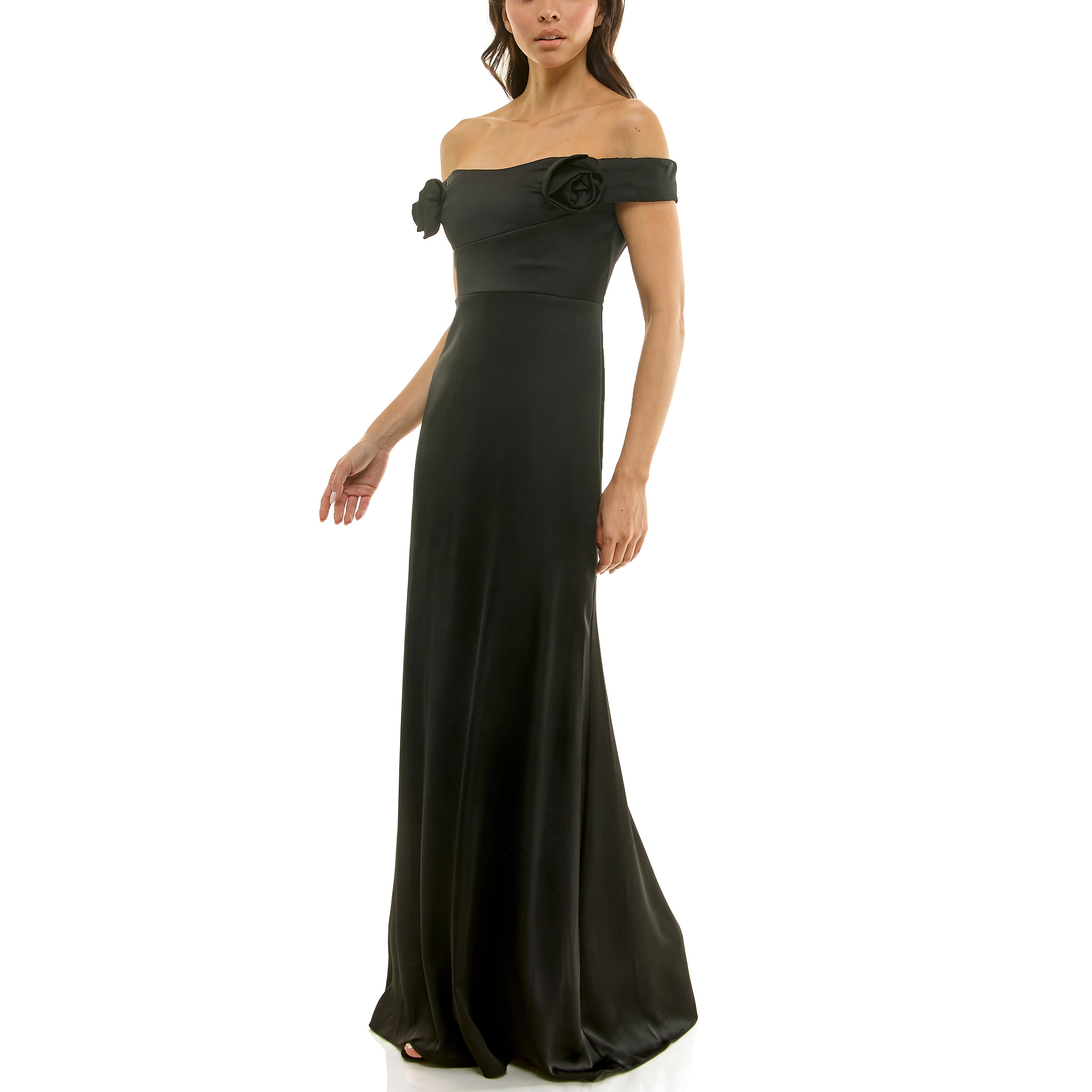Lined off-the-shoulder floor-length evening gown with rosette side appliques, asymmetrically darted bodice, trumpet hem, and back zip closure.