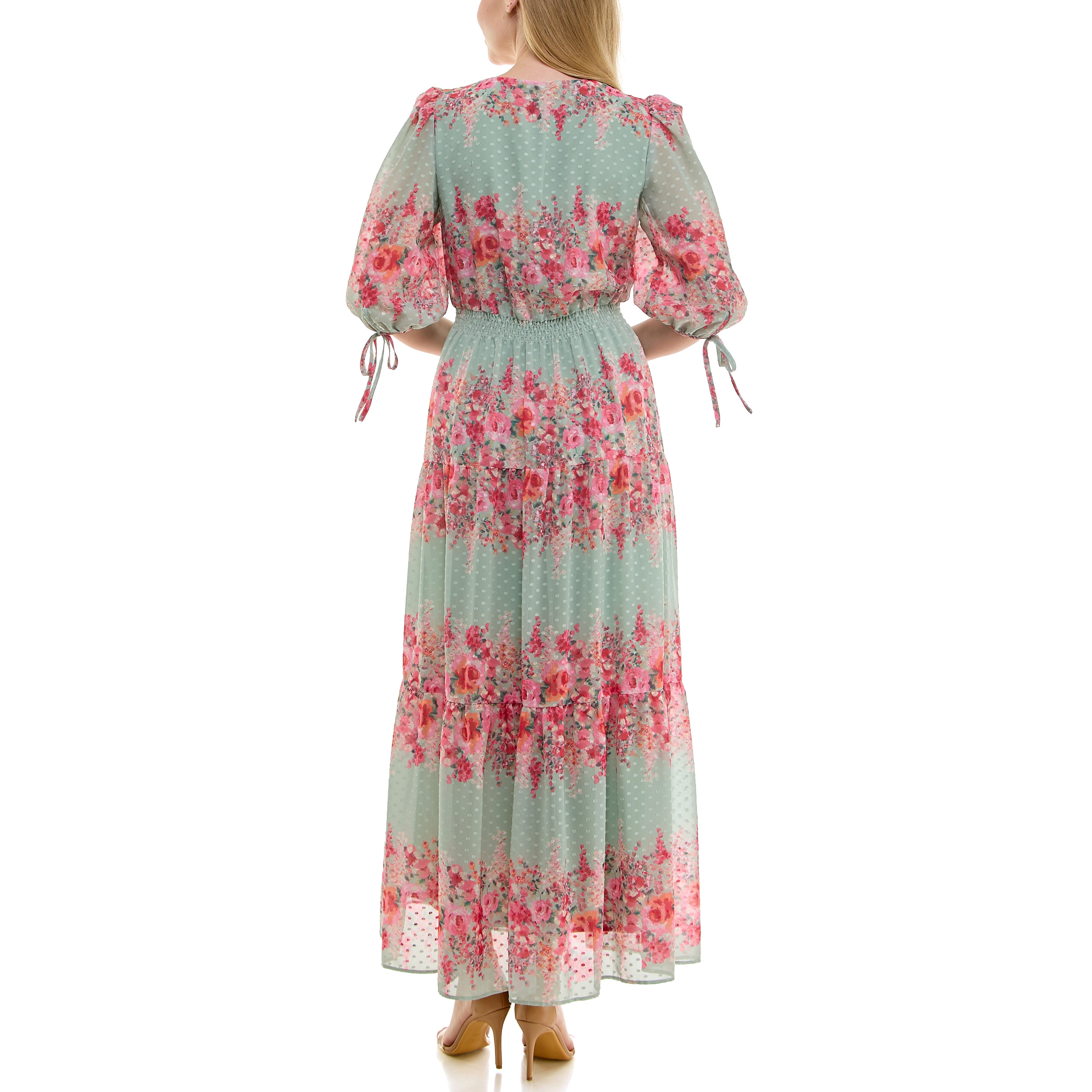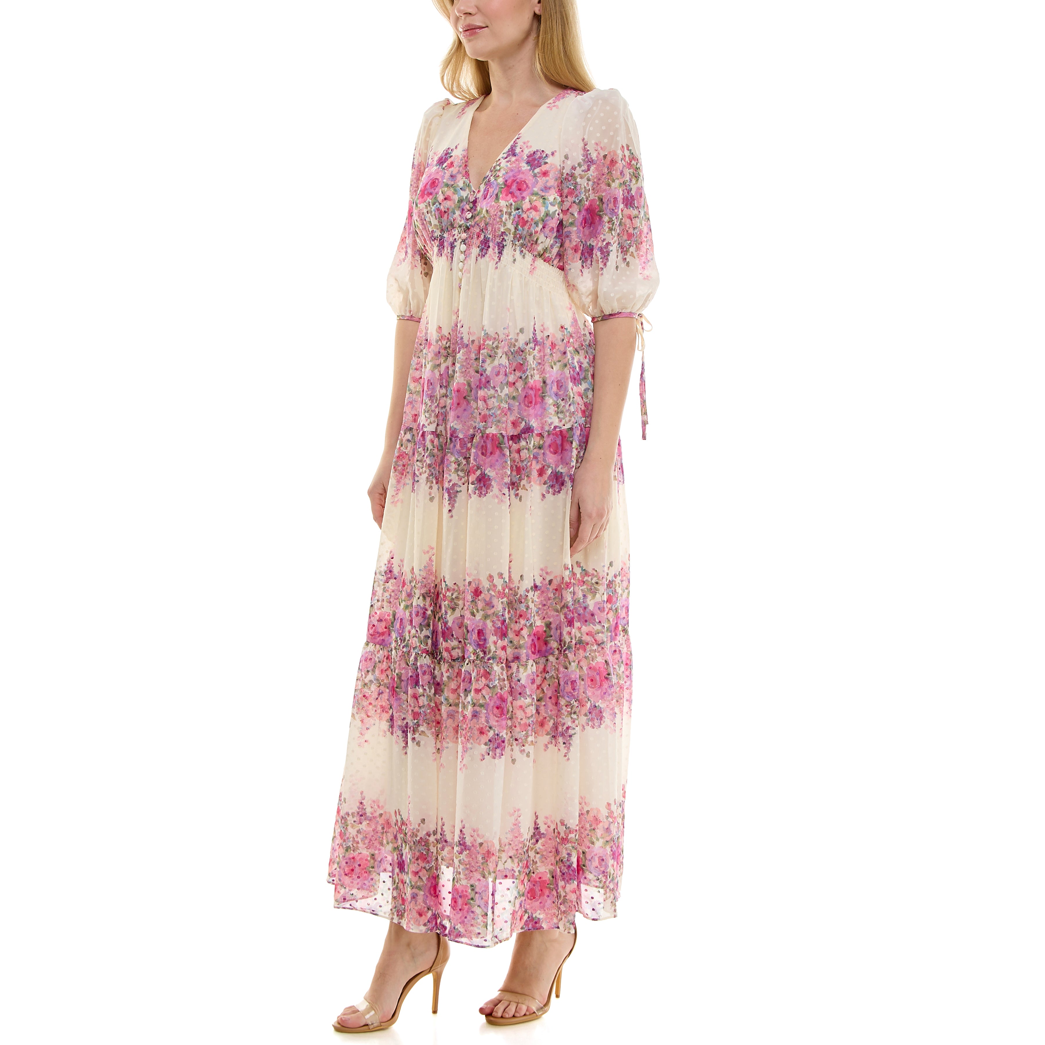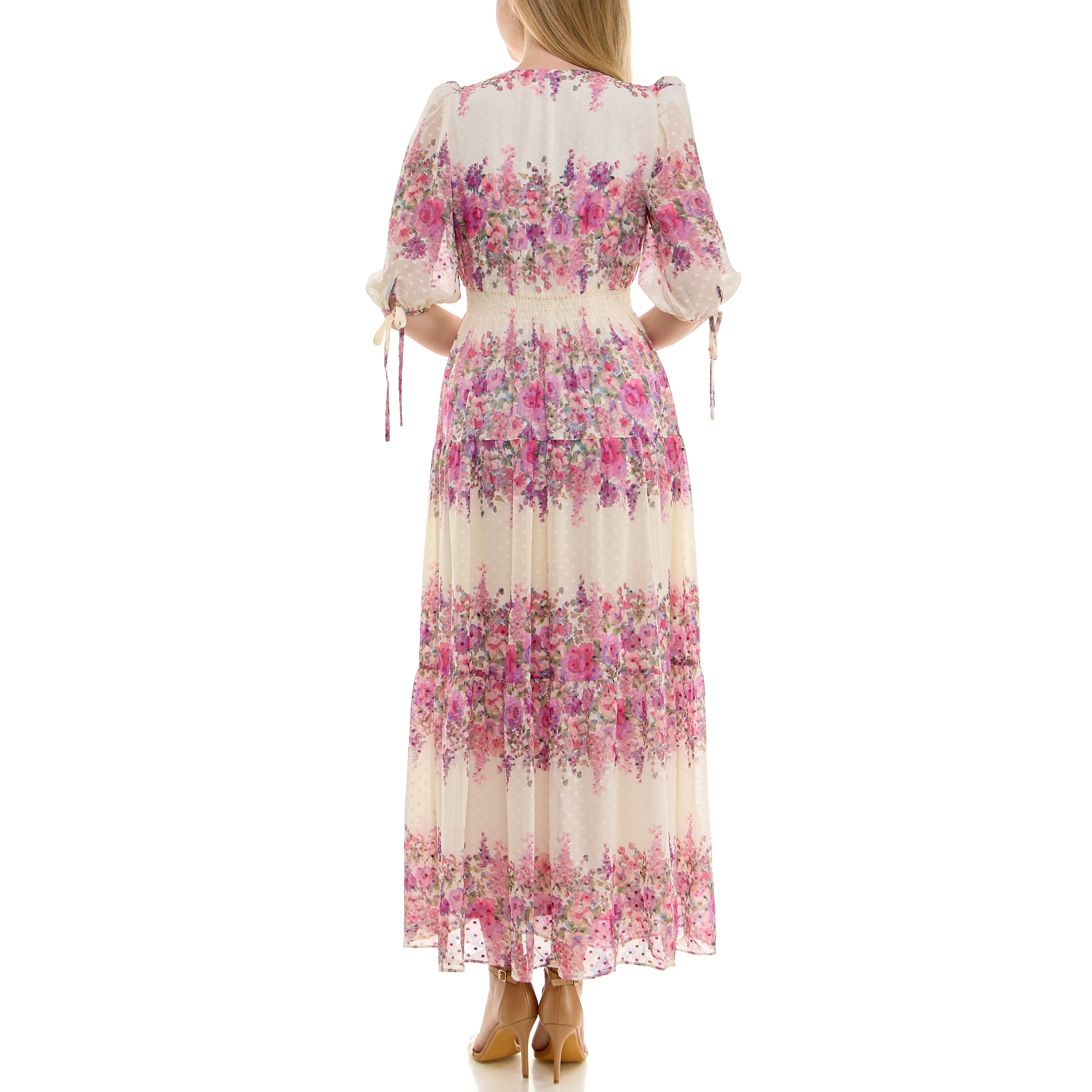 Lined pullover maxi dress with elbow length set-in sleeves, V-neckline, violet/lavender/pink rose flower pattern, and smocked waist.