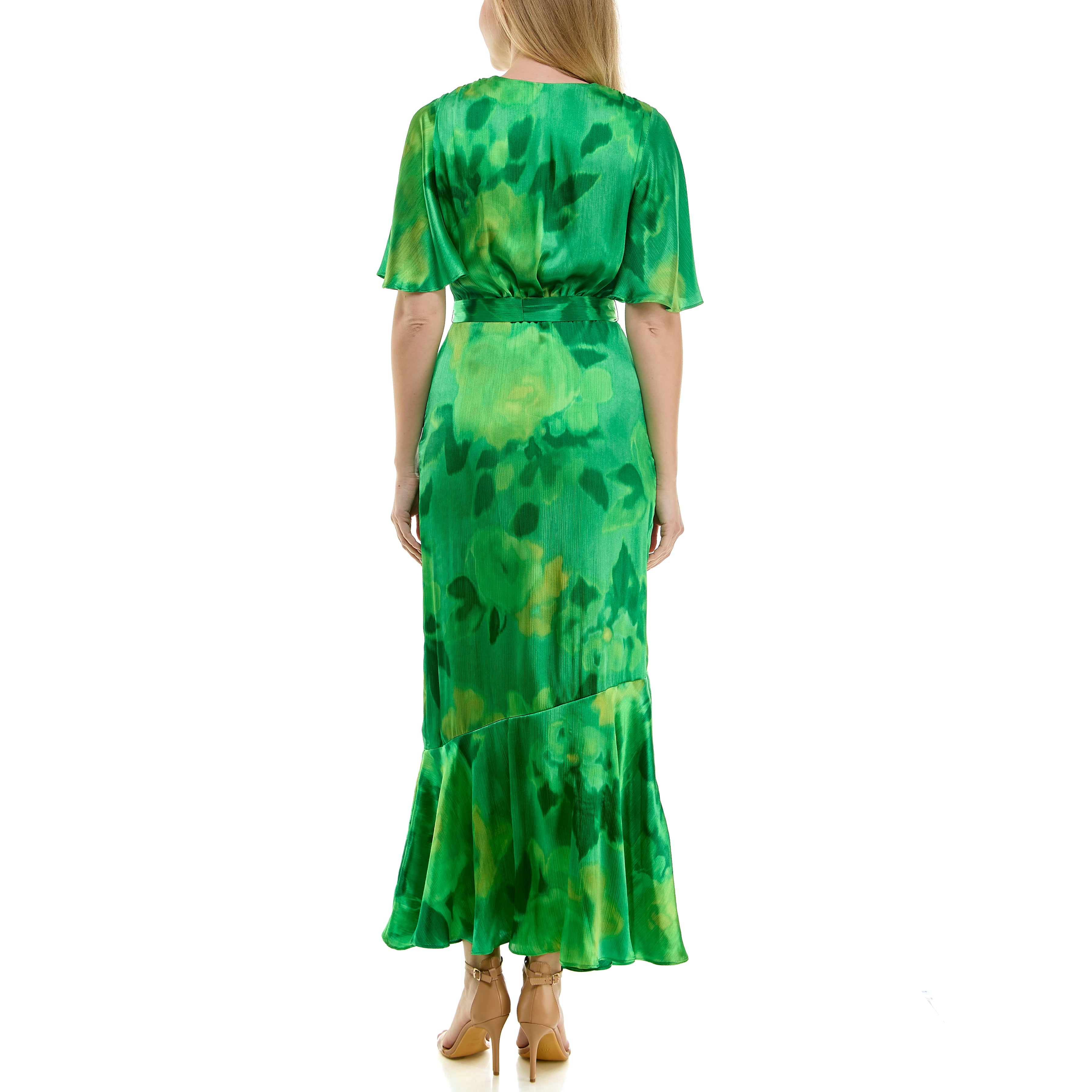 Lined maxi dress with elbow-length flutter sleeves, floral leaf pattern, ribbon waist tie, surplice neckline, satin/silk construction, split tier asymmetrical ruffle hem, and side zip closure.