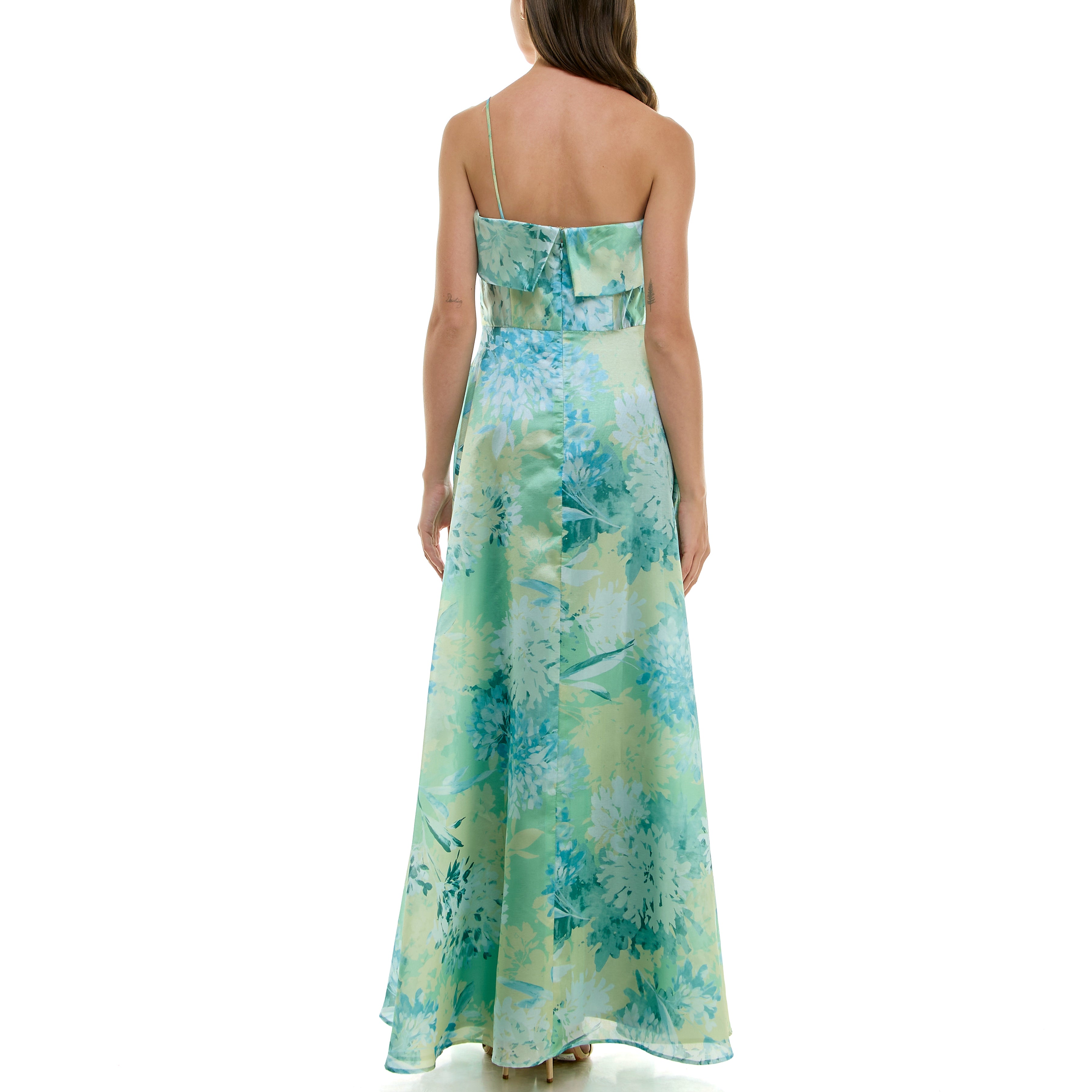 Lined organza sleeveless floor-length gown with singular bow-accented strap, fold-over rear accent, asymmetric neckline, flower print, and back zip closure.
