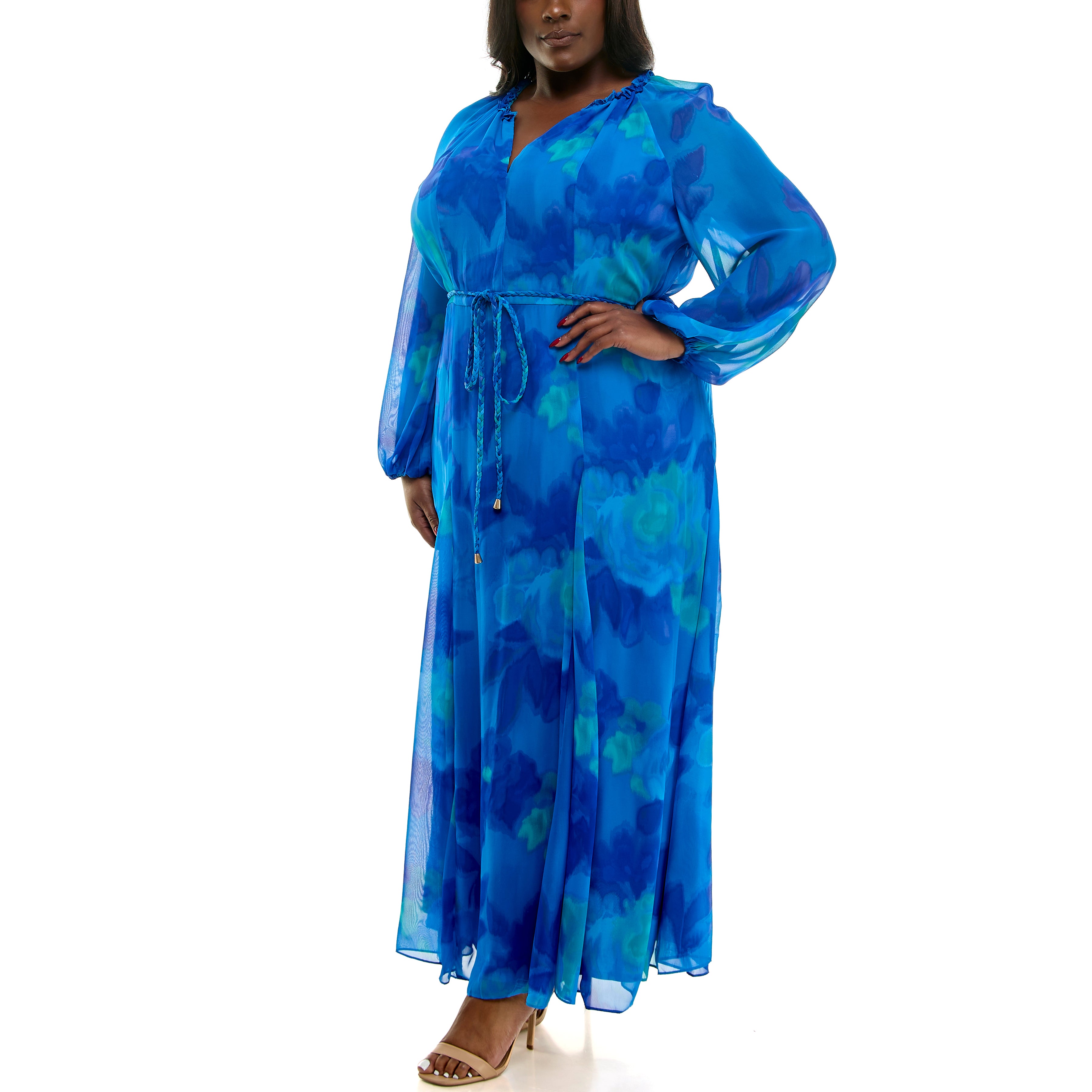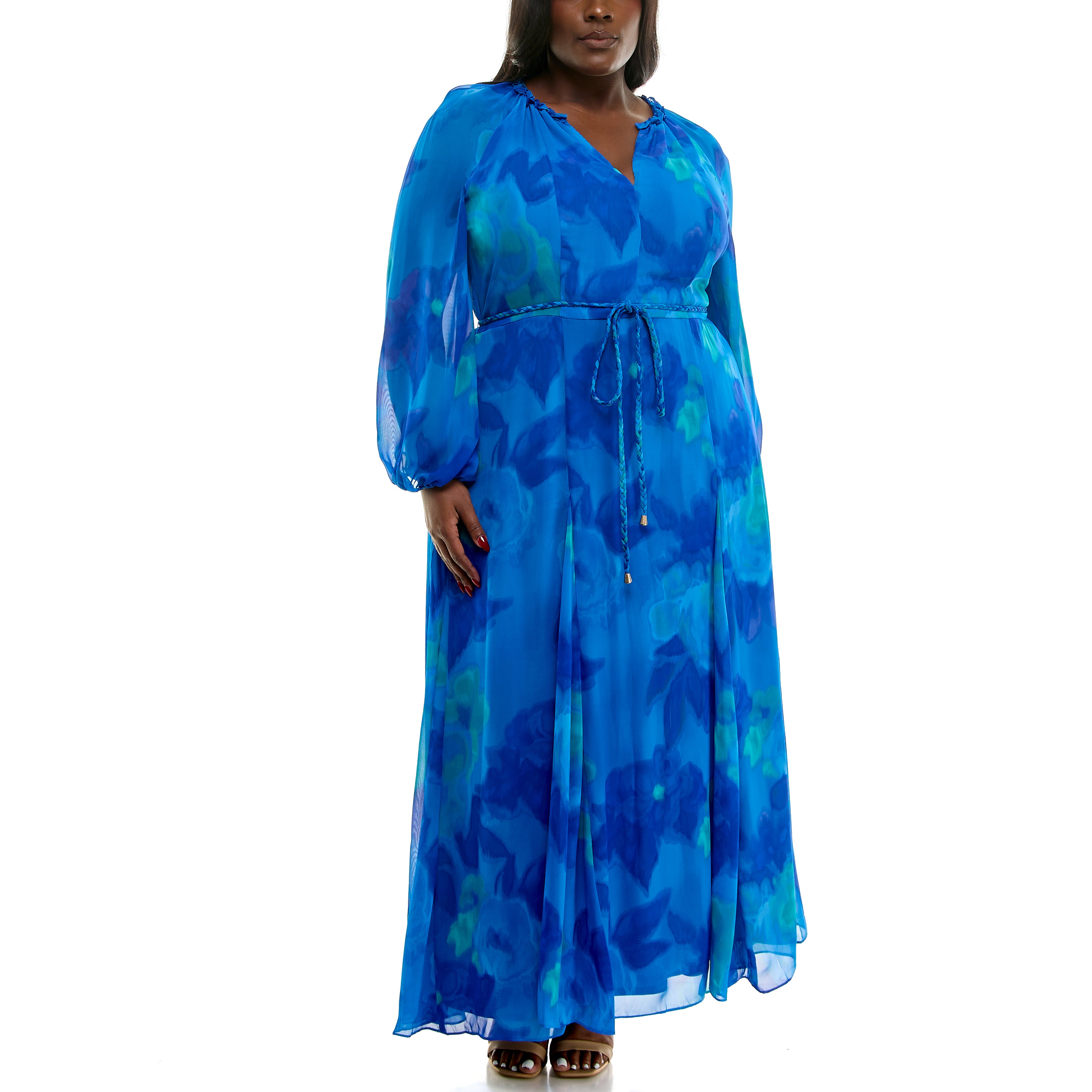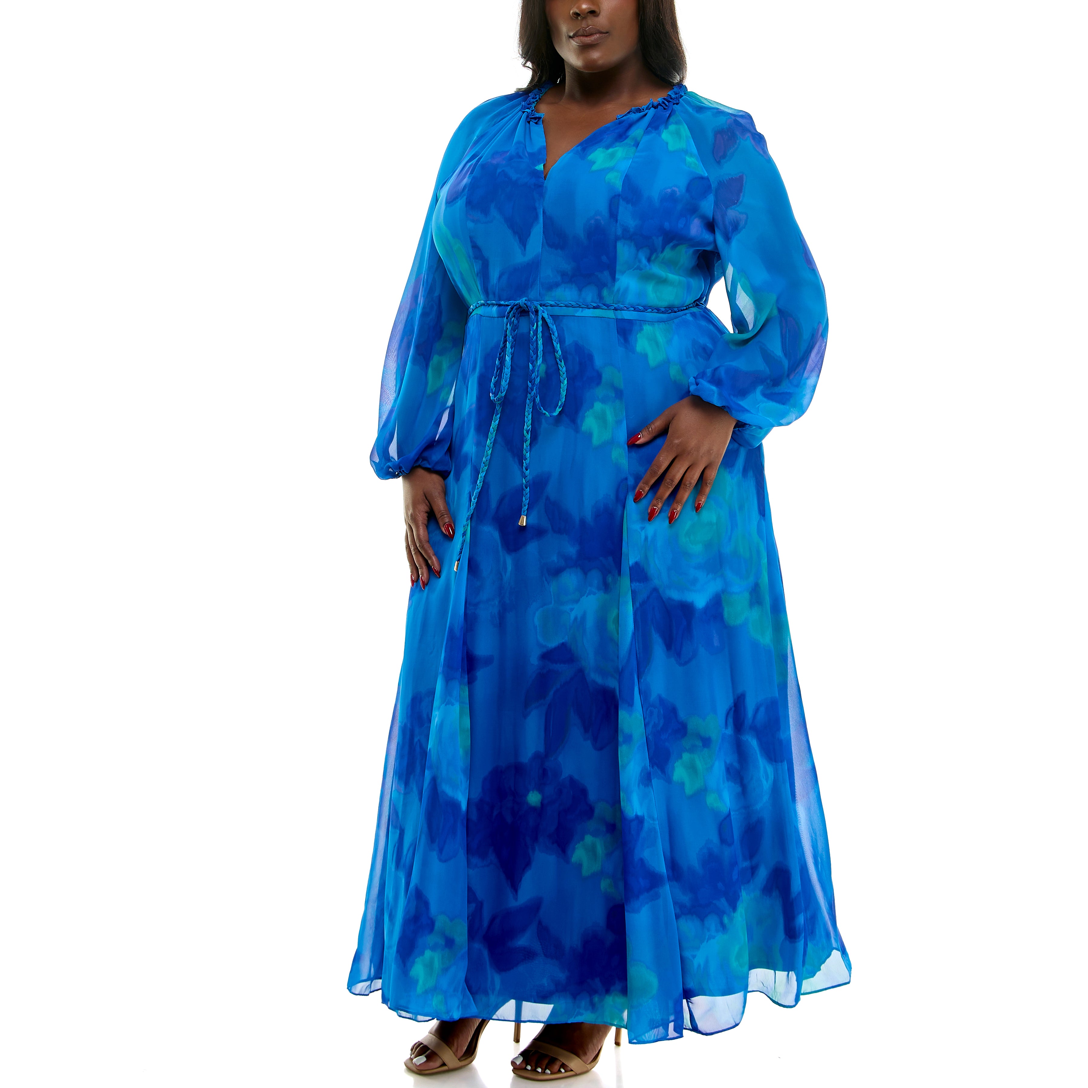 Lined long sleeved plus-size maxi dress with semi-sheer overlay, split V-neckline, blouson sleeves, ruffle collar embellishment, removable braided cord belt with gold aglets, and hidden side zip closure.