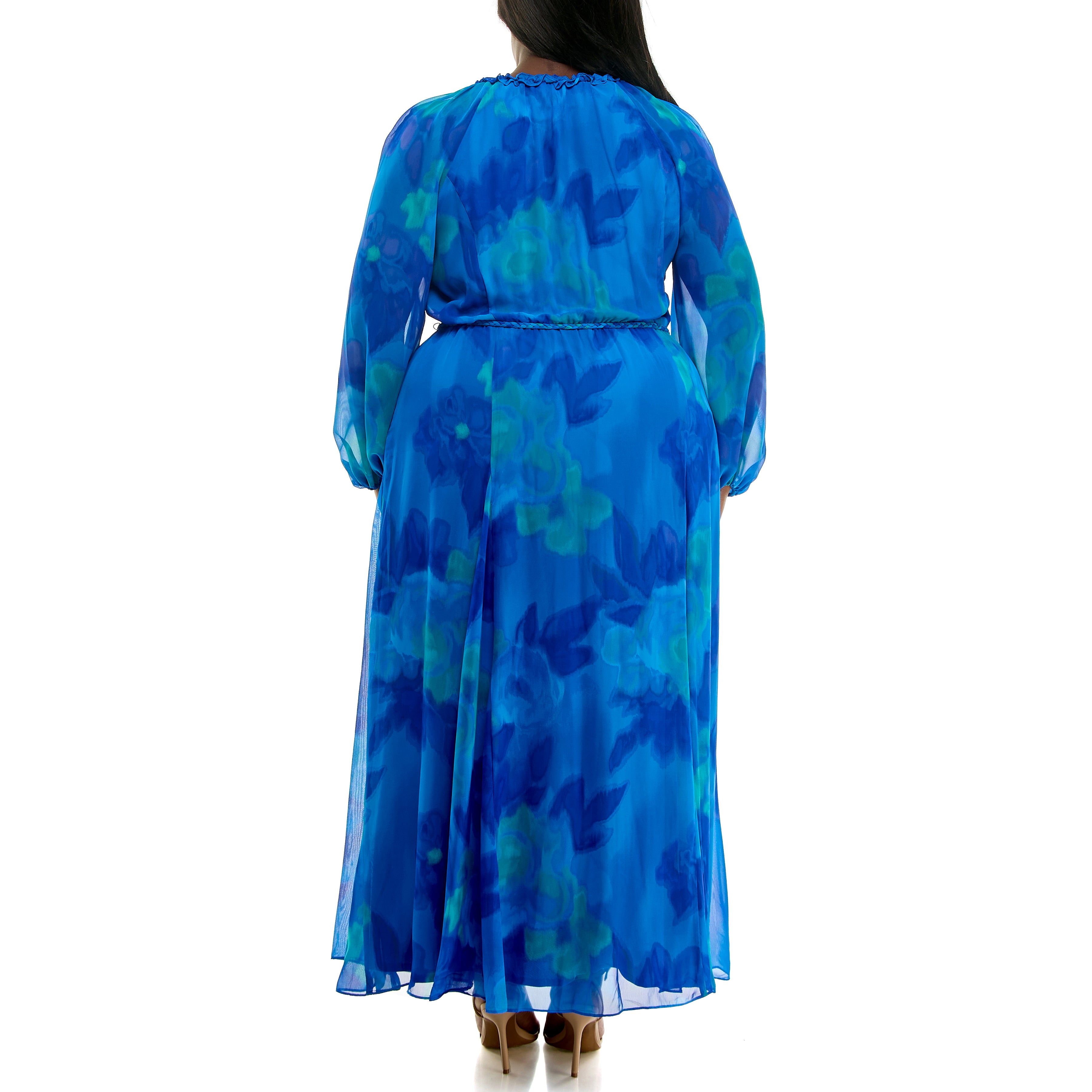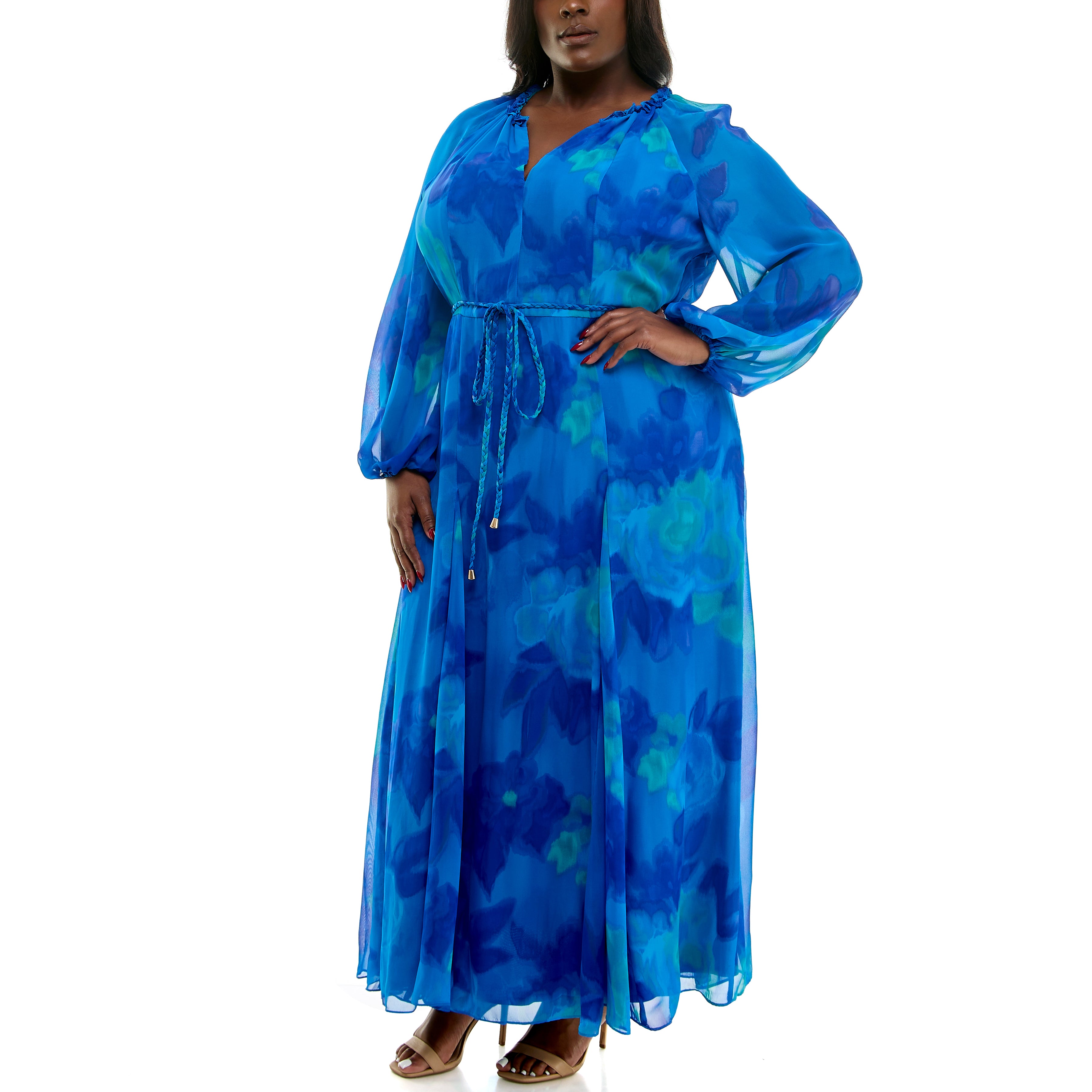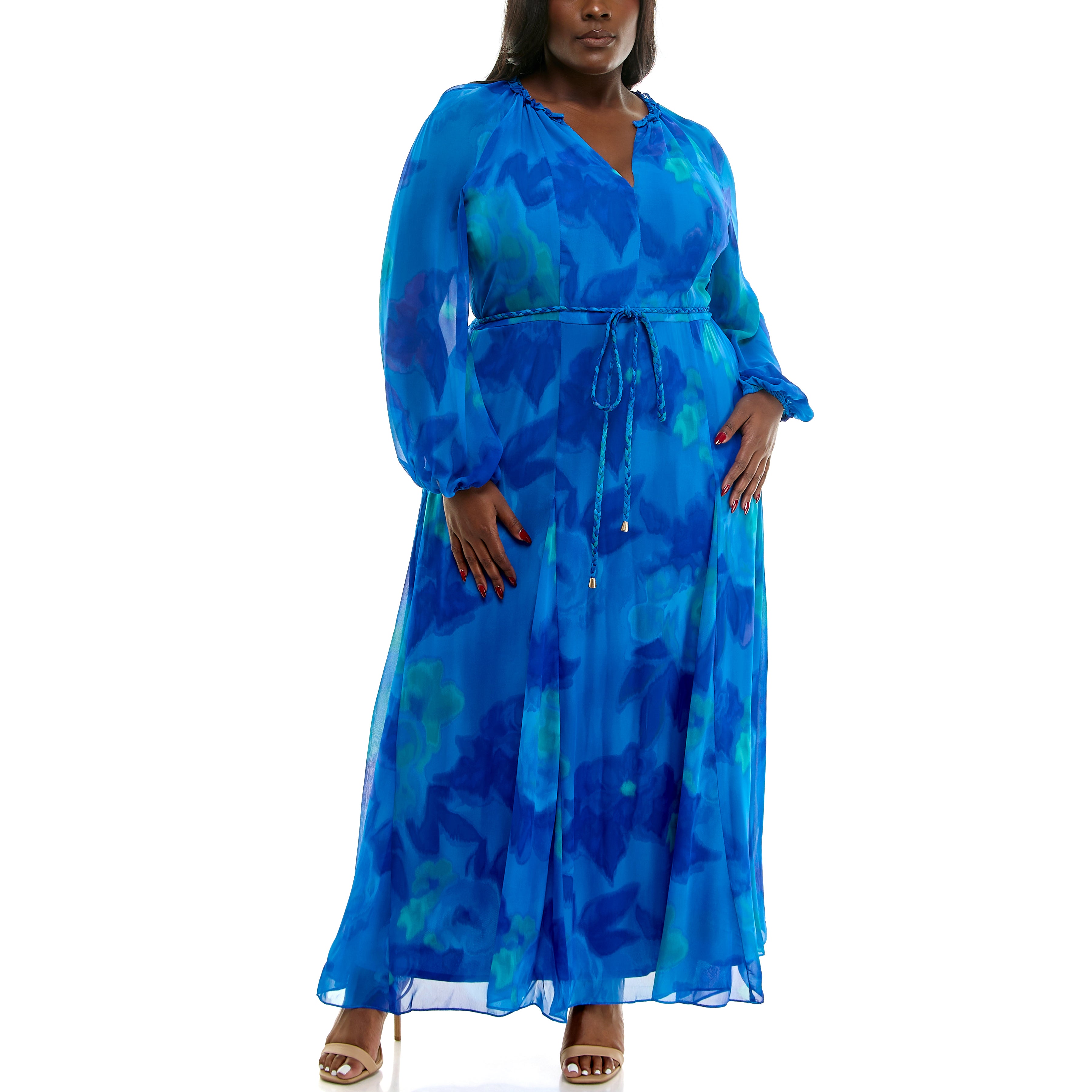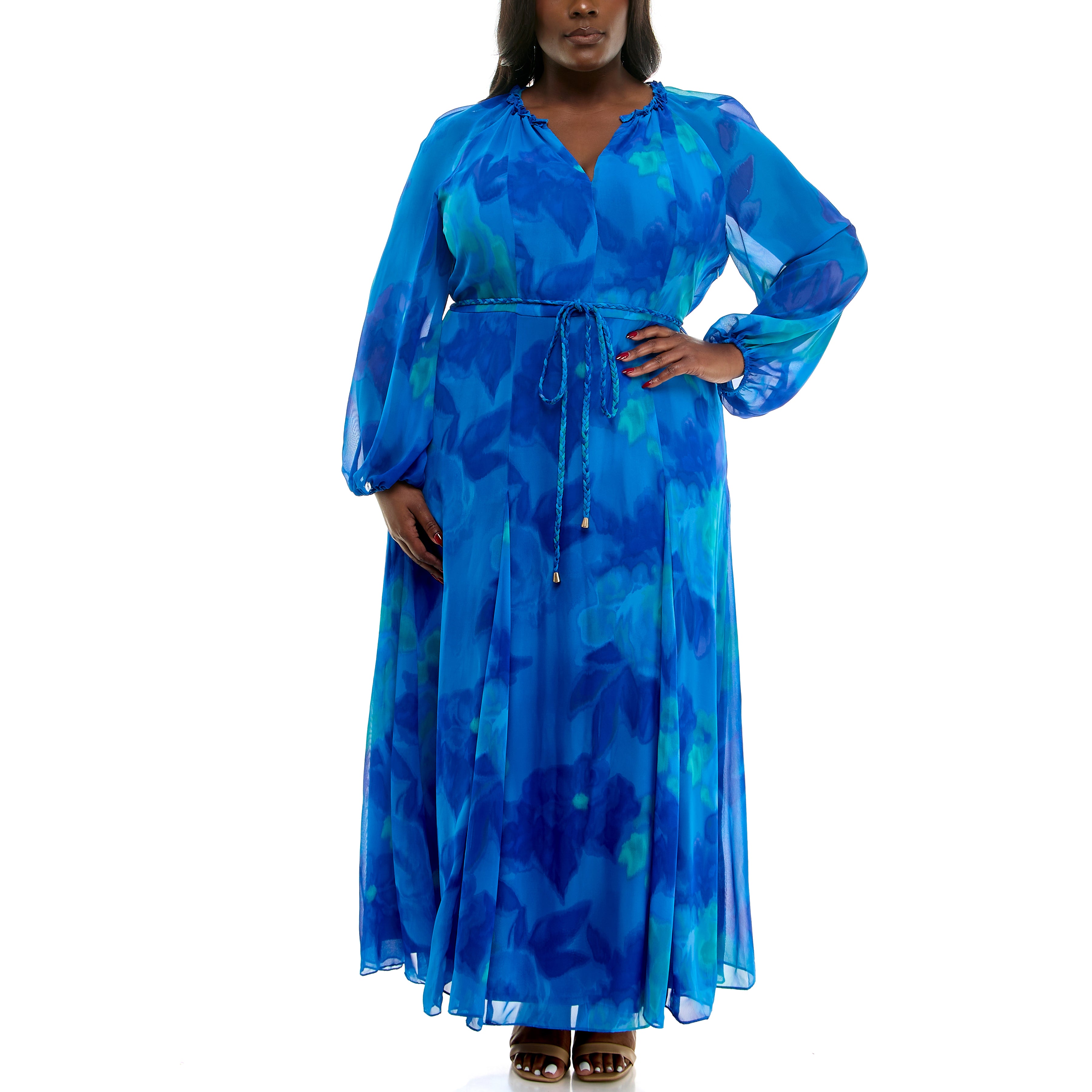 Lined long sleeved plus-size maxi dress with semi-sheer overlay, split V-neckline, blouson sleeves, ruffle collar embellishment, removable braided cord belt with gold aglets, and hidden side zip closure.