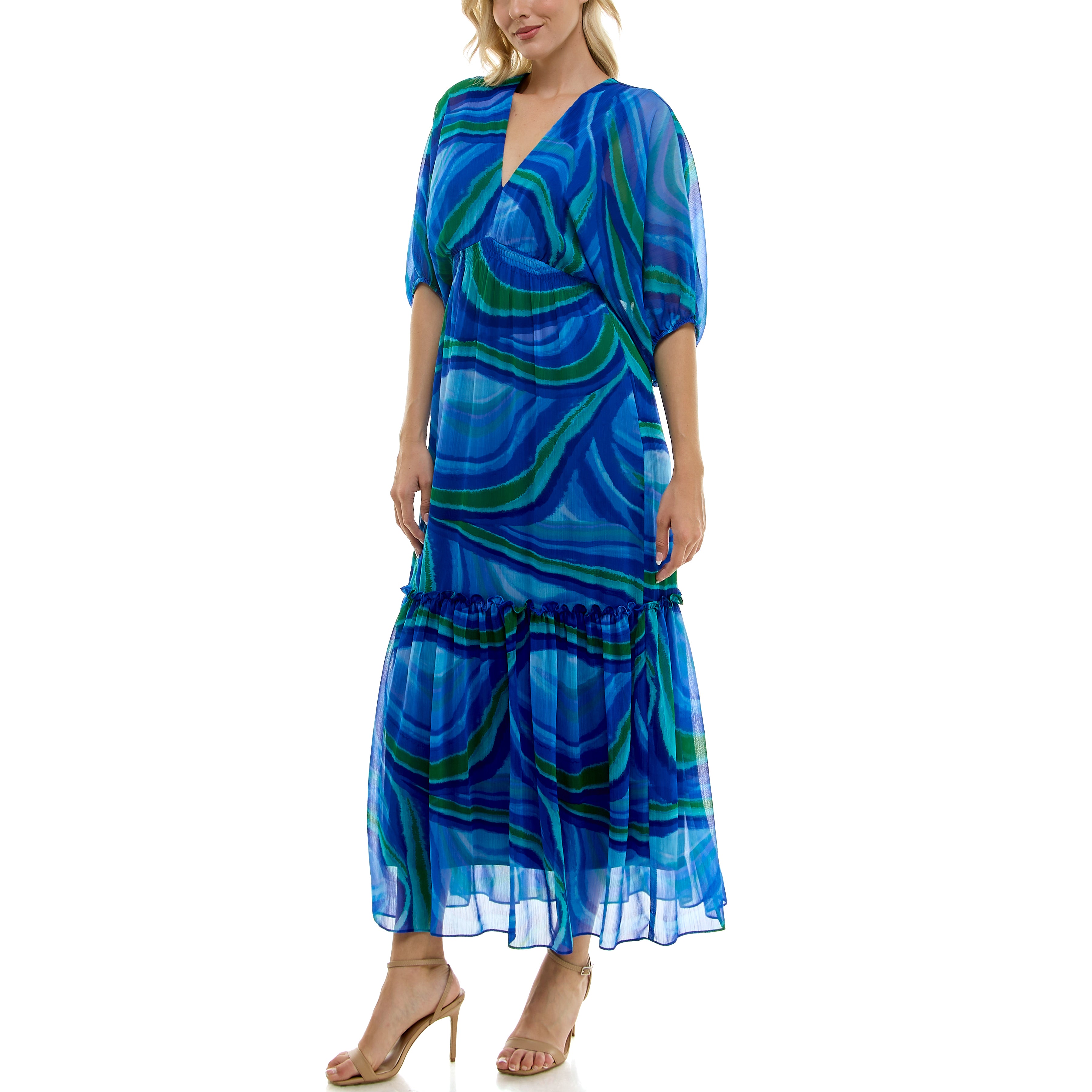 Elbow-length blouson sleeve maxi dress with multicolor abstract 1960s-inspired pattern detailing, cinched cuffs, V-neckline, tiered chiffon hem, multicolor swirl print, empire waist.