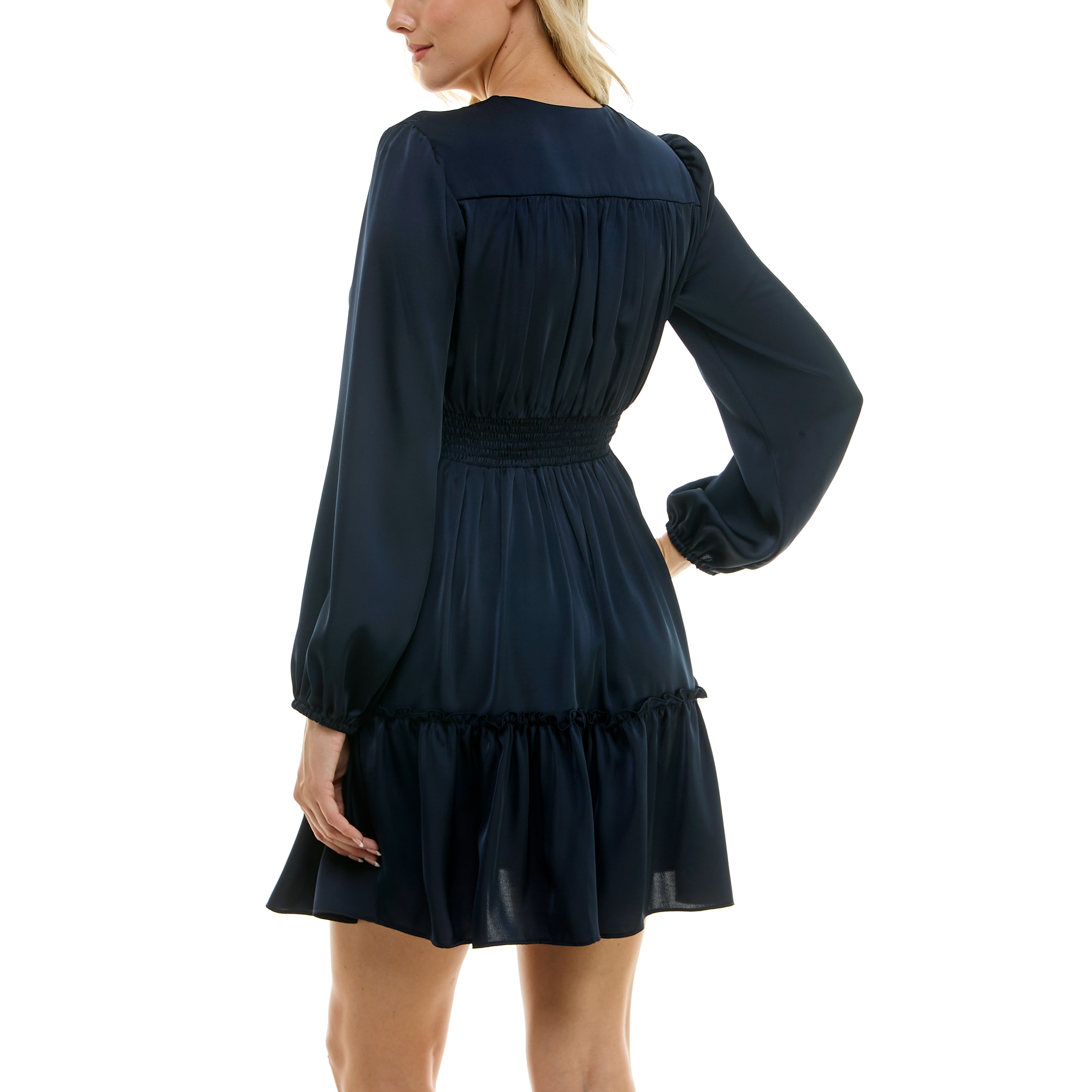 Petite unlined satin fit and flare mini dress with V-neckline, long blouson sleeves, cinched cuffs, cinched waist, ruffled hem, shoulder seam, and back yoke, smocked rear waist, and belted detail.