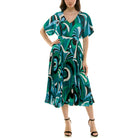 Lined wide short sleeve midi dress with V-neckline, retro 1960s Mod-inspired swirl pattern, empire waistband, accordion pleated skirt, and back zip closure.