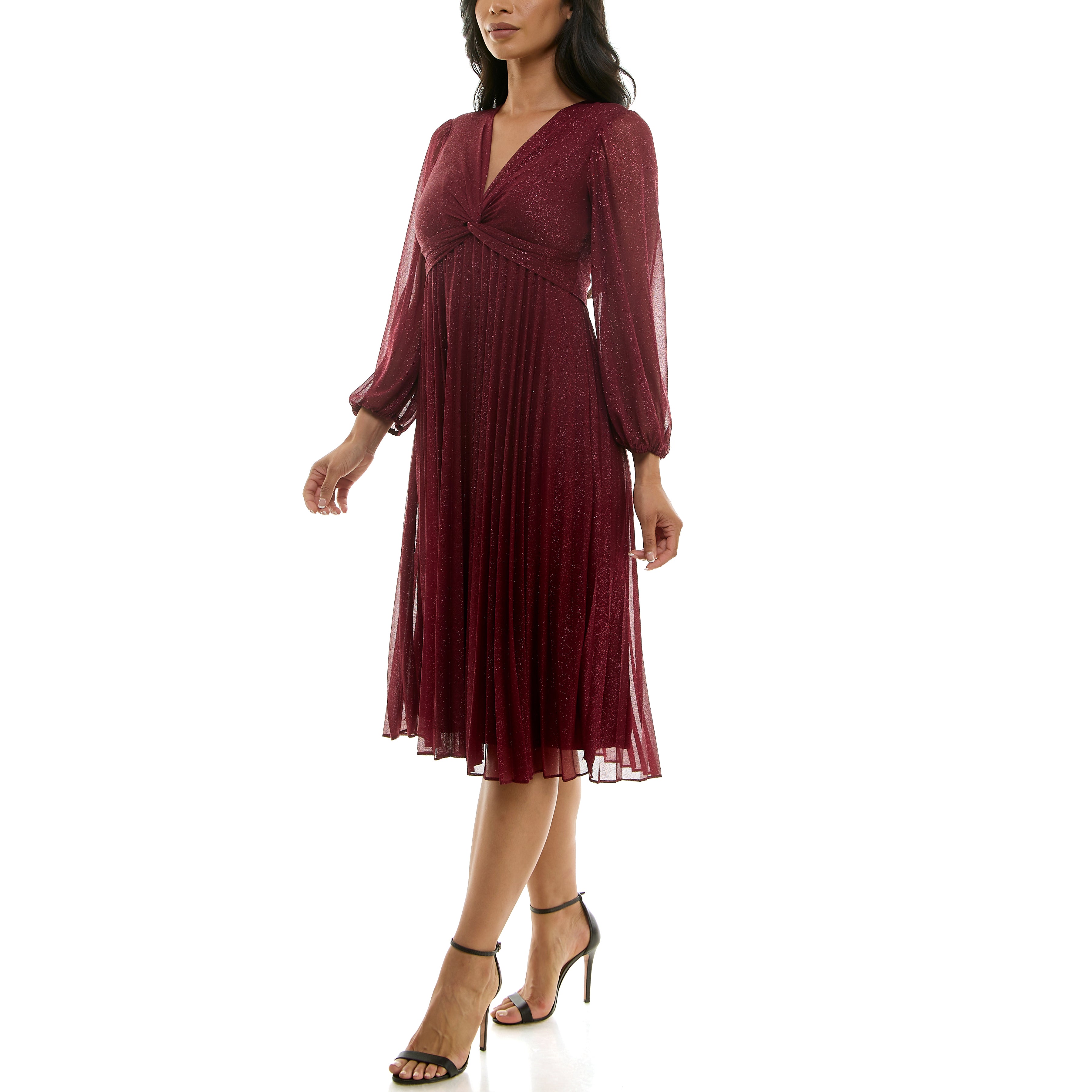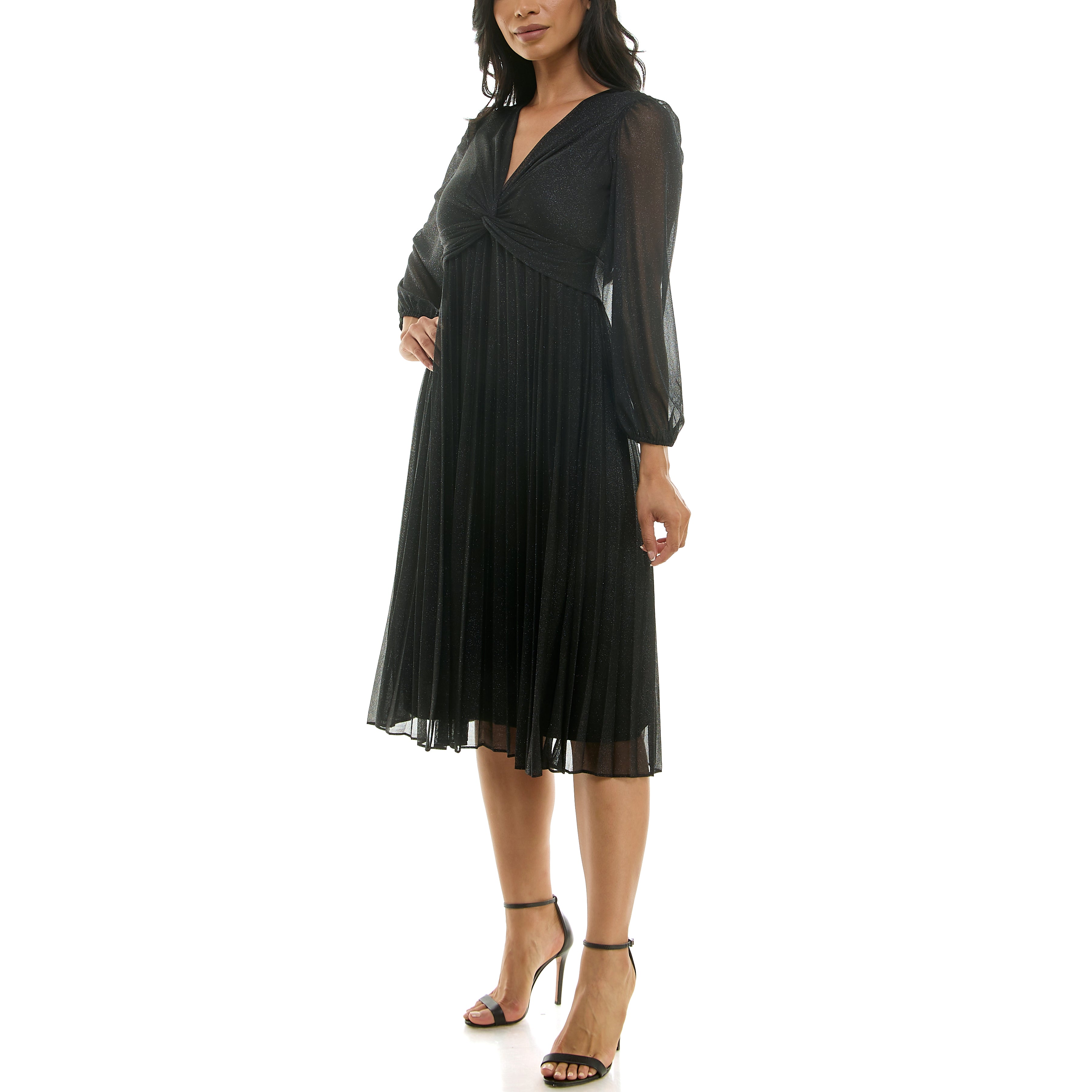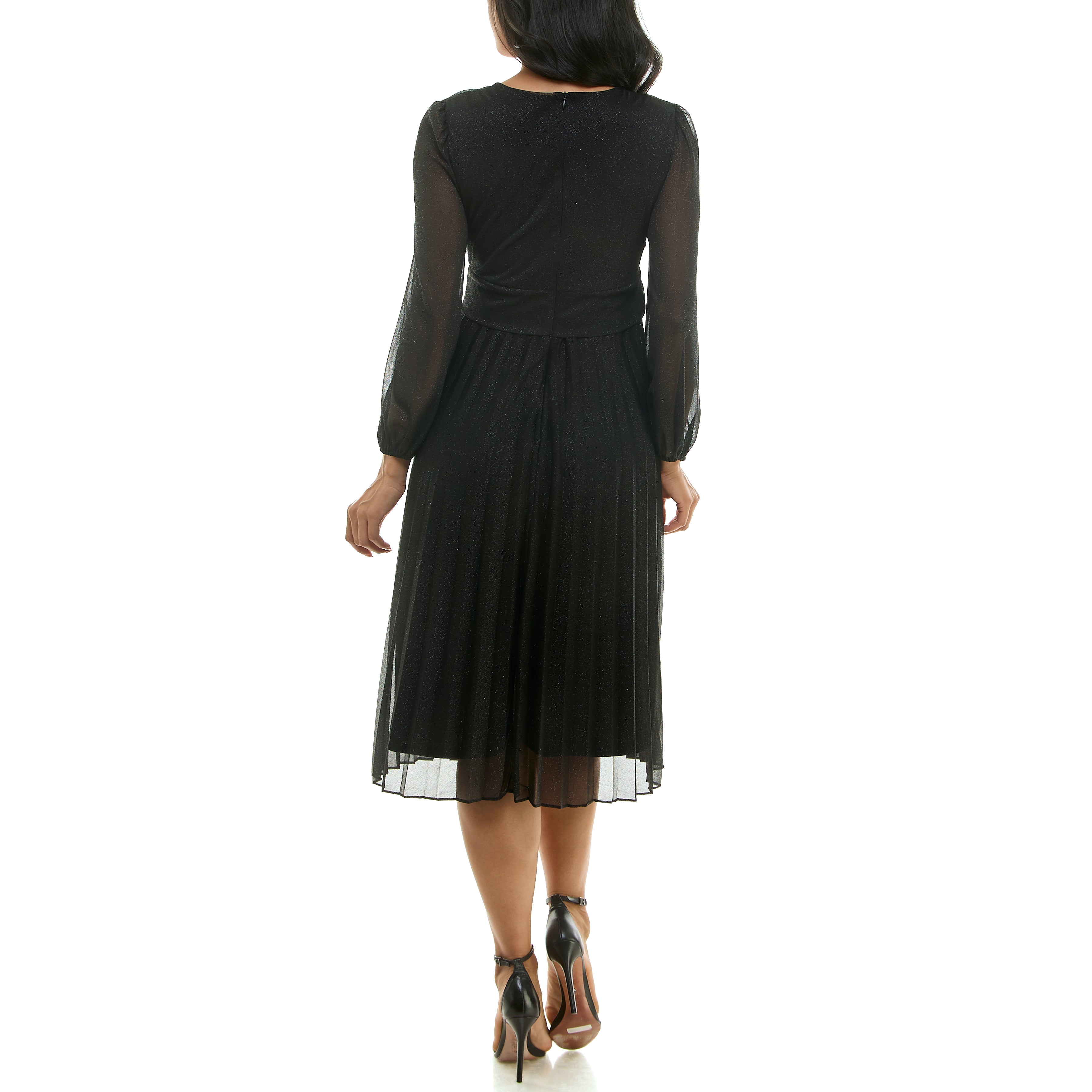 Long sheer balloon-sleeved midi dress with fitted V-neck knot bodice, accordion-pleated skirt, and sparkling mesh overlay.