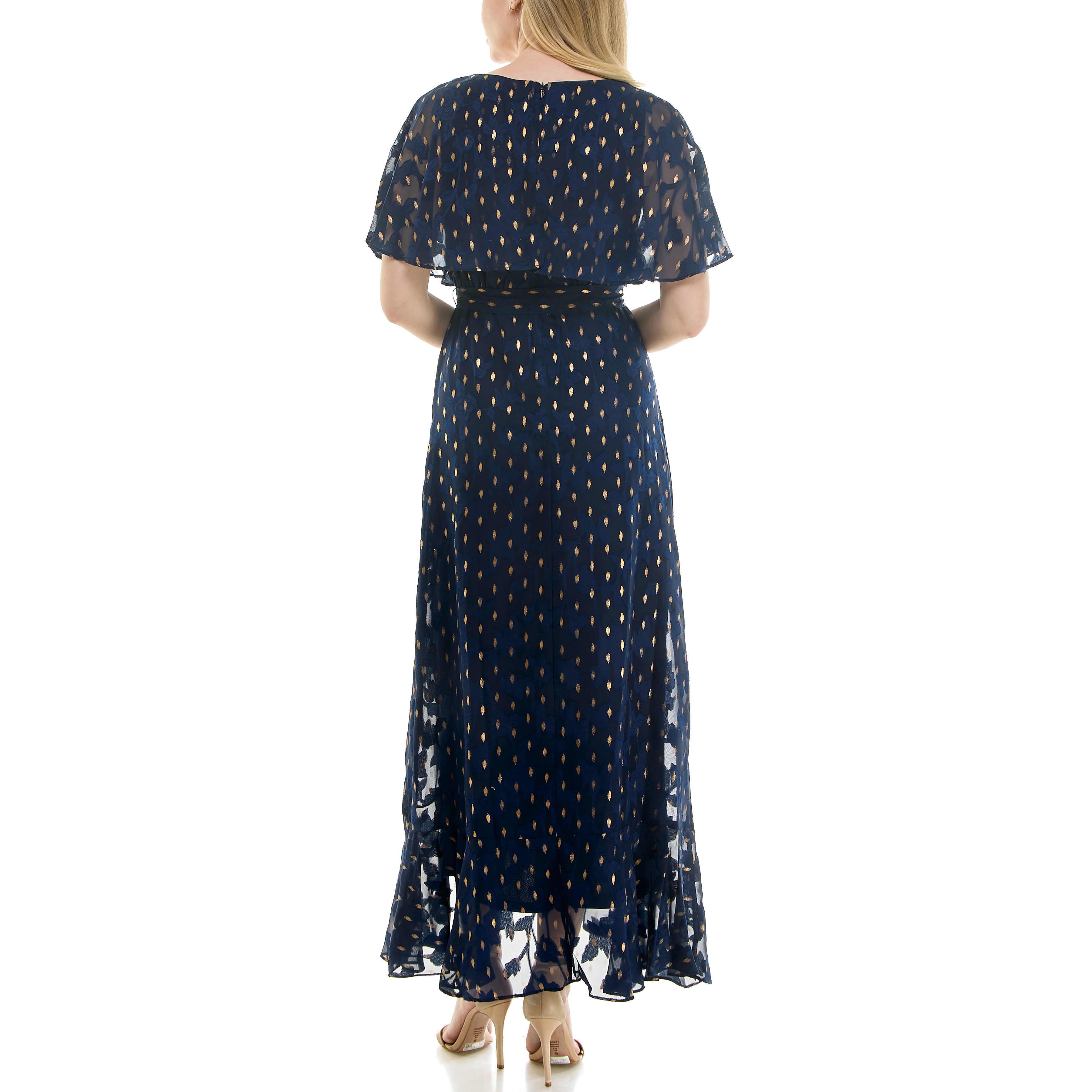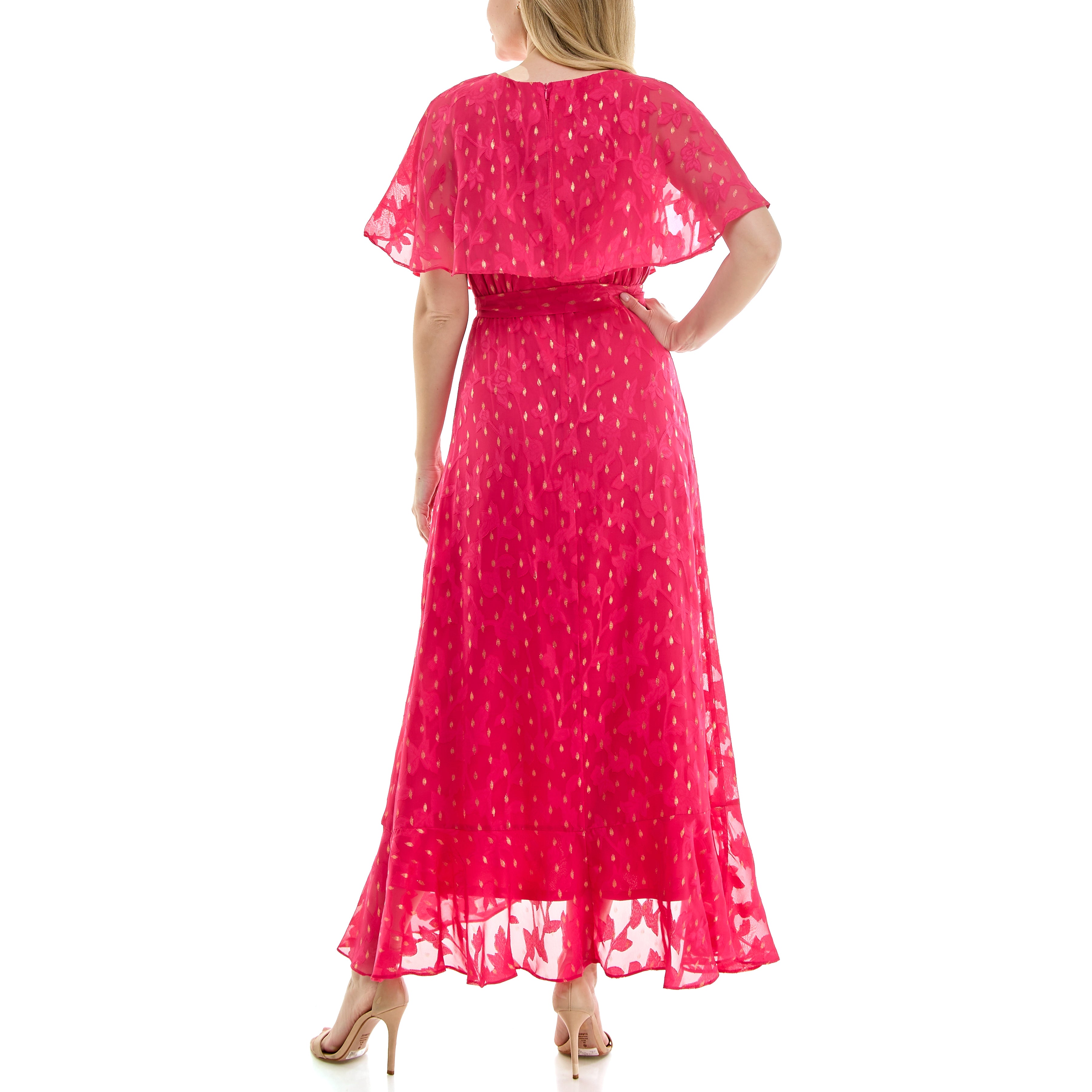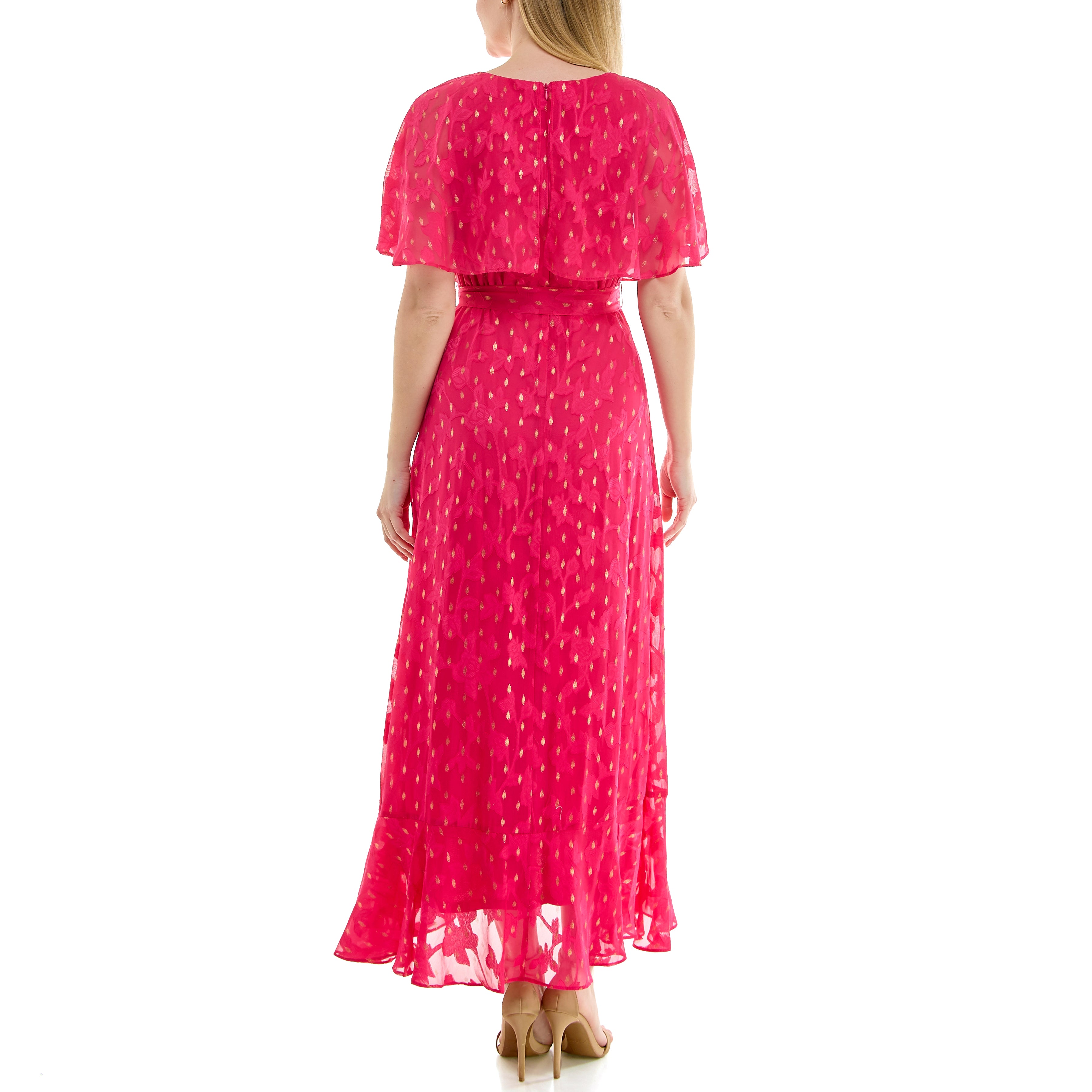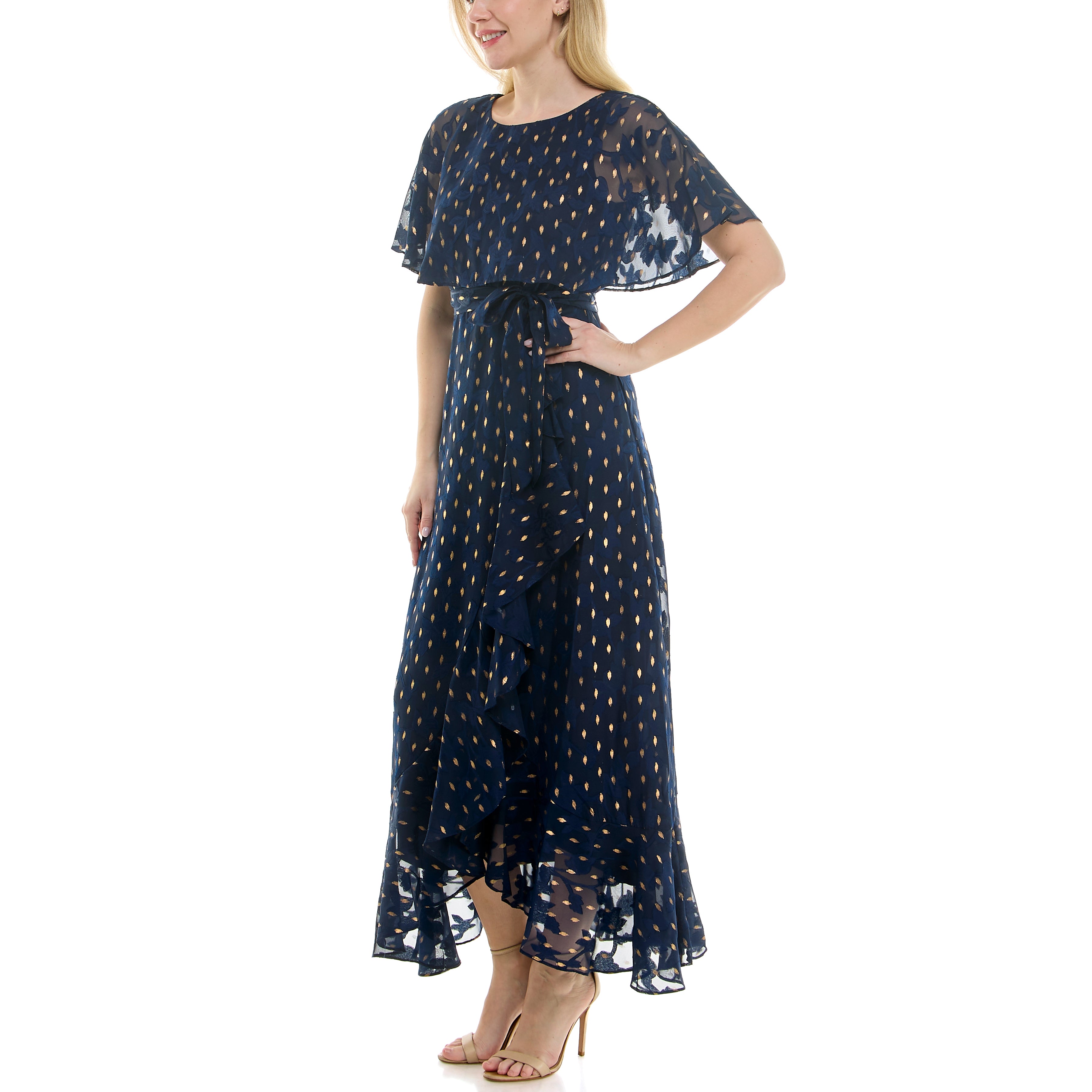MAISON TARA GOLD FOIL PRINT CHIFFON CAPELET MAXI DRESS