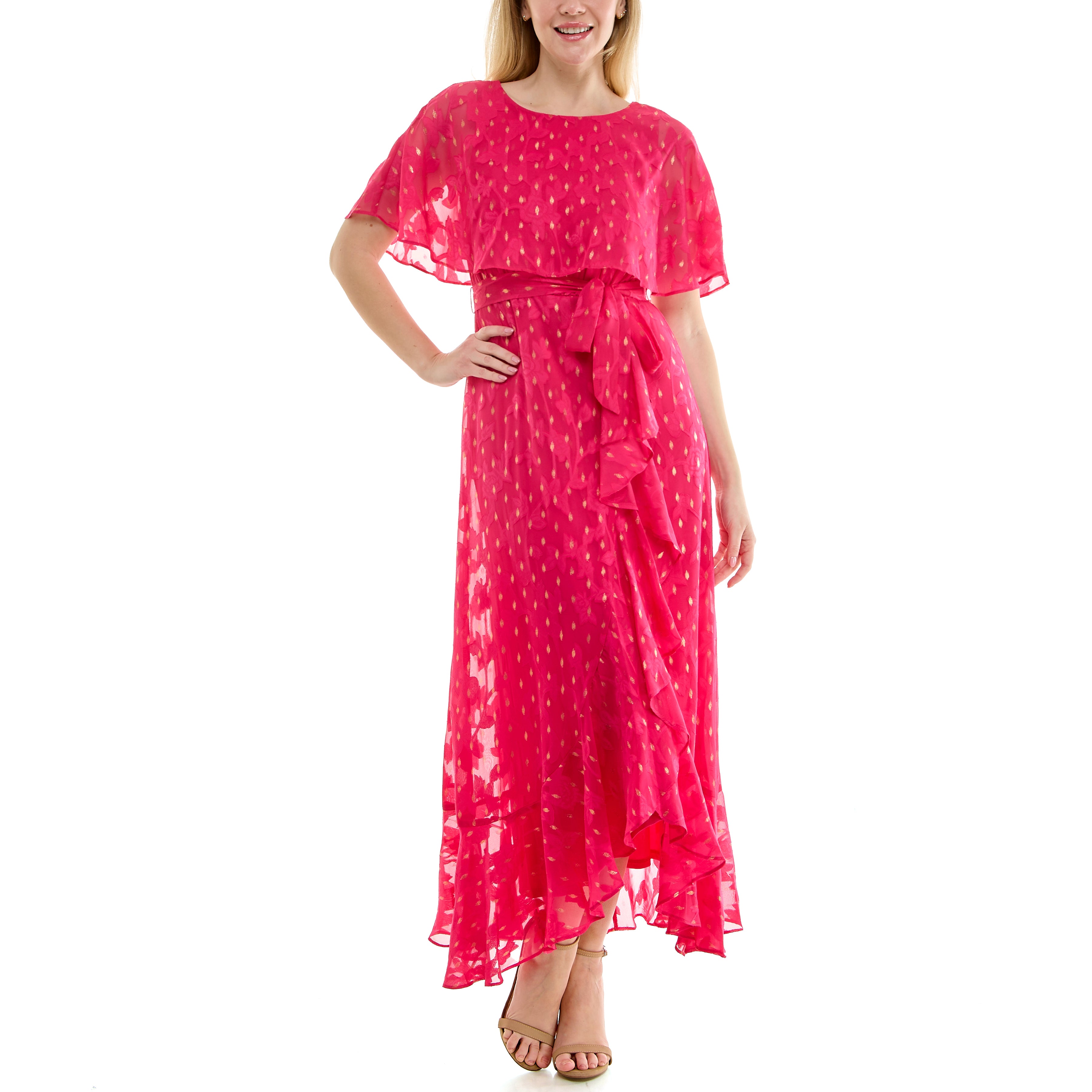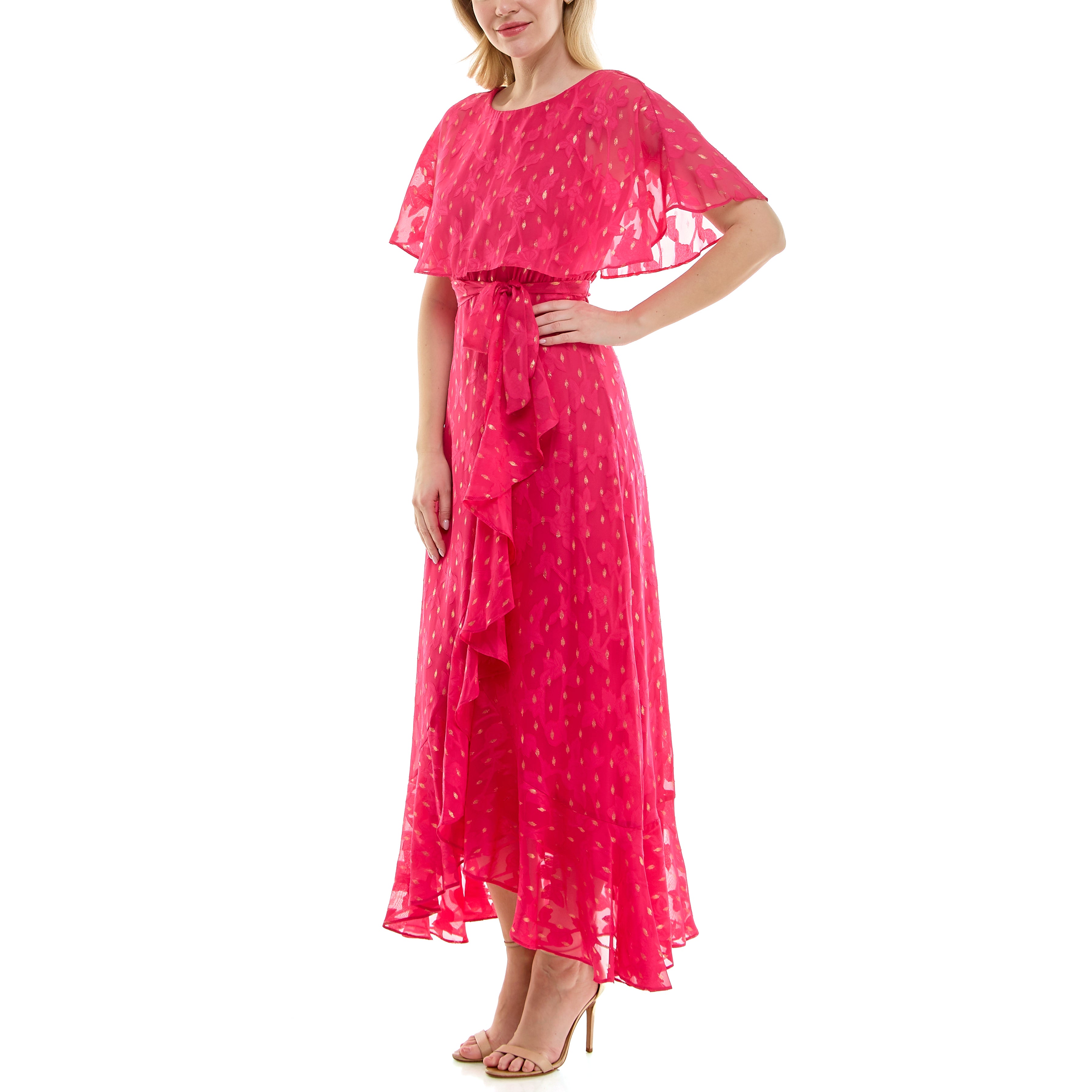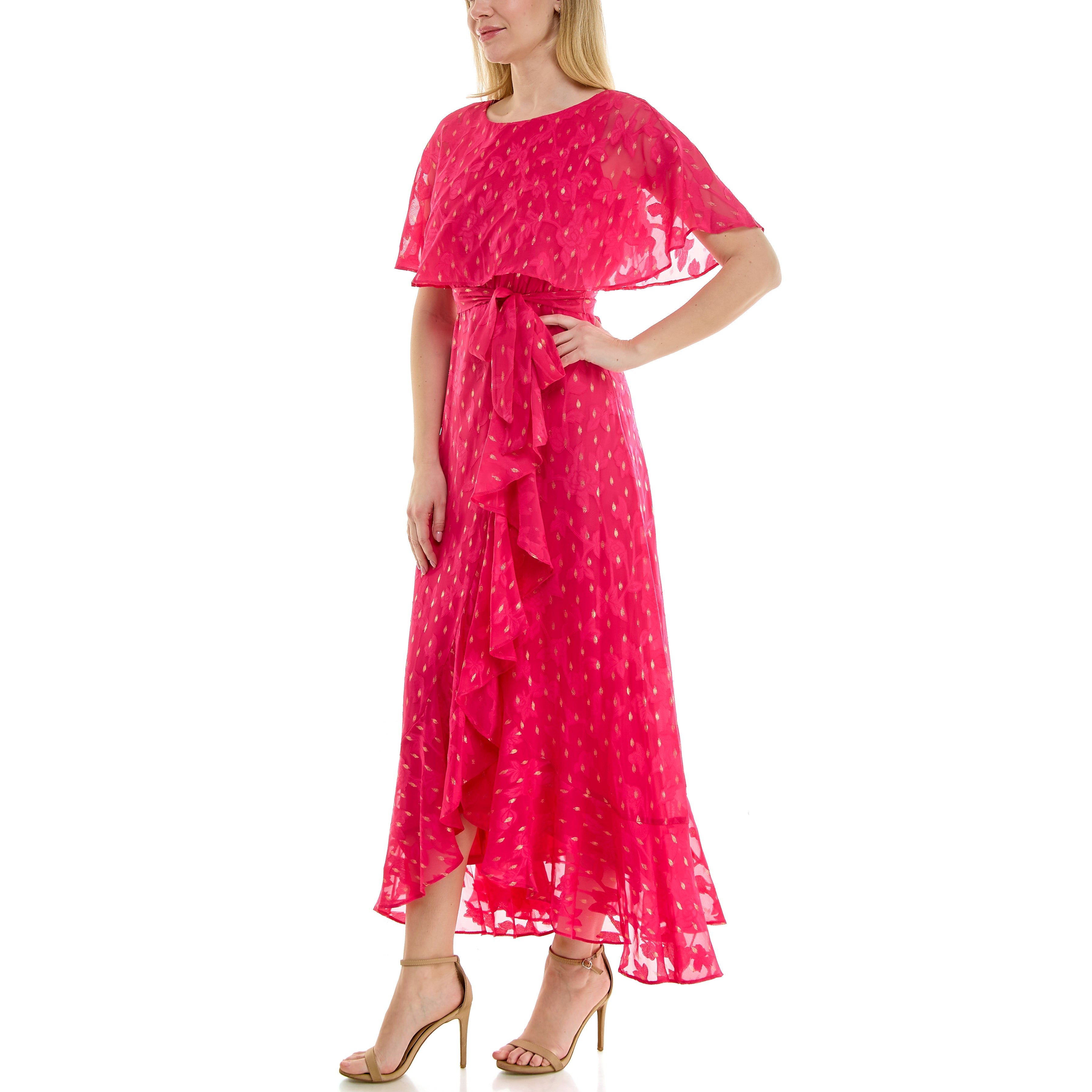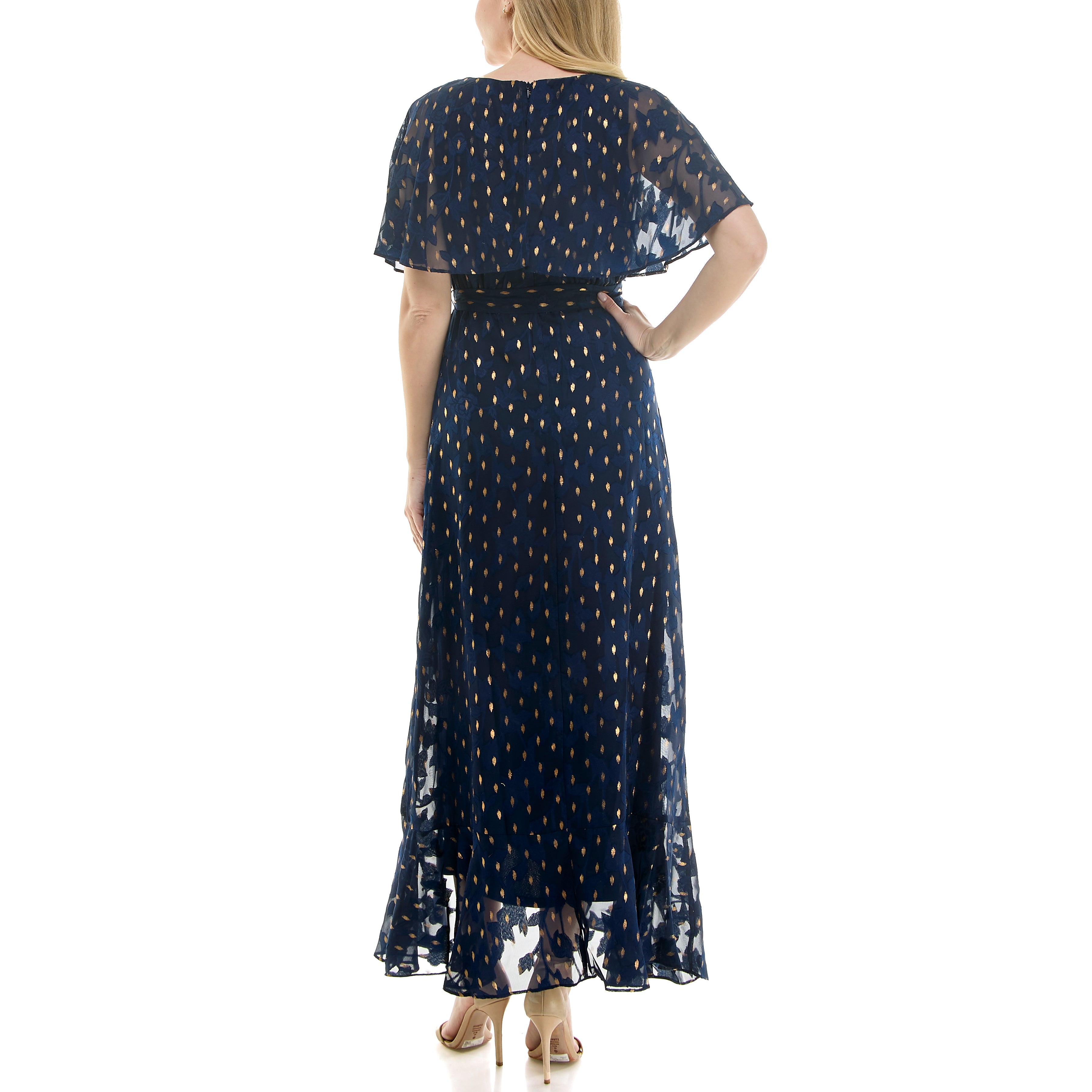 MAISON TARA GOLD FOIL PRINT CHIFFON CAPELET MAXI DRESS