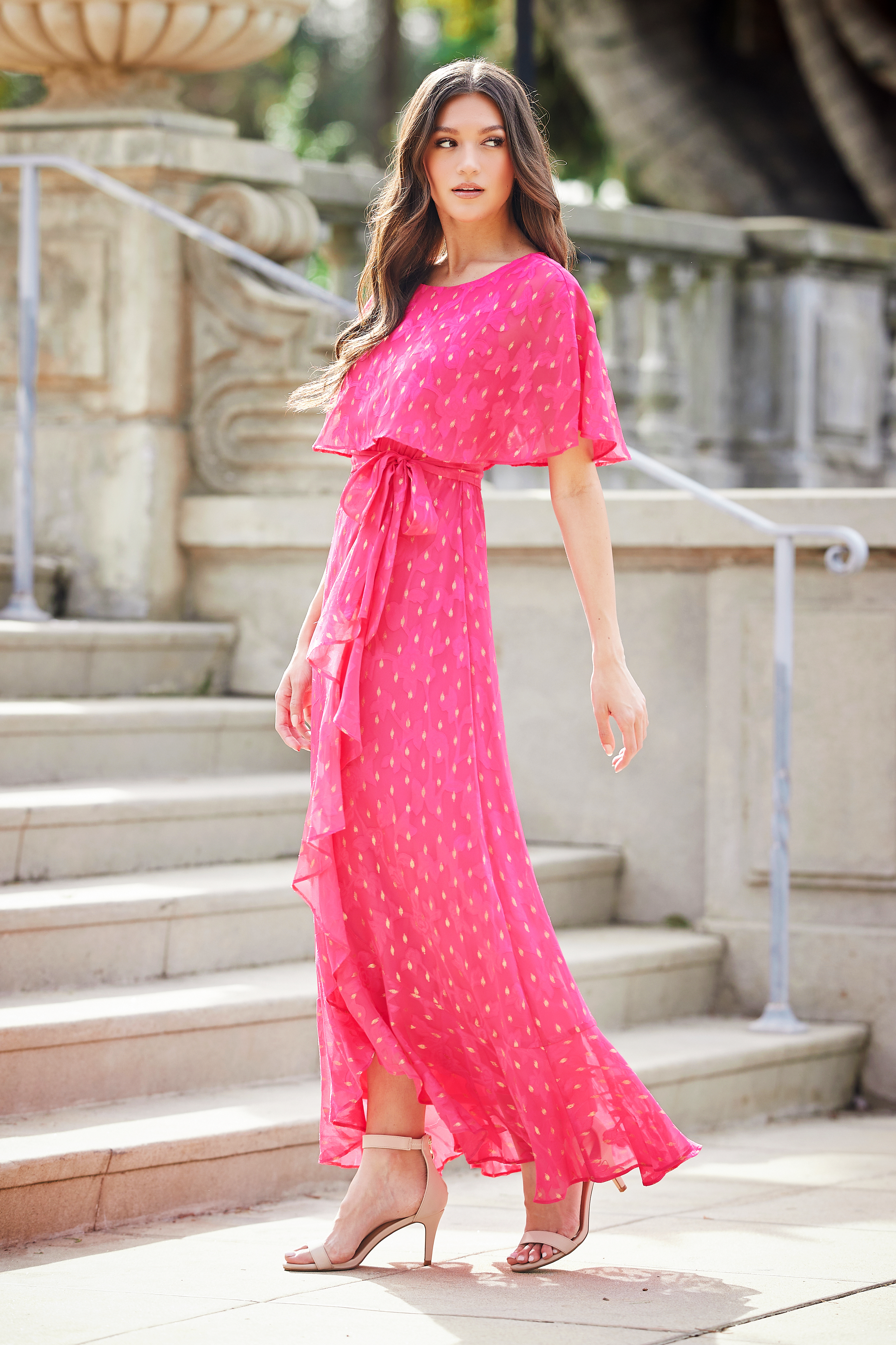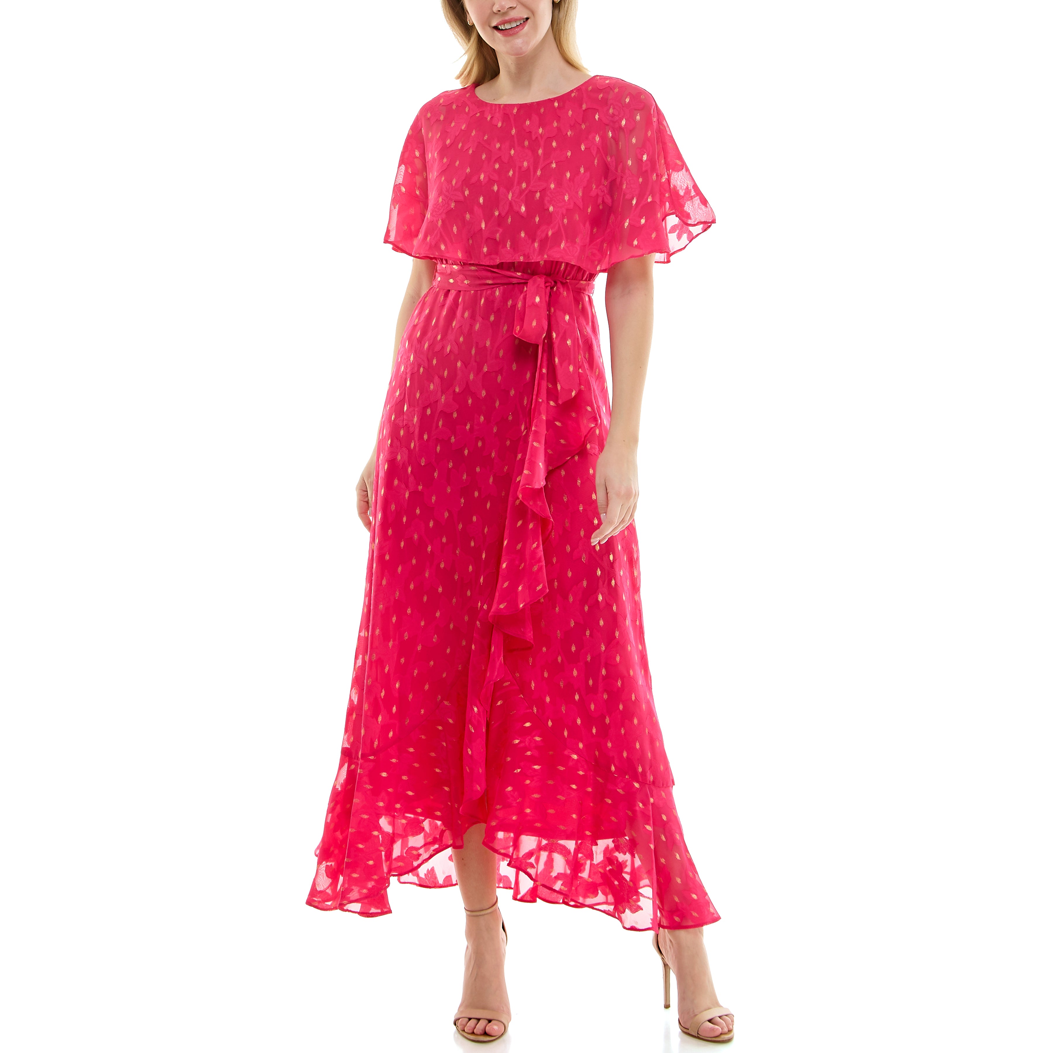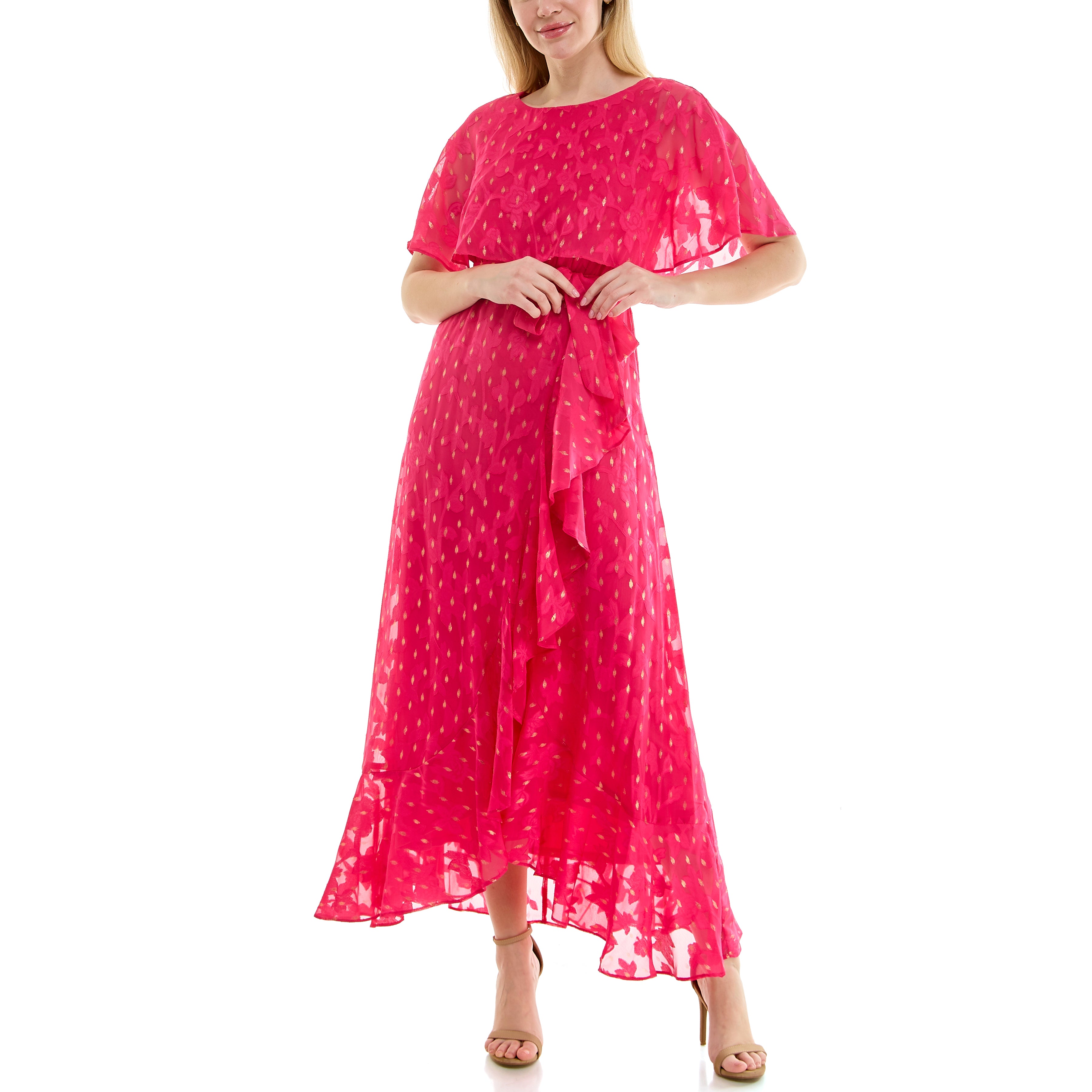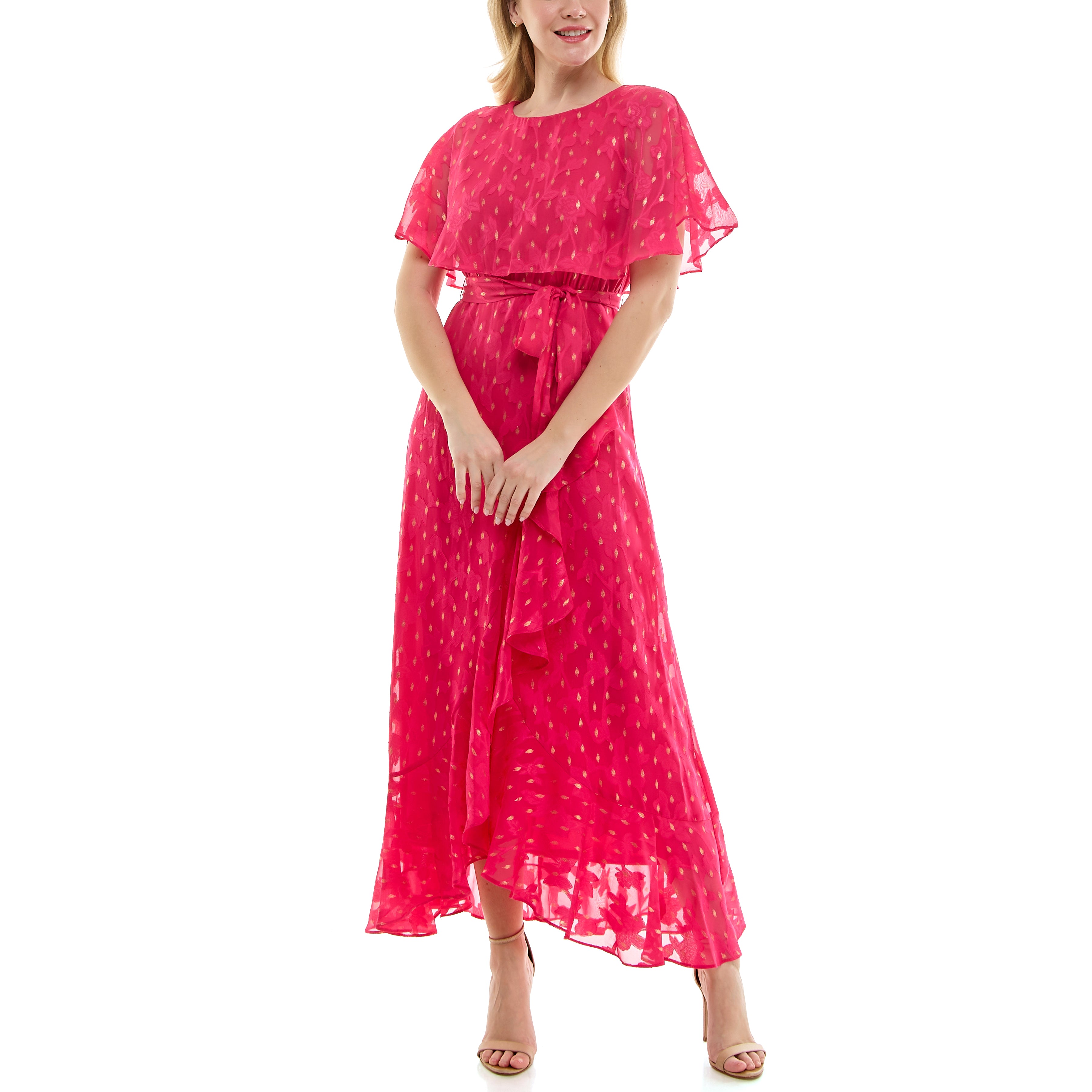 MAISON TARA GOLD FOIL PRINT CHIFFON CAPELET MAXI DRESS