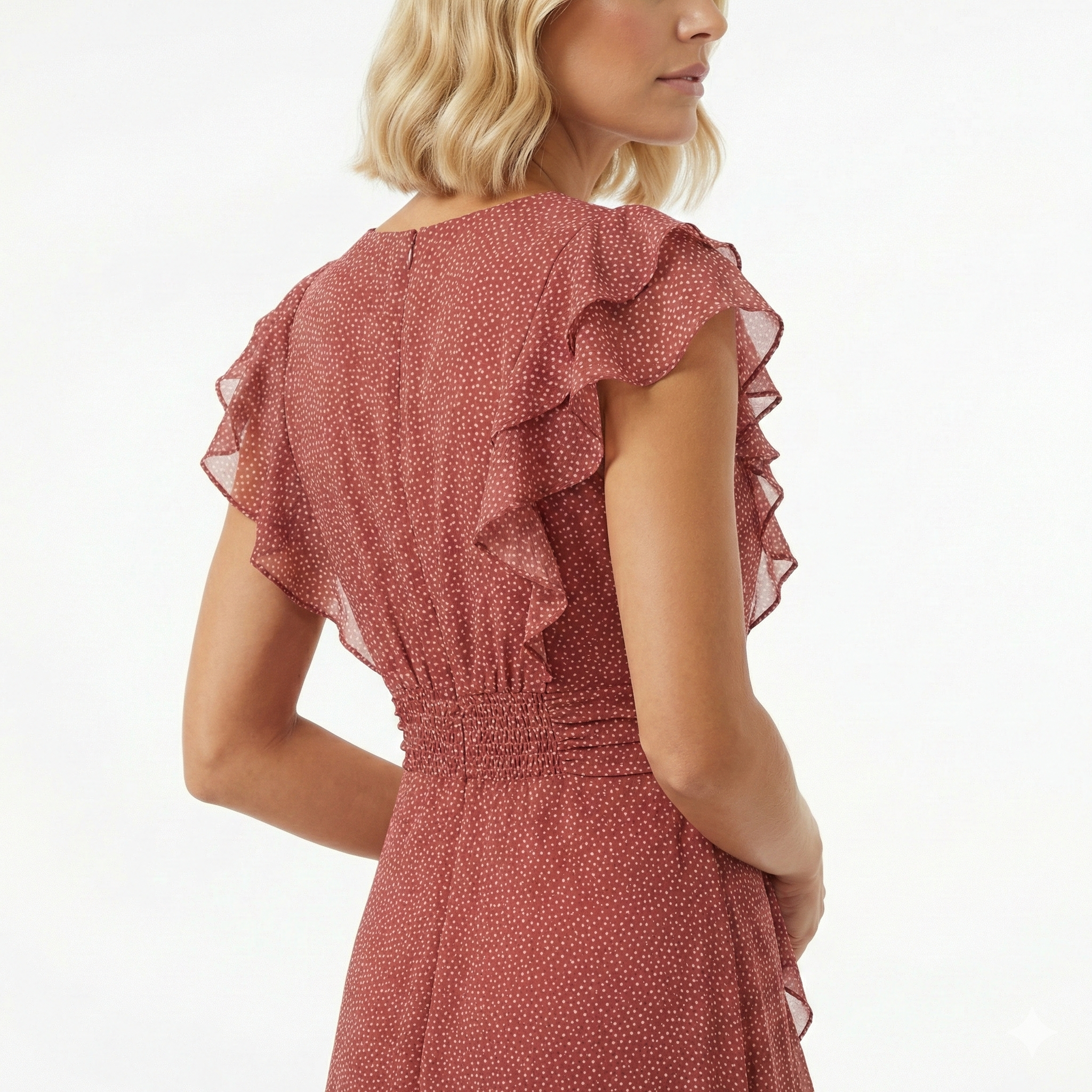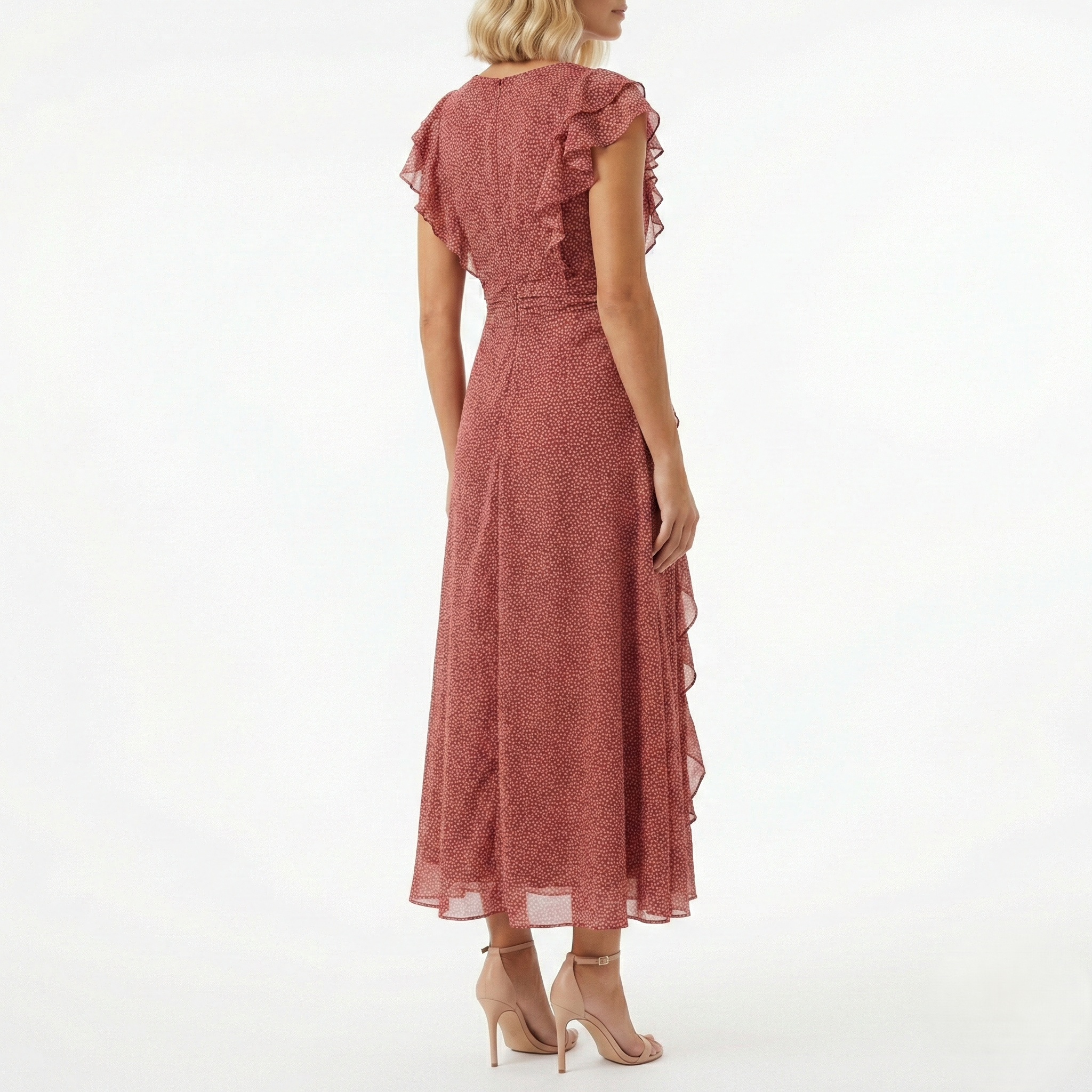 ROSEWOOD POLKA DOT RUFFLE MIDI DRESS-V-NECK CAP SLEEVE FLOWY DRESS