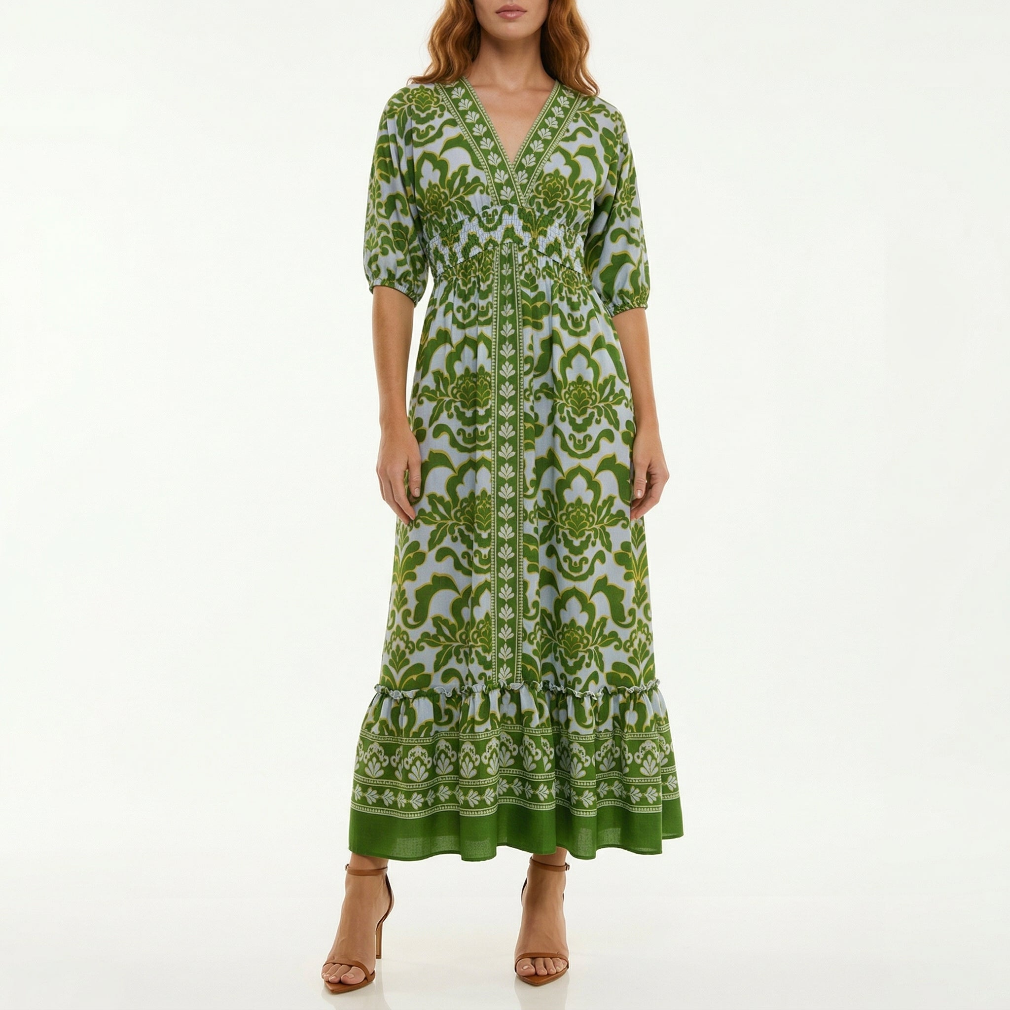 OLIVE GREEN BOHO PRINT MAXI DRESS WITH SMOCKED WAIST AND POCKETS