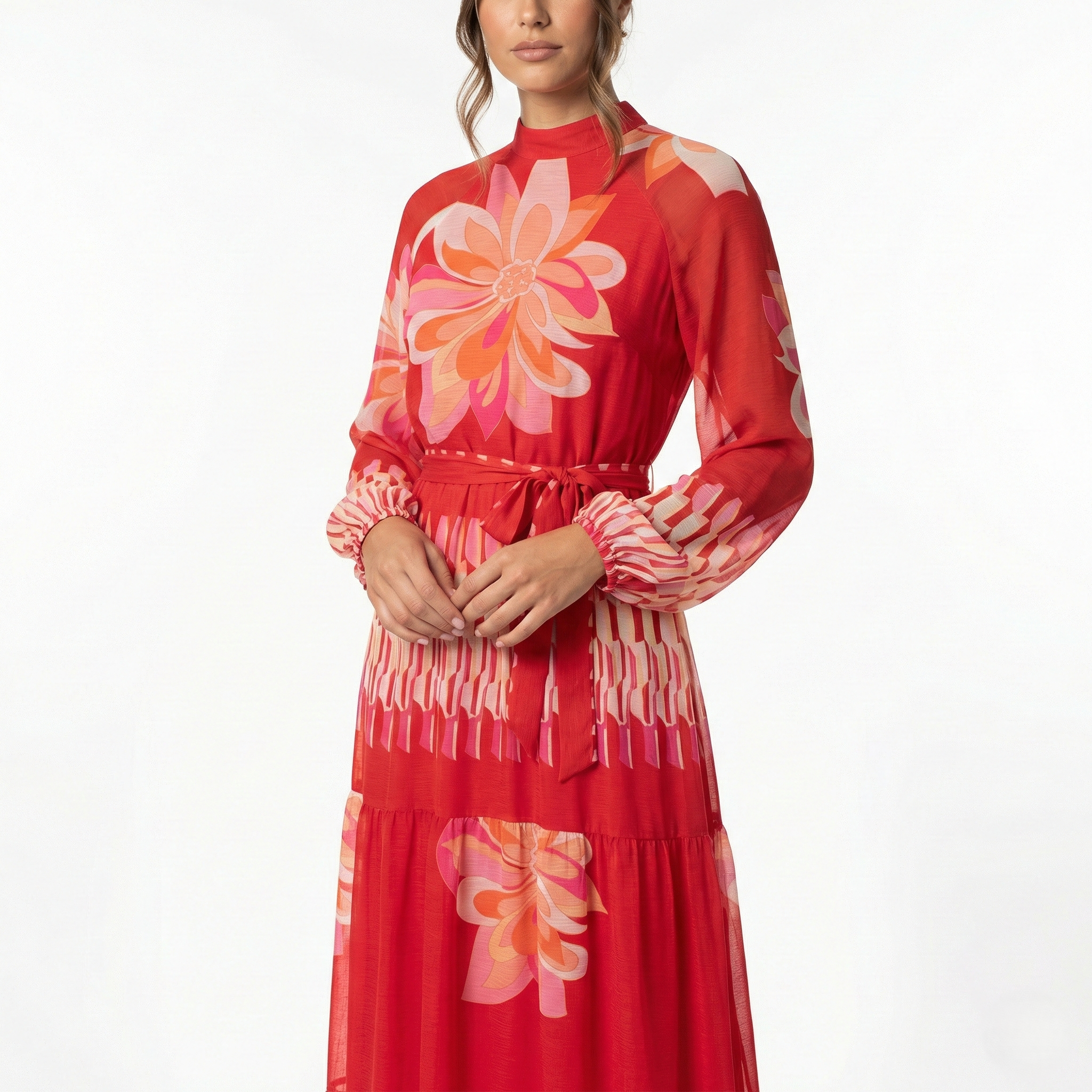 RED FLORAL MAXI DRESS – LONG SLEEVE HIGH NECK TIE WAIST RETRO PRINT OCCASION DRESS