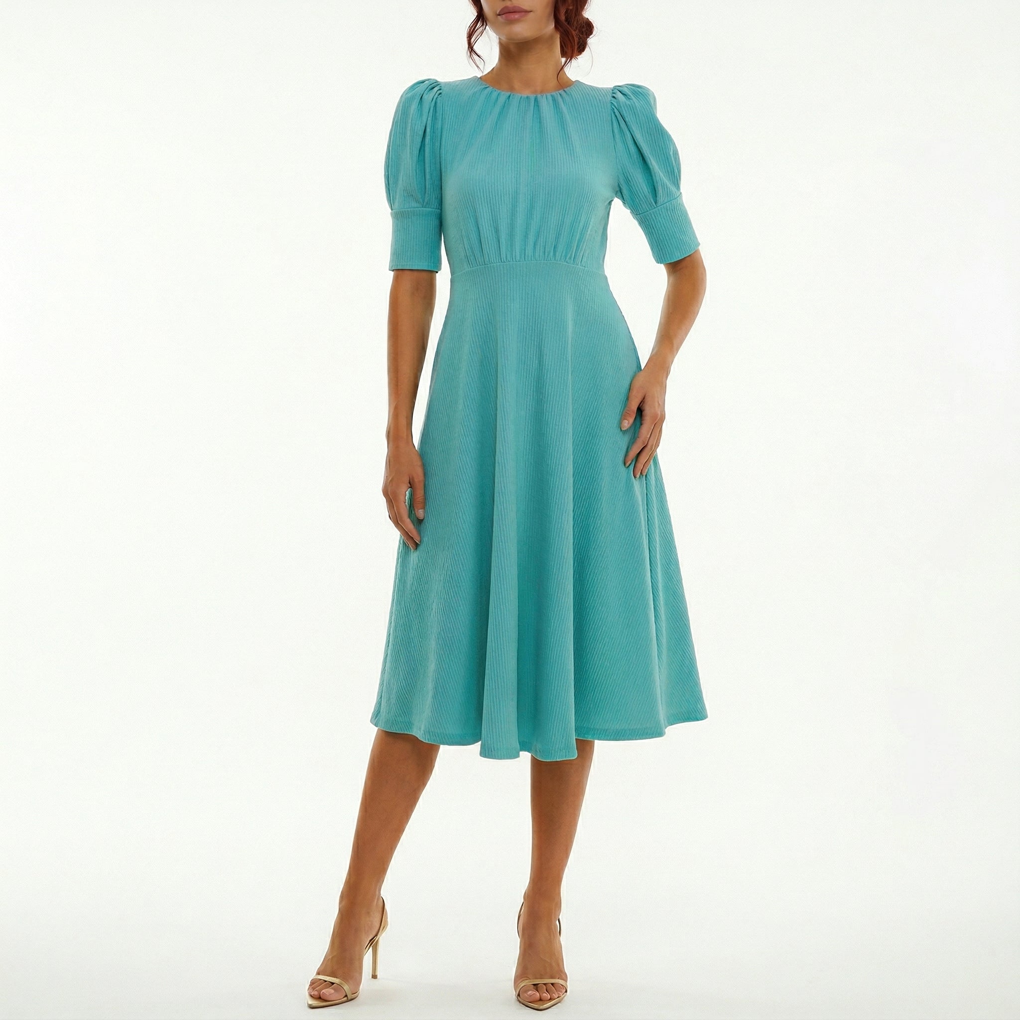 TEAL PUFF SLEEVE MIDI DRESS – HIGH NECK A-LINE ELEGANT OCCASION DRESS