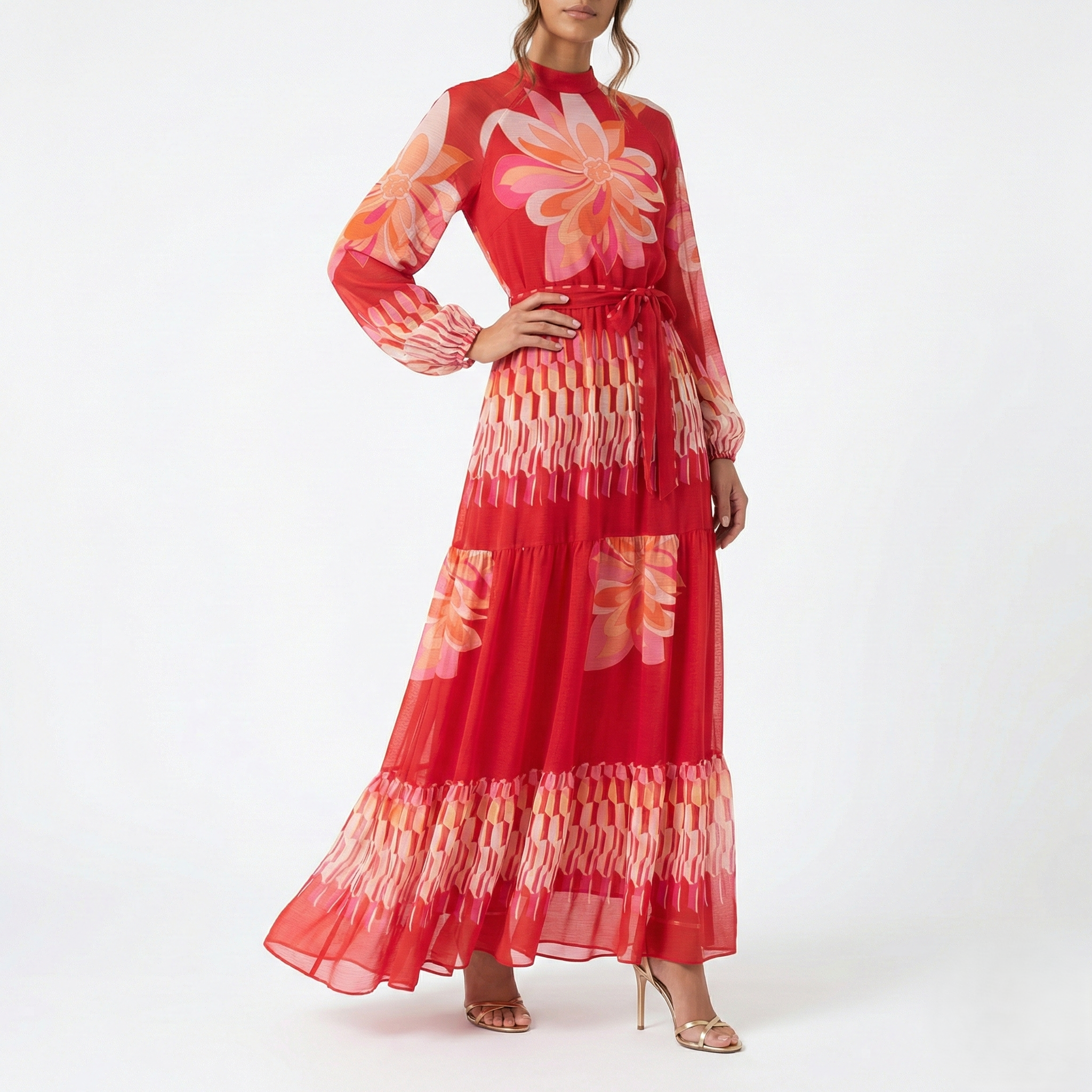 GREEN FLORAL CHIFFON MAXI DRESS – LONG SLEEVE HIGH NECK TIE WAIST TIERED ELEGANT DRESS