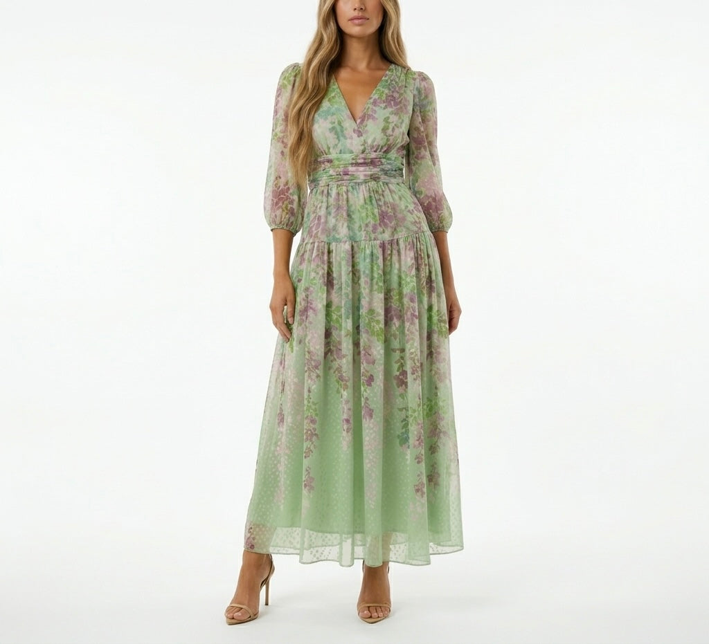 WOMEN’S SAGE GREEN FLORAL MAXI DRESS – SHEER SLEEVE V-NECK ROMANTIC A-LINE DRESS