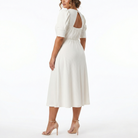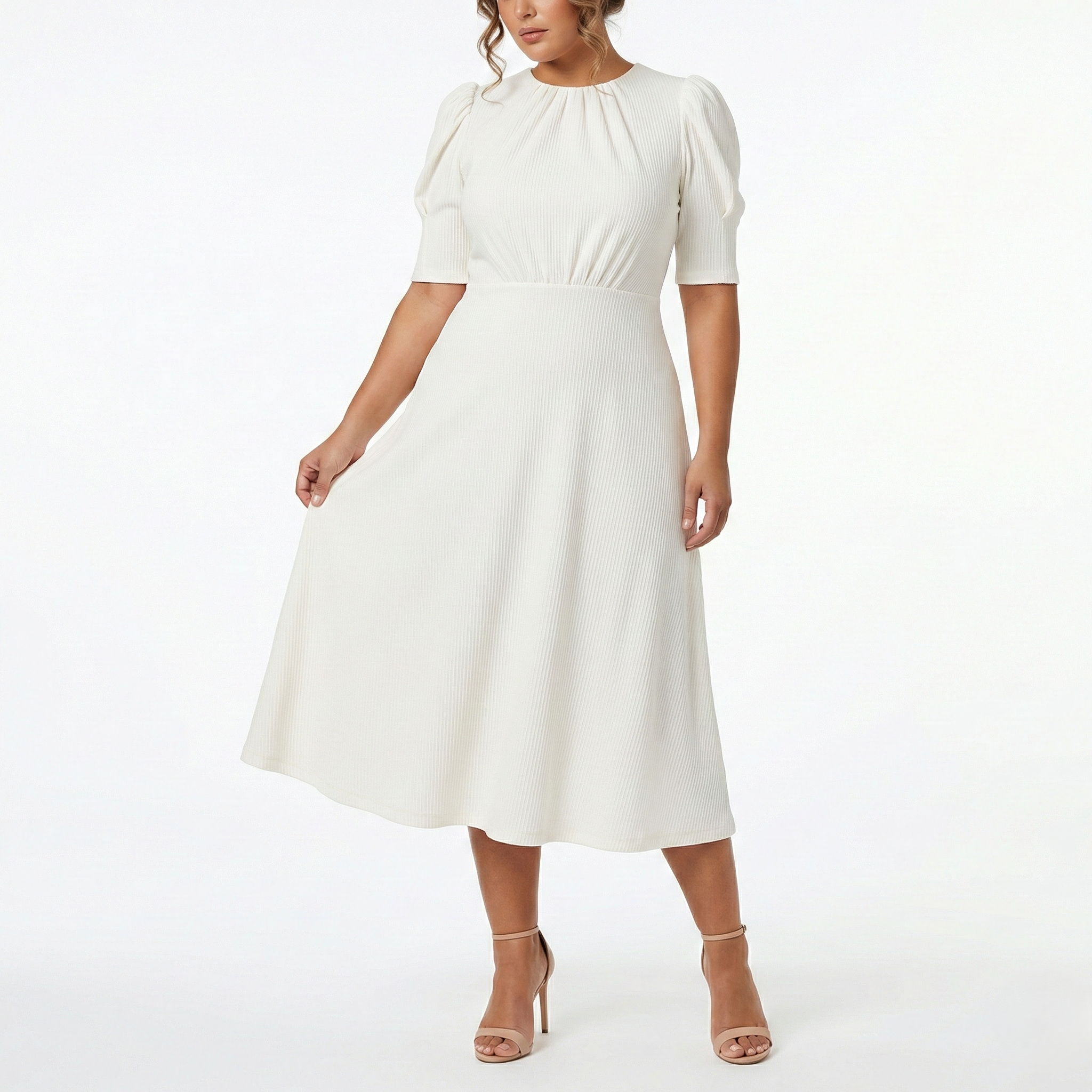 Make a graceful statement in this stunning ivory puff sleeve midi dress, designed to blend timeless elegance with modern femininity. Crafted from lightweight textured fabric, this dress features a flattering fitted waist and flowing A-line skirt that creates effortless movement.