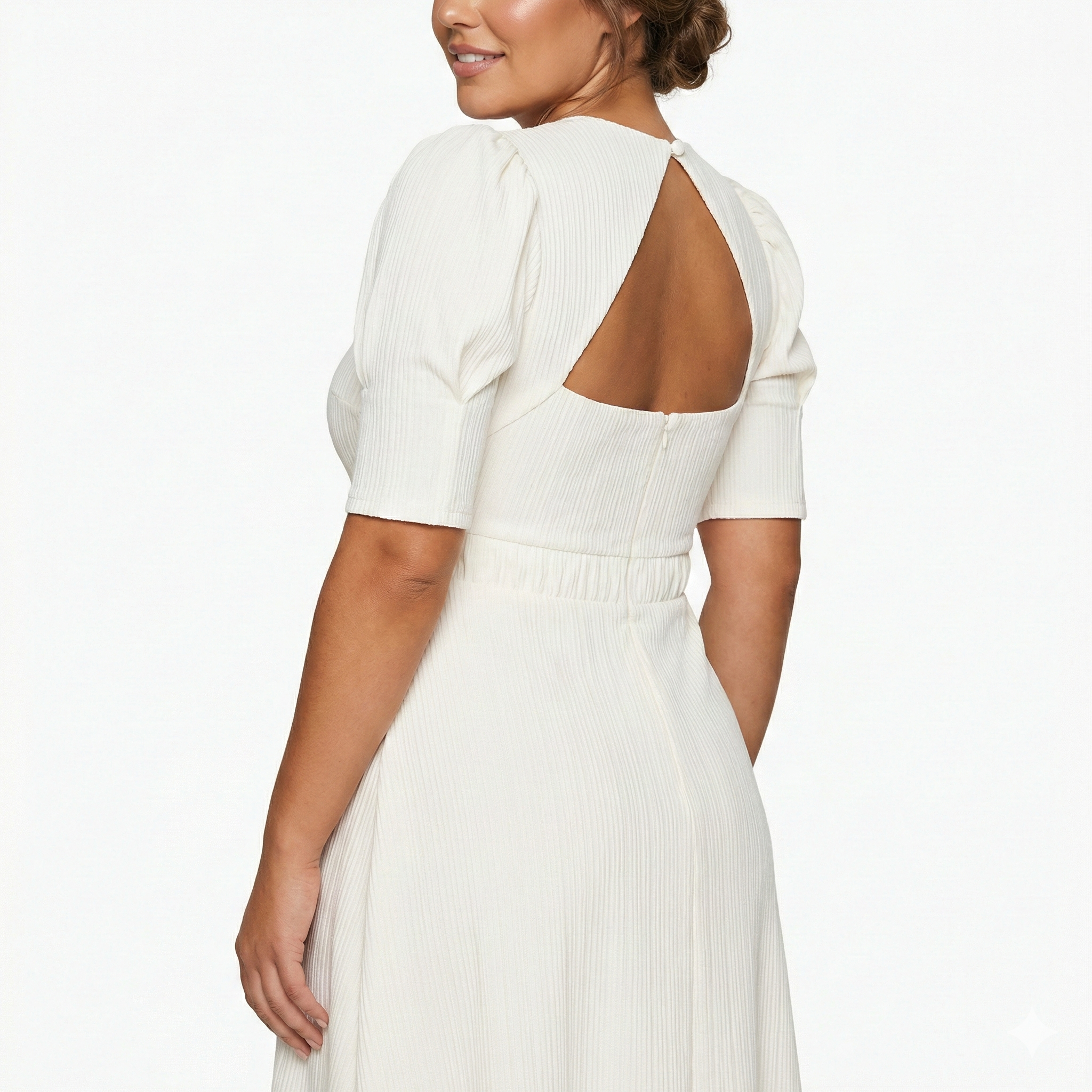 The modest round neckline is complemented by a chic keyhole open-back detail, adding subtle allure while maintaining refined sophistication. Soft puff sleeves with tailored cuffs provide structure and style, while the midi-length hemline offers versatile coverage for formal and semi-formal occasions.