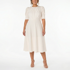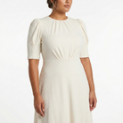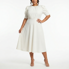 IVORY PUFF SLEEVE MIDI DRESS – HIGH NECK A-LINE ELEGANT OCCASION DRESS