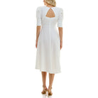 Unlined fit and flare midi dress with jewel neckline, puffed elbow-length sleeves, barrel cuffs, straight hem, hook-and-eye back, back zip closure,