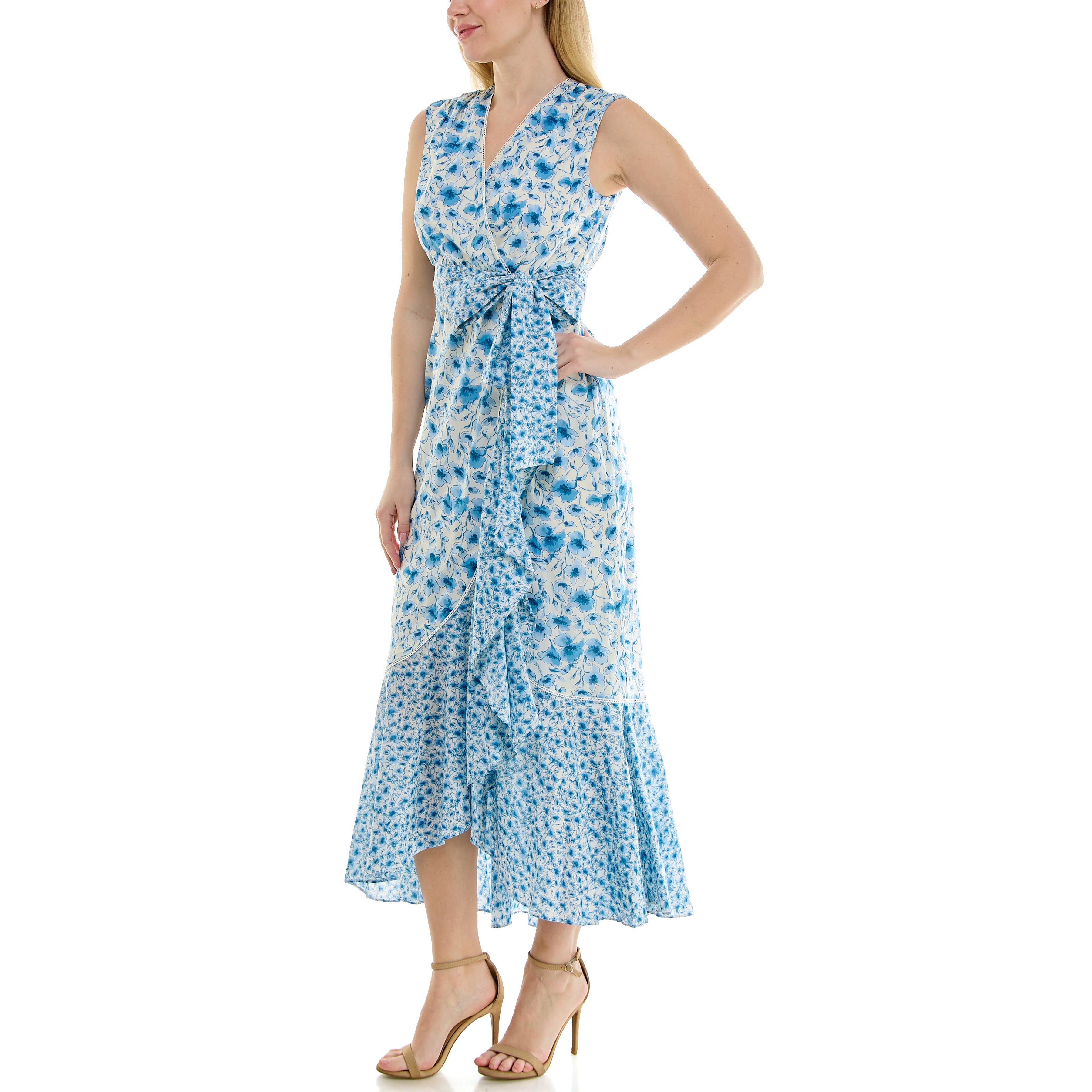 Crafted from lightweight, breathable fabric, this sleeveless maxi dress showcases a beautiful blue floral print on an ivory background, complemented by subtle mixed-print detailing for added charm. The flowy silhouette and asymmetrical hemline create graceful movement with every step.