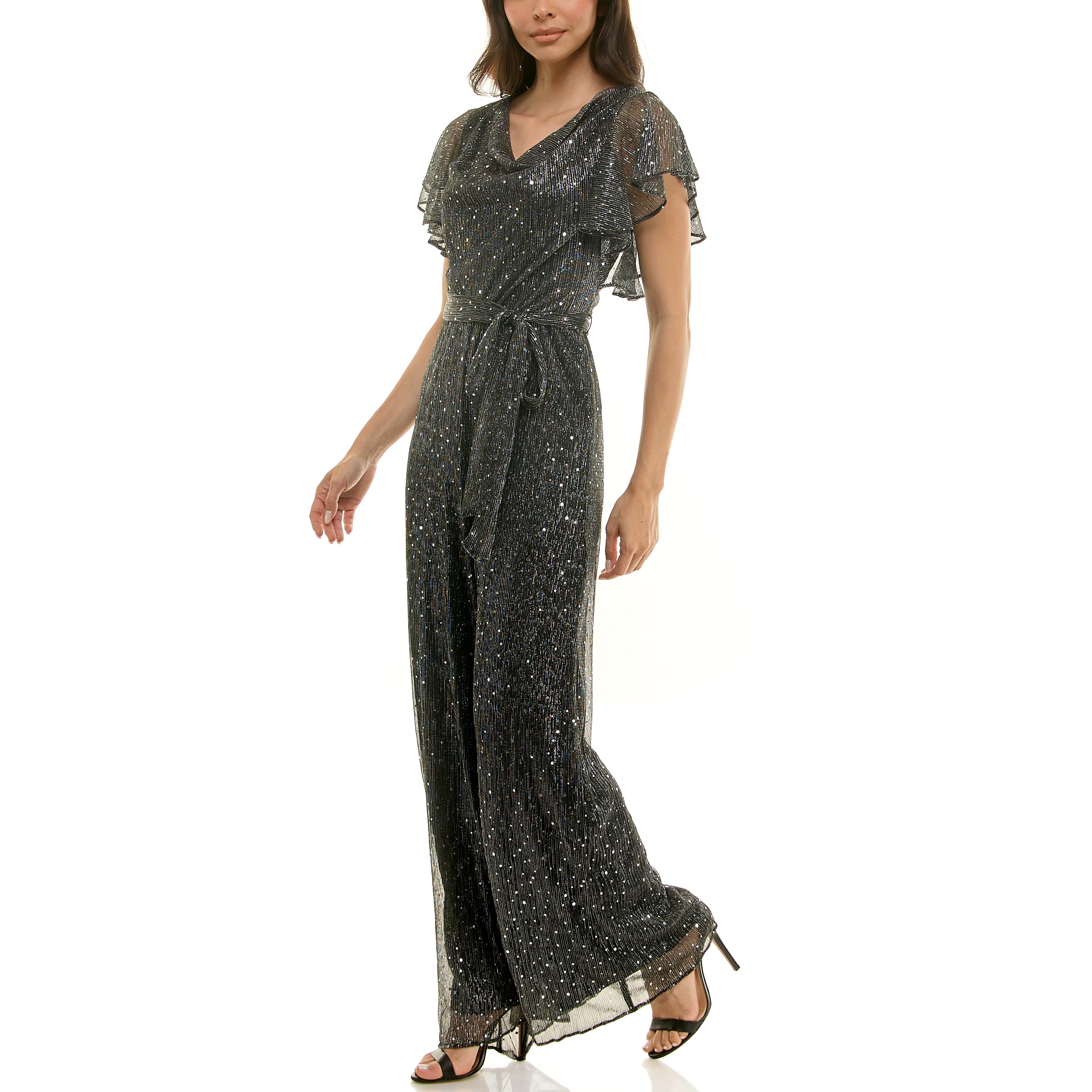 Lined capelet jumpsuit with dotted metallic fabrication, cowl neckline, angular flutter sleeves, elastic shirred waist, self-tie belt sash, wide hems, and back zip closure.