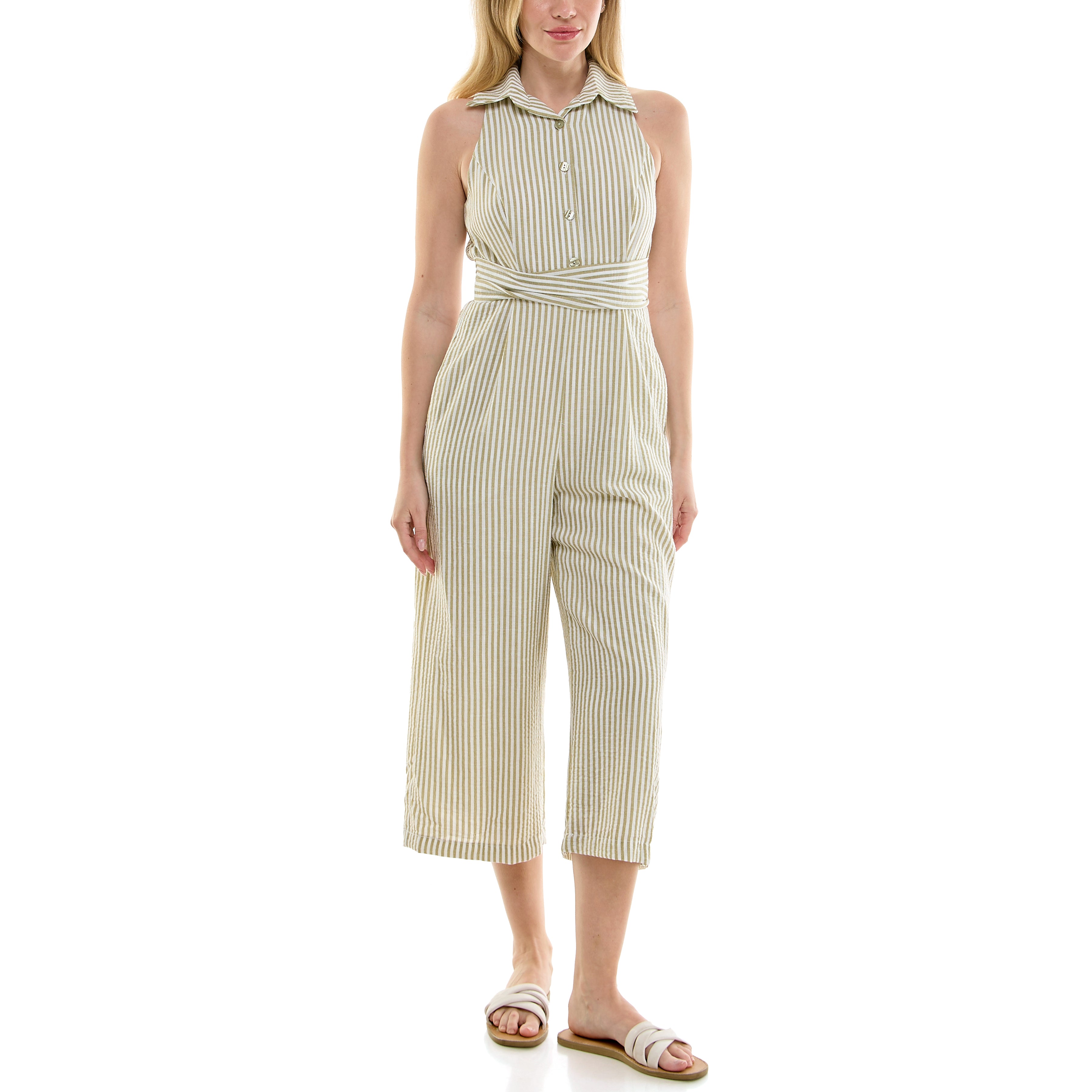 Sleeveless mid-calf length jumpsuit with three button oxford collar front closure, vertical seersucker pinstripes, directionally contrasting wraparound waistband, and two side pockets.