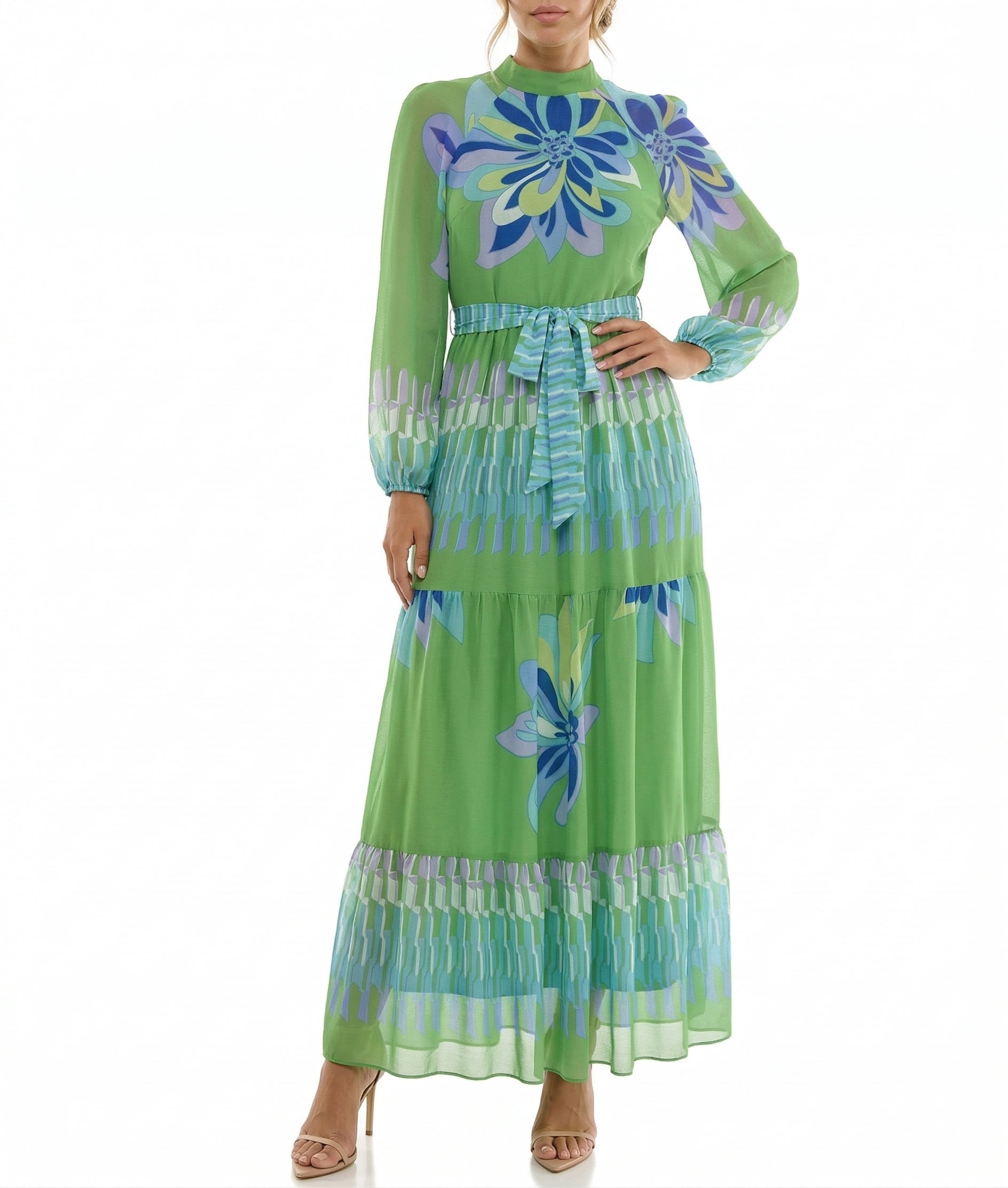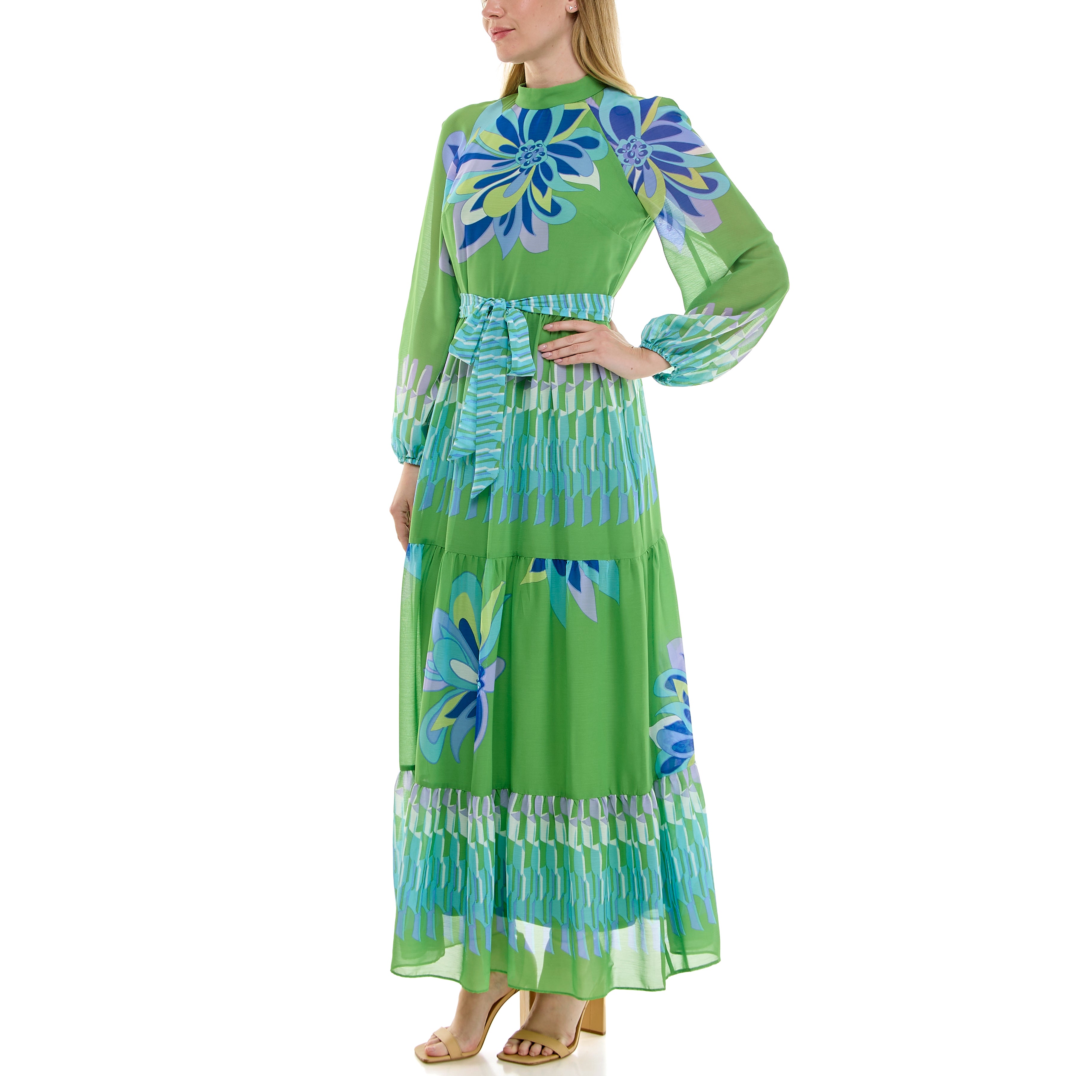 GREEN FLORAL CHIFFON MAXI DRESS – LONG SLEEVE HIGH NECK TIE WAIST TIERED ELEGANT DRESS