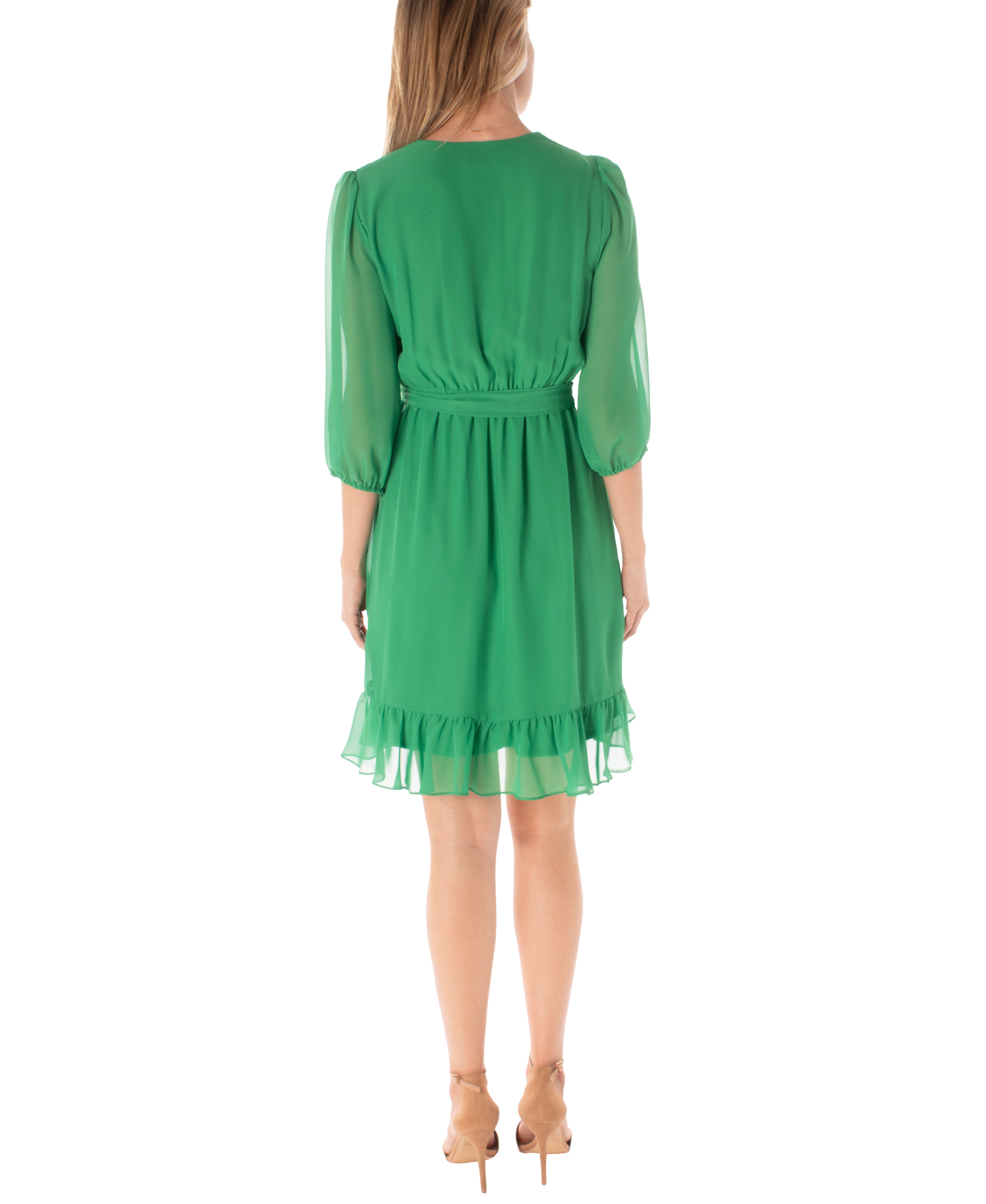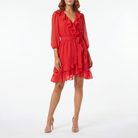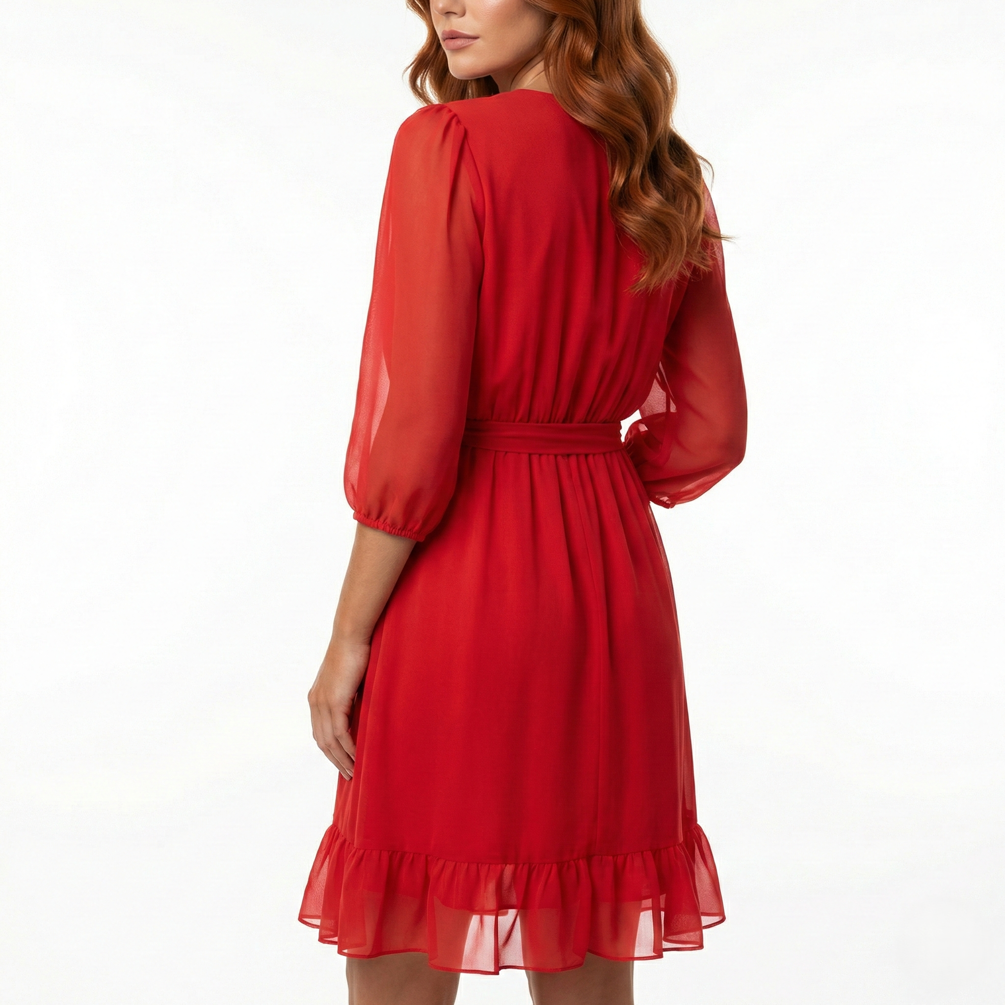RED RUFFLE WRAP MINI DRESS – LONG SLEEVE V-NECK TIE WAIST CHIFFON PARTY DRESS
