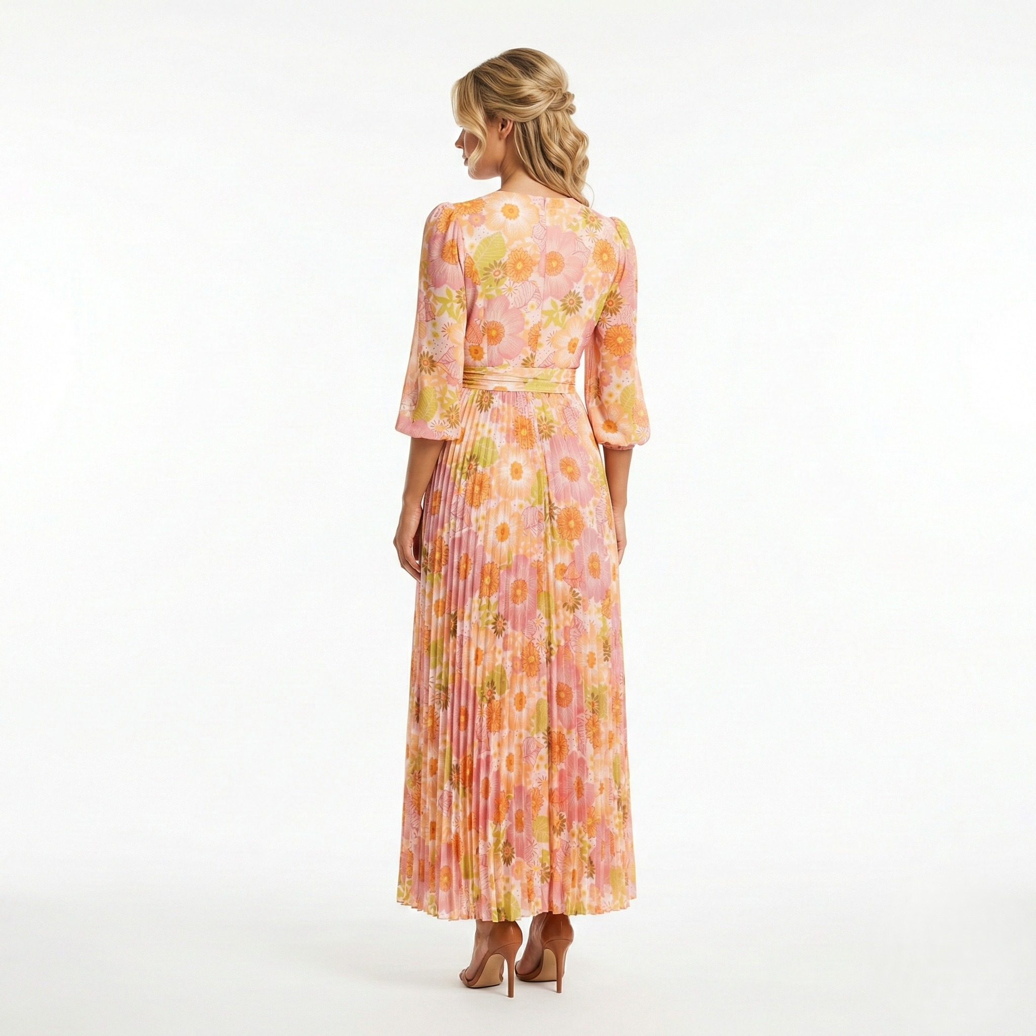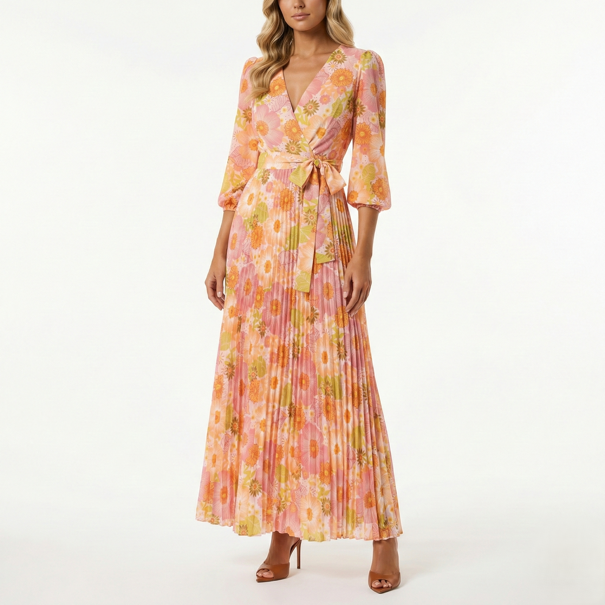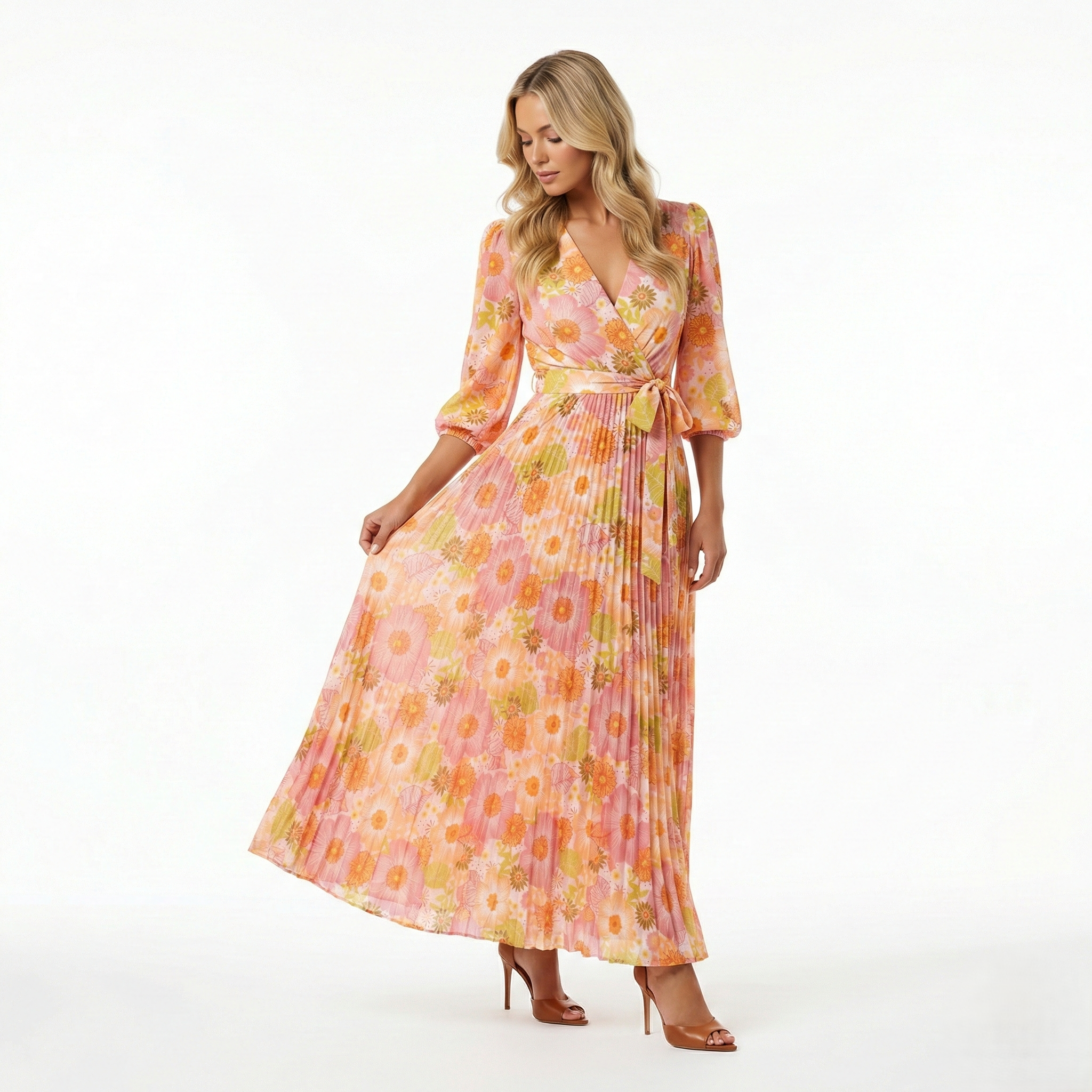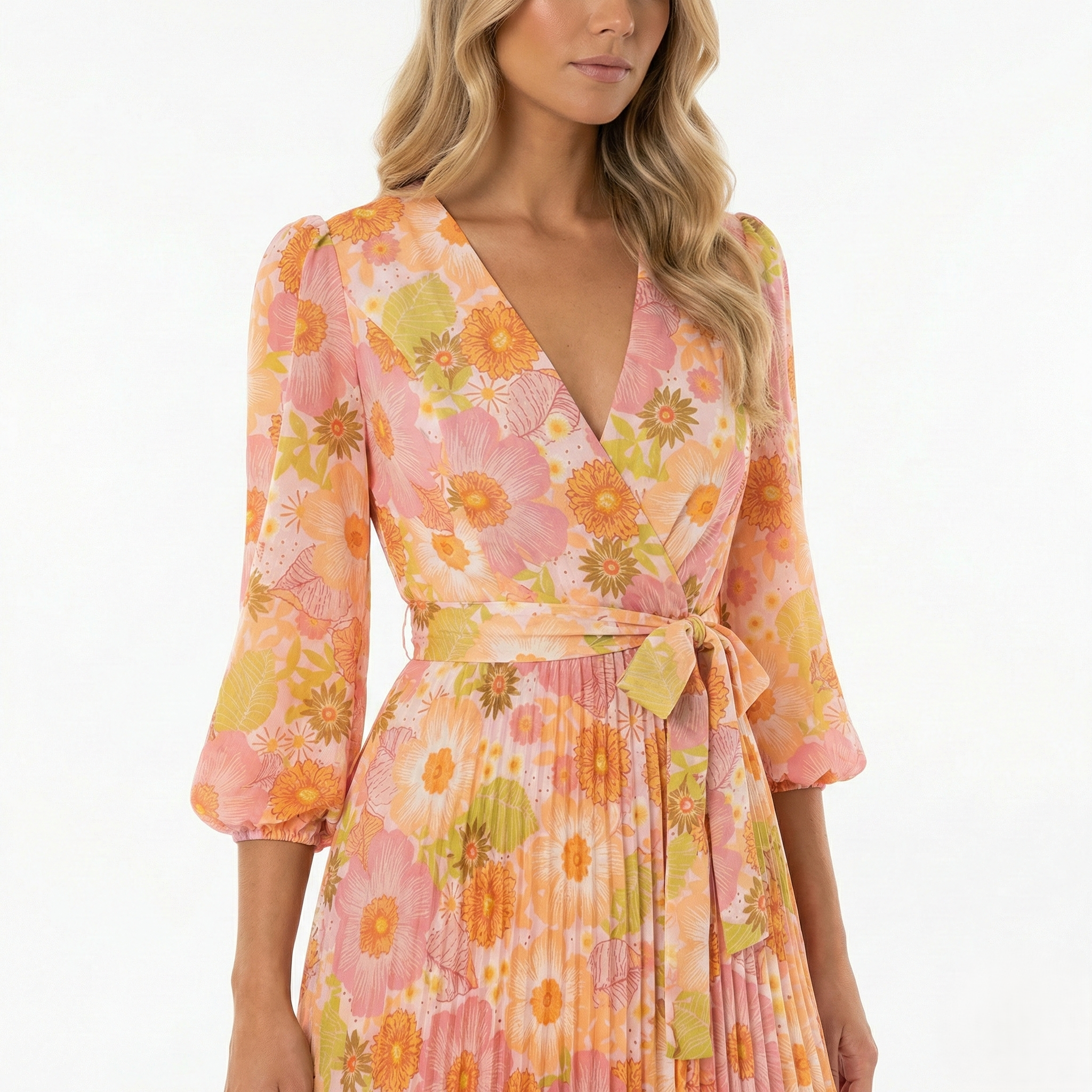 PEACH FLORAL PLEATED MIDI DRESS-LONG SLEEVE V-NECK WRAP TIE WAIST DRESS