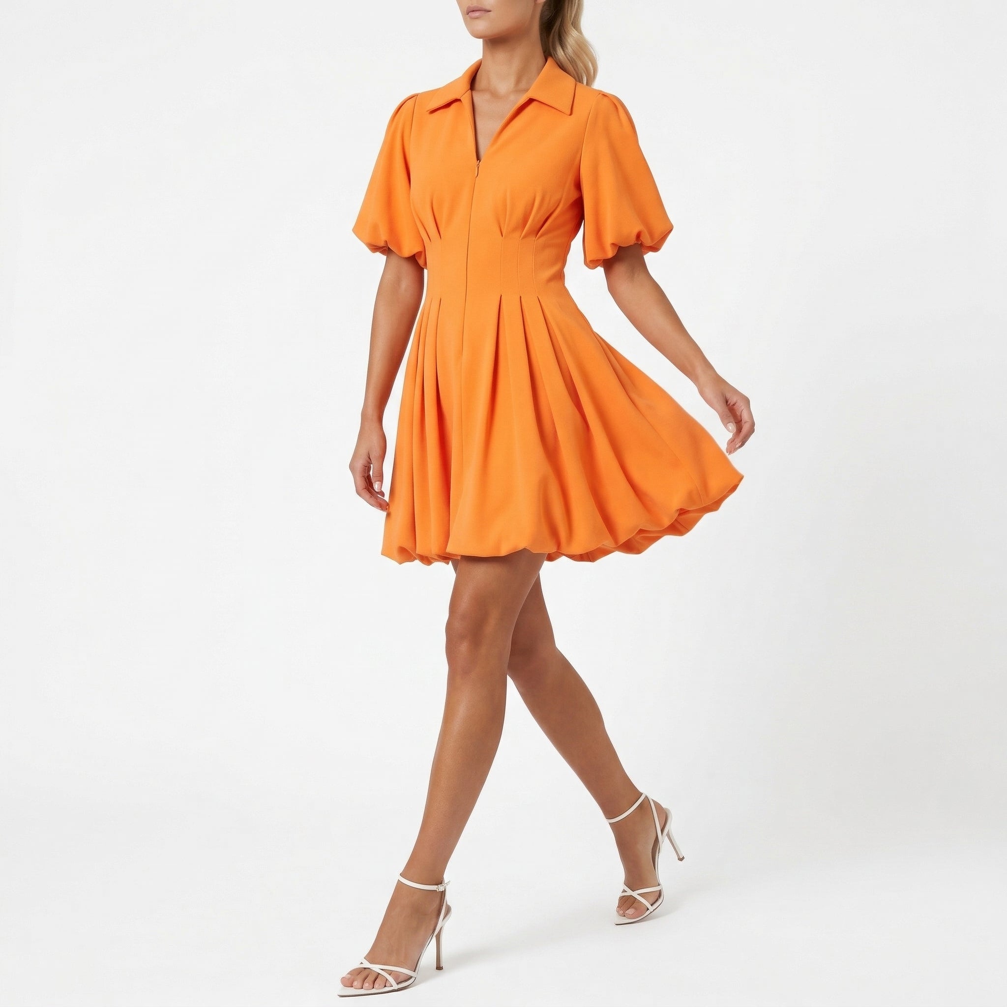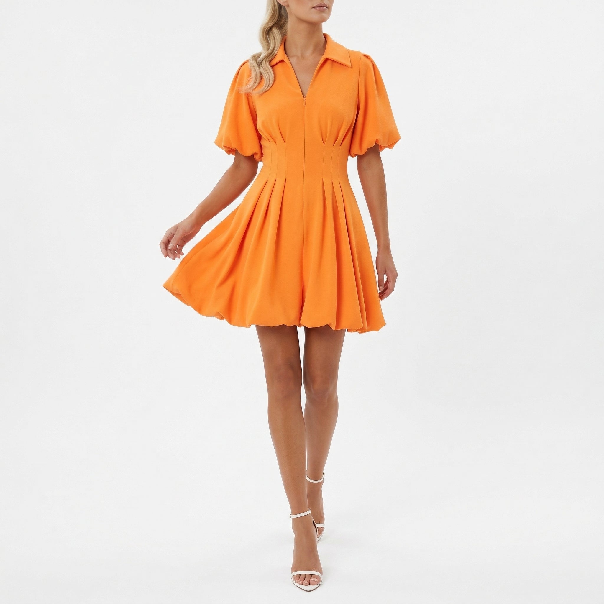 BRIGHT ORANGE COLLARED FIT AND FLARE SHORT SLEEVE PLEATED A-LINE DRESS WITH FRONT ZIP