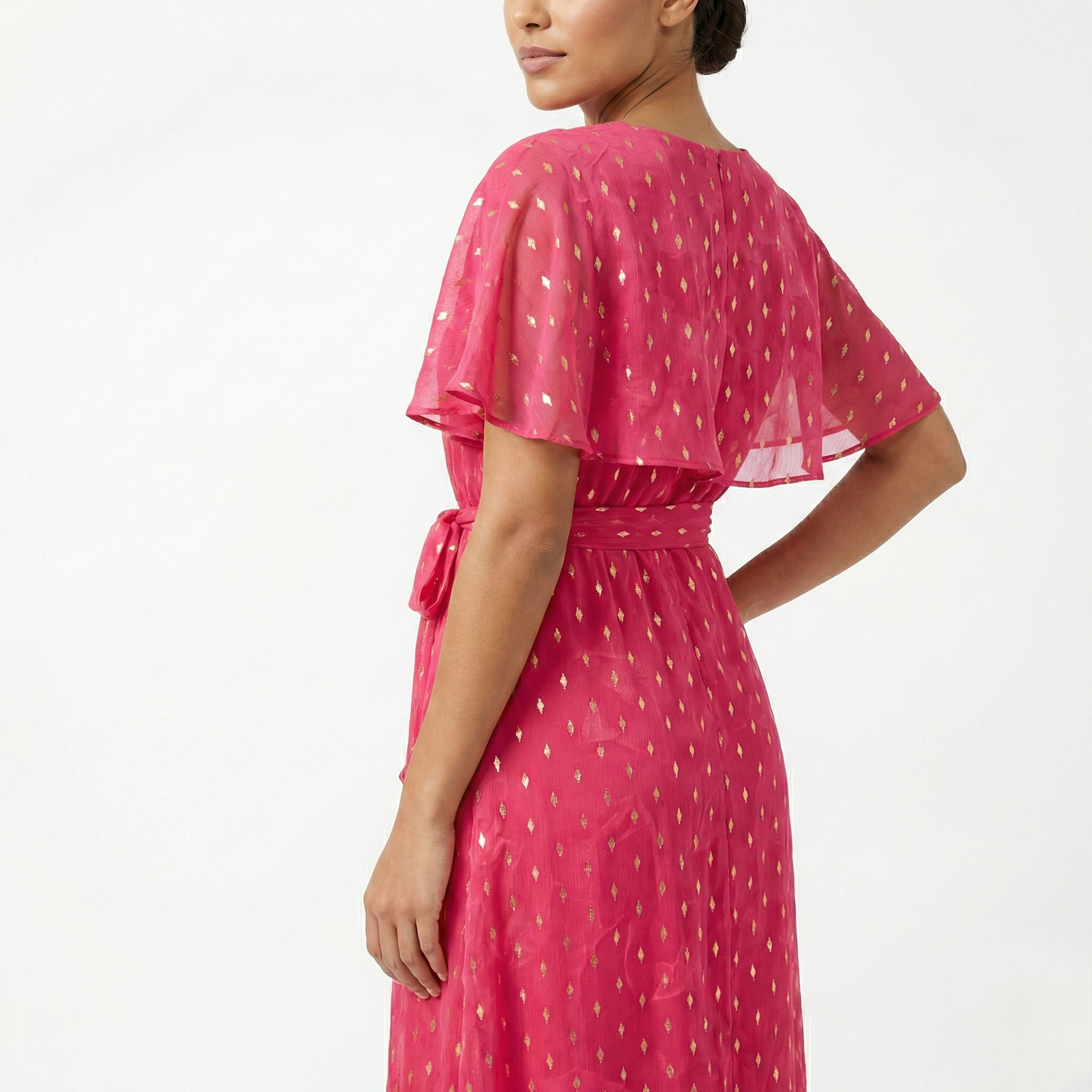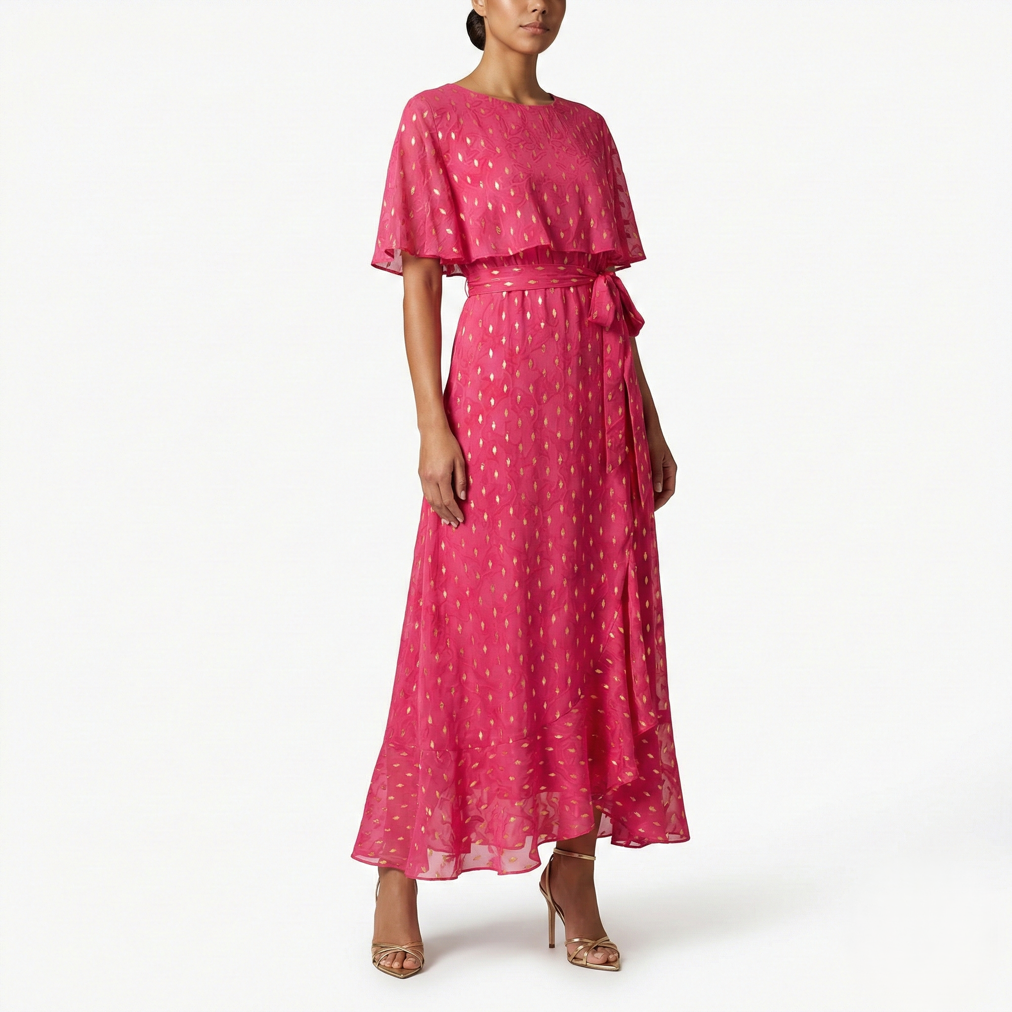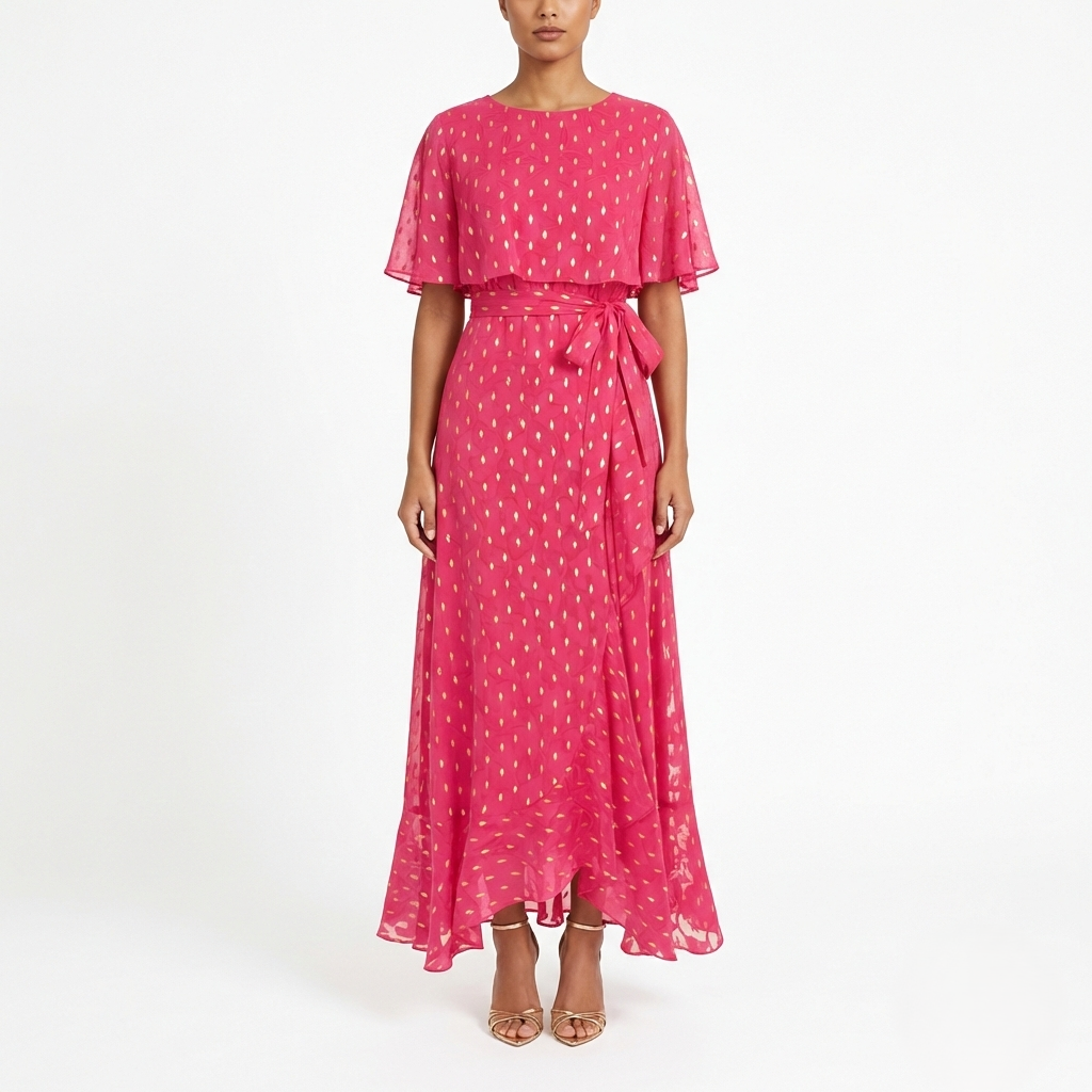 FUCHSIA GOLD FOIL MAXI DRESS – CAPE SLEEVE TIE WAIST ELEGANT OCCASION DRESS