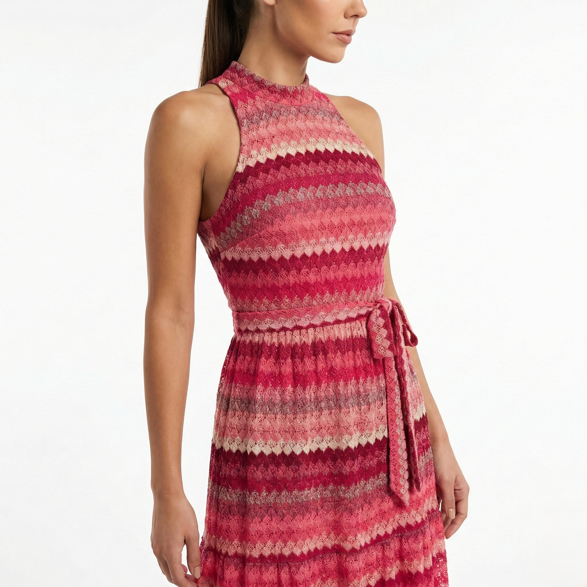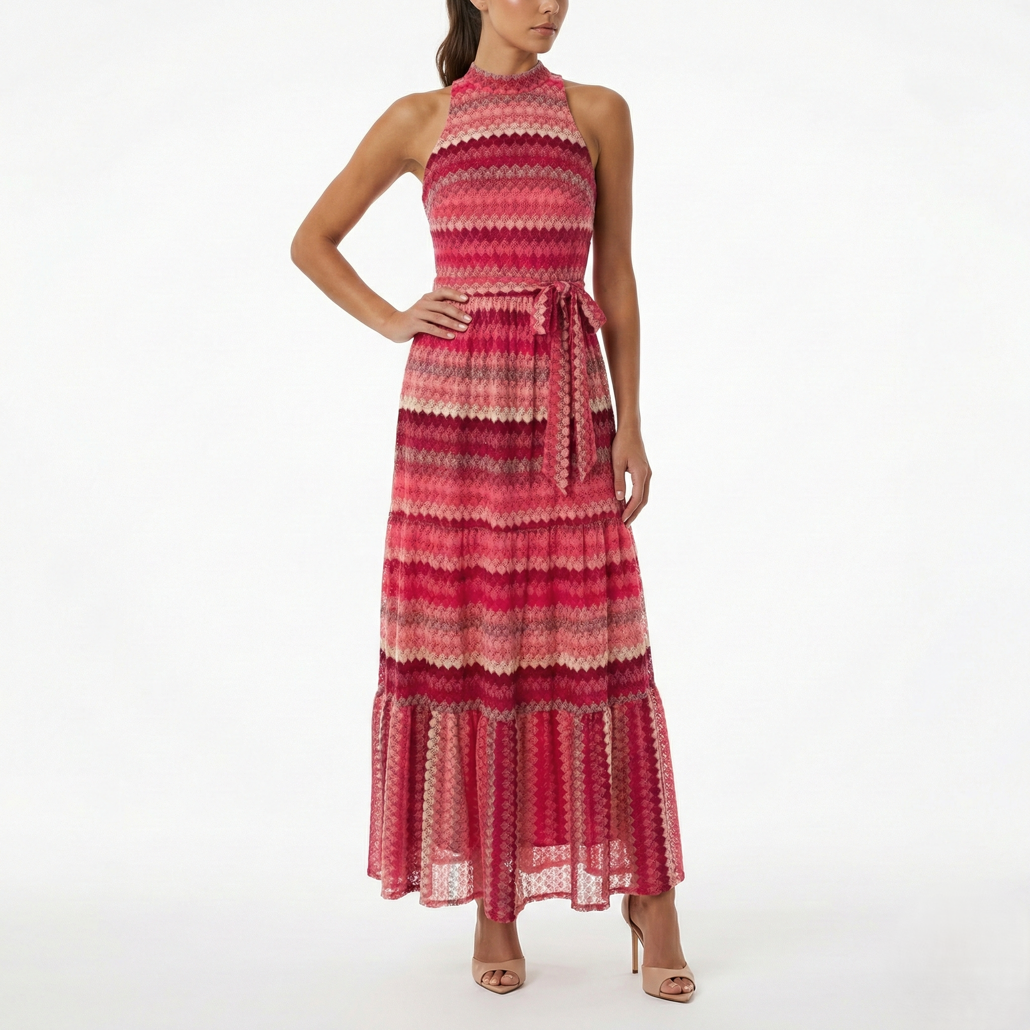 RED OMBRE LACE MAXI DRESS – SLEEVELESS HIGH NECK TIE WAIST BOHO DRESS